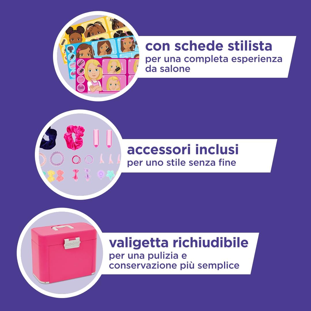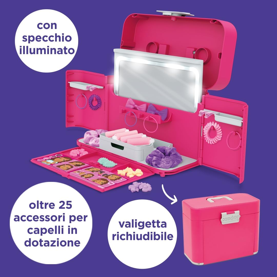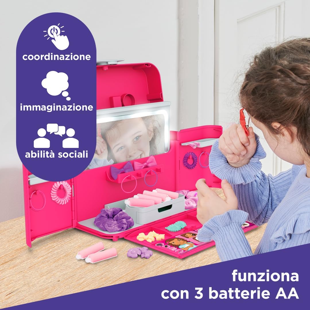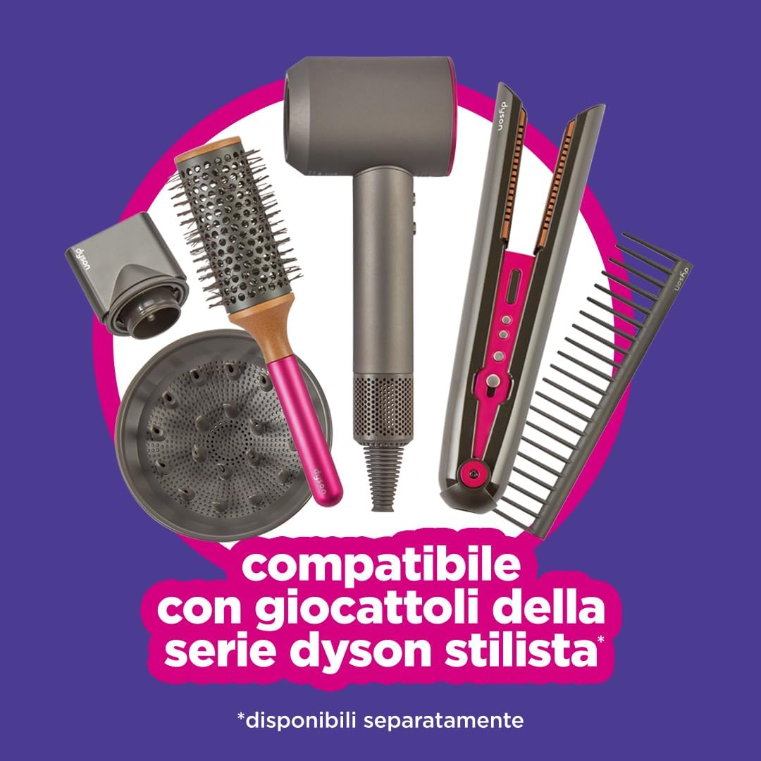 COME DAL PARRUCCHIERE - La custodia Ultimate Styling ha tutto ciò di cui hai bisogno per ispirare stilisti in erba e futuri parrucchieri. Compatibile con i set da gioco Dyson Styling di Cadson (venduti separatamente) SCATENA LA TUA CREATIVITÀ - Scegli uno stile dal libretto, apri lo specchio illuminato e inizia a utilizzare tutti gli accessori per creare molteplici look. Quanto può essere creativo il tuo piccolo? PIÙ DI UN SEMPLICE GIOCO - Questo set da gioco consentirà ai bambini di esplorare e sviluppare il loro lato creativo aiutandoli a sviluppare la coordinazione, le capacità motorie e le abilità sociali, il tutto divertendosi. INCLUDE - Una custodia pieghevole con specchio illuminato incorporato, carte per lo styling fronte-retro e oltre 25 accessori per capelli tra cui fermagli, elastici, fiocchi e altro ancora. Sono necessarie 3 pile AAA ETÀ - Non adatto a bambini di età inferiore a 3 anni