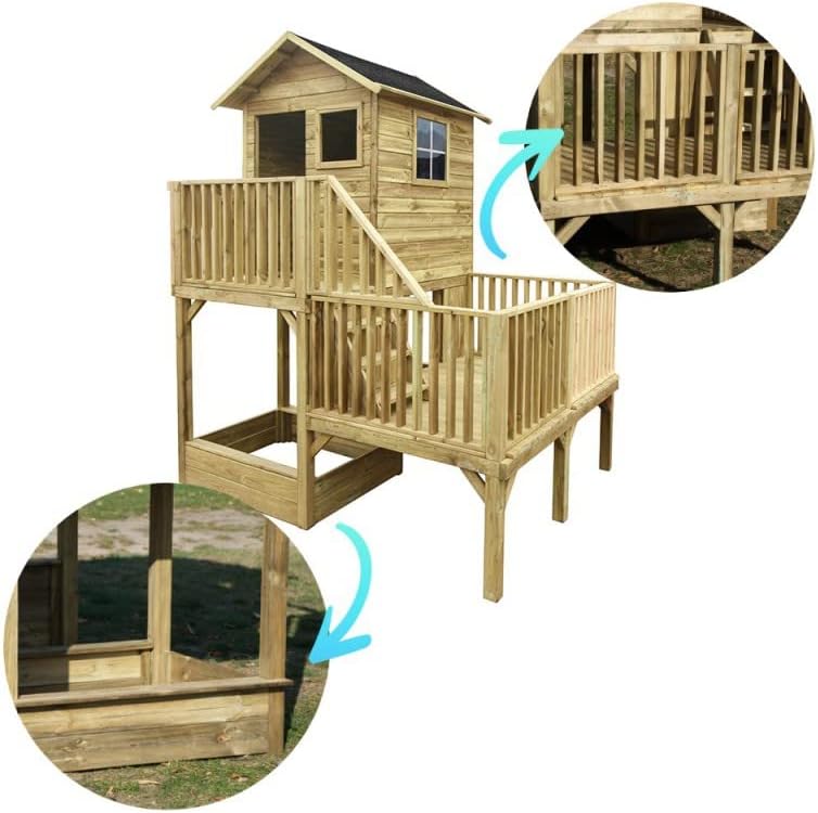 Casetta in legno trattato in autoclave, resistente nel tempo e agli agenti atmosferici Dimensioni complessive: 226,5x176x272 cm; dimensioni base: 176x273 cm Dotata di tetto impermeabile in feltro, pavimento incluso e pareti da 12/19 mm Composta da due balconi collegati da una scaletta, con scivolo e sabbiera inclusi Presenta porta d’ingresso (113 cm di altezza) e due finestre, una con plexiglass Altezza piattaforma: 62 cm da terra (122 cm nel punto più alto) Portata massima: 150 kg (massimo 50 kg per singolo bambino)