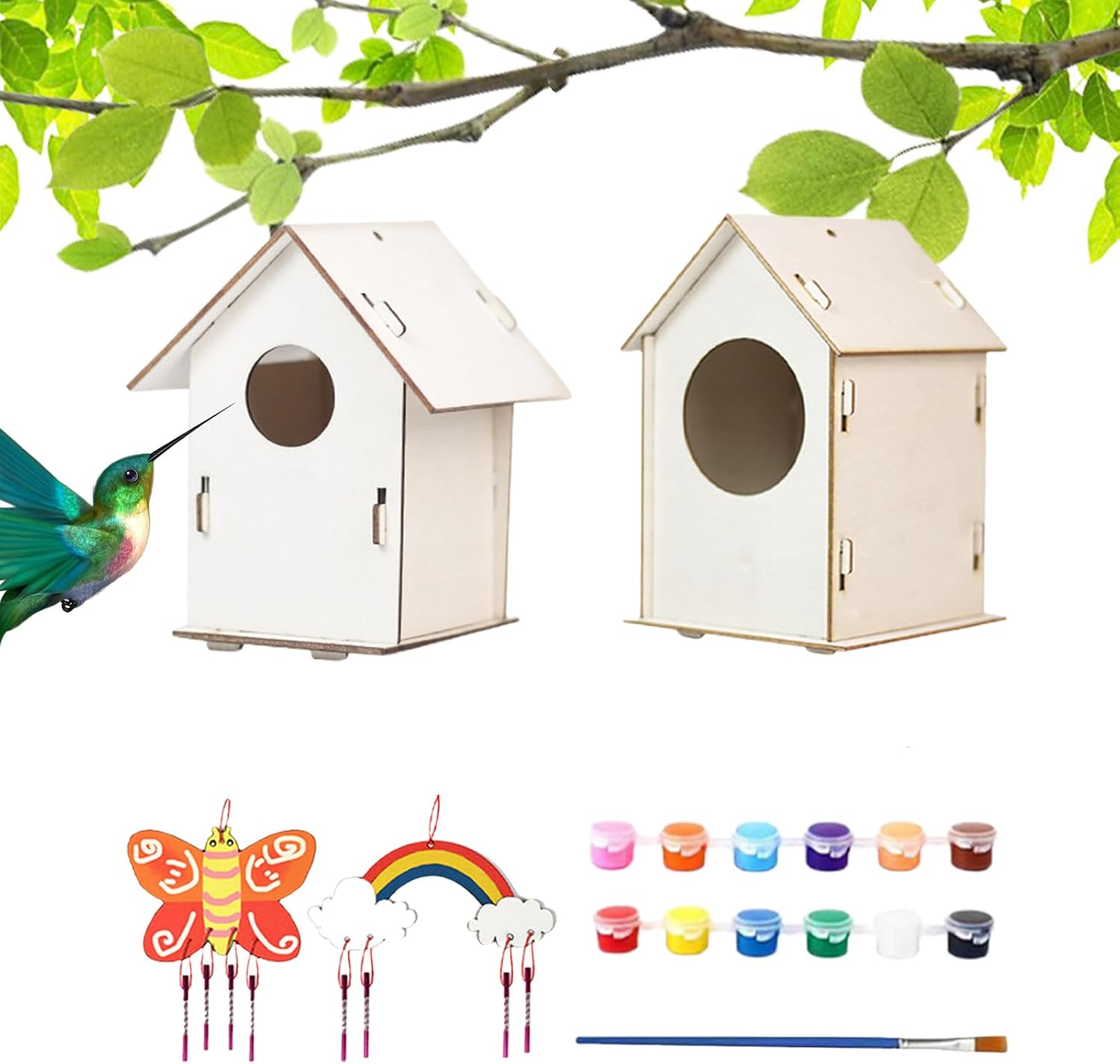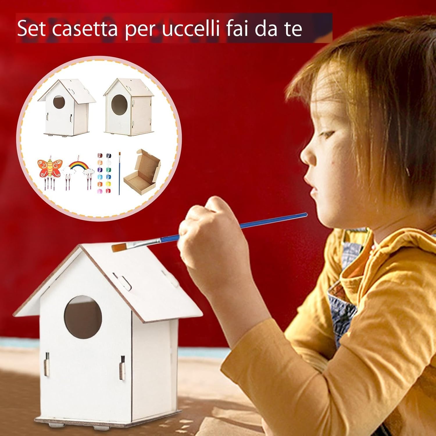 Arricchire la creatività: coltivare le capacità artistiche con una divertente attività artigianale. 2 casette per gli uccelli in legno, 12 colori di vernice e 1 pennello per creare capolavori unici. Il modo per far emergere una straordinaria immaginazione. Installazione semplice, rifugio robusto: assicurati un rifugio sicuro per i tuoi amici pennuti con questa casetta per uccelli resistente alle intemperie realizzata in legno resistente. La creazione di questo robusto rifugio è semplice e fornisce una protezione duratura. Connessione con la natura: costruisci una casetta per gli uccelli con tuo figlio e connettiti con la natura. Migliora la loro creatività, pazienza e abilità pratica approfondendo la loro comprensione e il con l'ambiente attraverso l'intrattenimento educativo. Alloggio per tutti gli uccelli: con un habitat accogliente e confortevole progettato per uccelli di tutte le dimensioni, questa casetta per uccelli è perfetta per progetti artistici e artigianali fantasiosi. Per gli amanti degli uccelli: goditi le meraviglie della natura con questa casetta per uccelli educativa e divertente che è un fantastico regalo di compleanno, vacanza o ringraziamento. per le aule, l'istruzione domestica e l'ornamento di giardini o spazi interni.