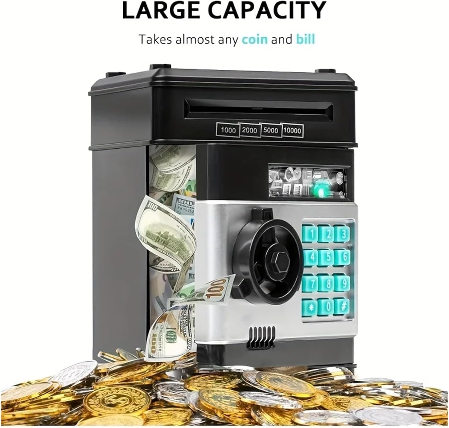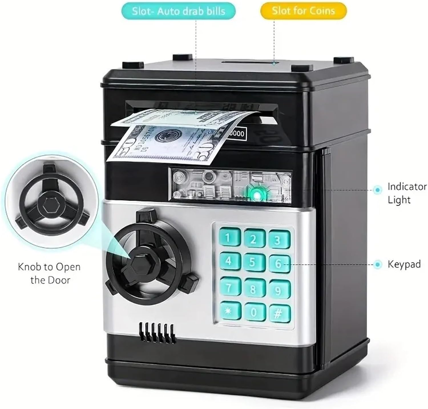 Salvadanaio elettronico: questo innovativo salvadanaio elettronico non è solo un salvadanaio, ma anche un divertente e interattivo insegnante di finanza for i bambini, che li incoraggia a risparmiare i propri soldi in modo oculato. Password Safe Box: dotato di una cassaforte protetta da password, garantisce la sicurezza dei risparmi del tuo bambino, tenendoli nascosti e al sicuro da occhi indiscreti. Salvadanai for bambini: progettato specificamente for i bambini, questo salvadanaio non solo incoraggia le abitudini di risparmio, ma li introduce anche al concetto di utilizzo del bancomat in modo giocoso. Risparmio di denaro con monete digitali: la fessura for monete digitali consente ai bambini di depositare le proprie monete in modo semplice e comodo, rendendo il risparmio di denaro un'esperienza senza problemi. Sportello bancomat con deposito sicuro: lo sportello bancomat integrato consente ai bambini di prelevare il denaro risparmiato, offrendo loro un senso di realizzazione e controllo sulle proprie finanze. Regali for bambini: questo salvadanaio elettronico è un regalo for i bambini, insegnando loro la gestione del denaro fin da piccoli e promuovendo al contempo abitudini di risparmio.