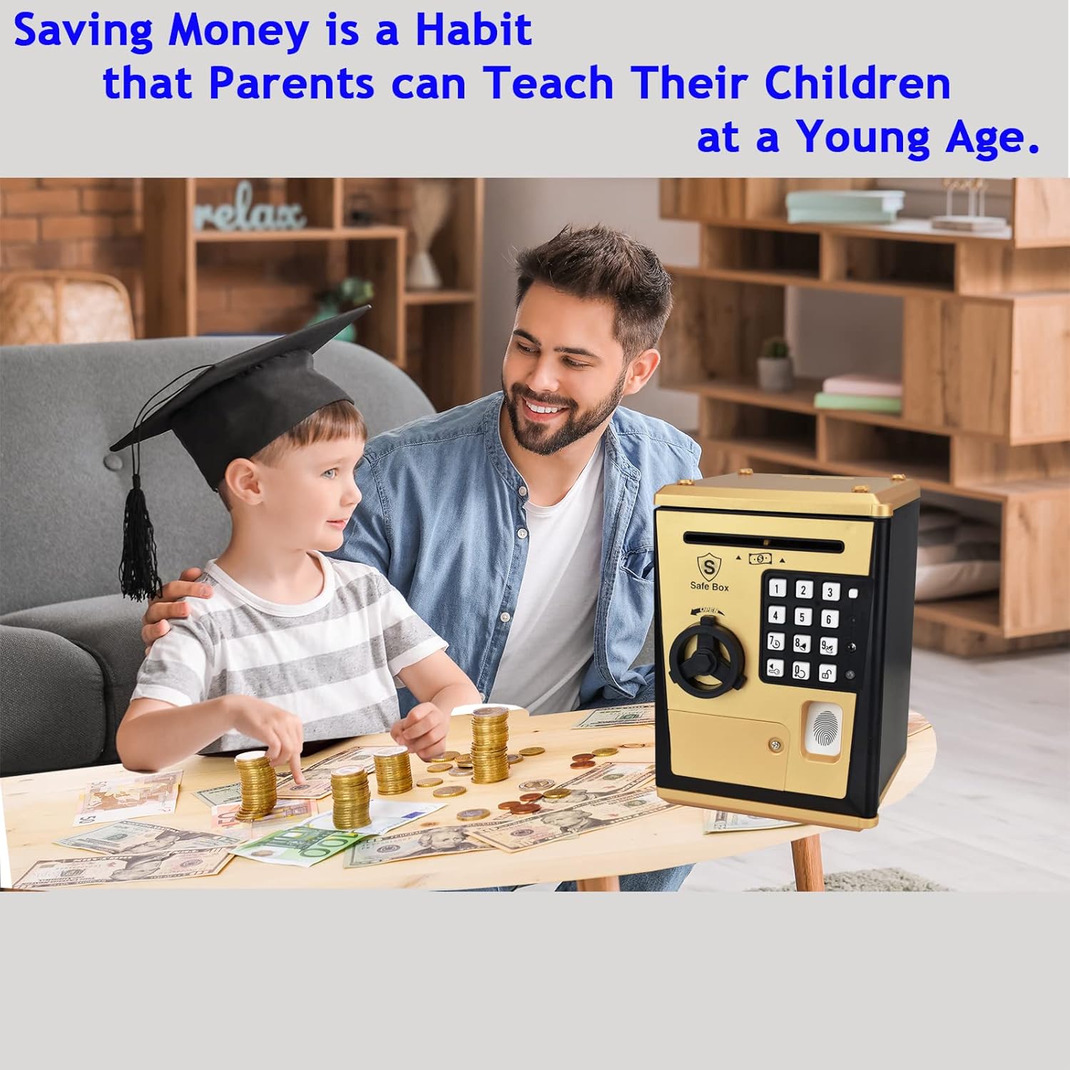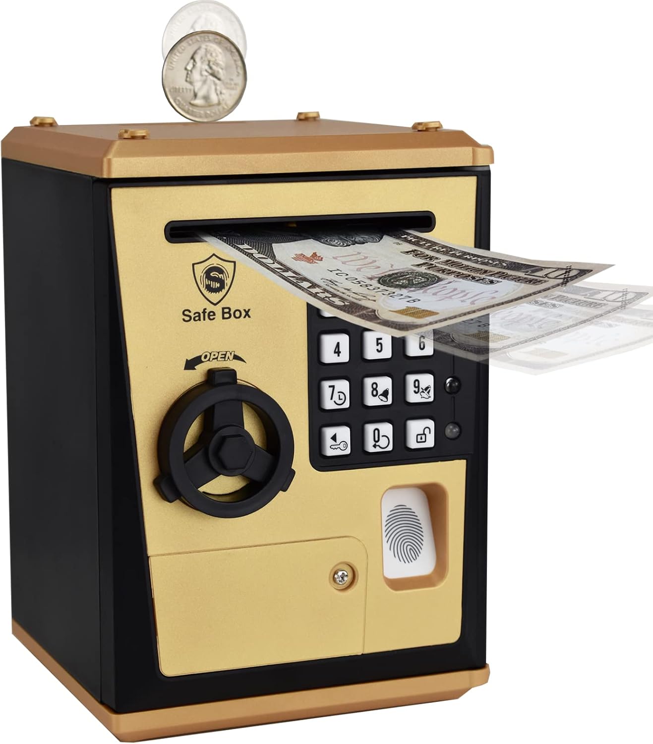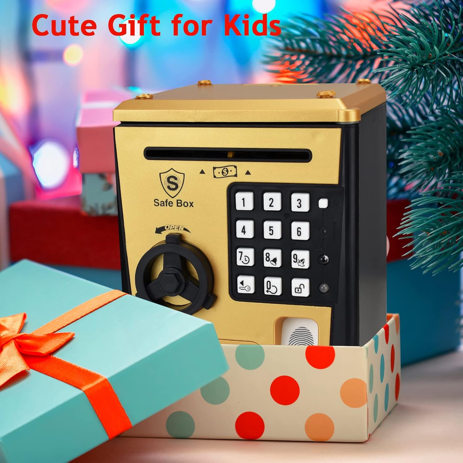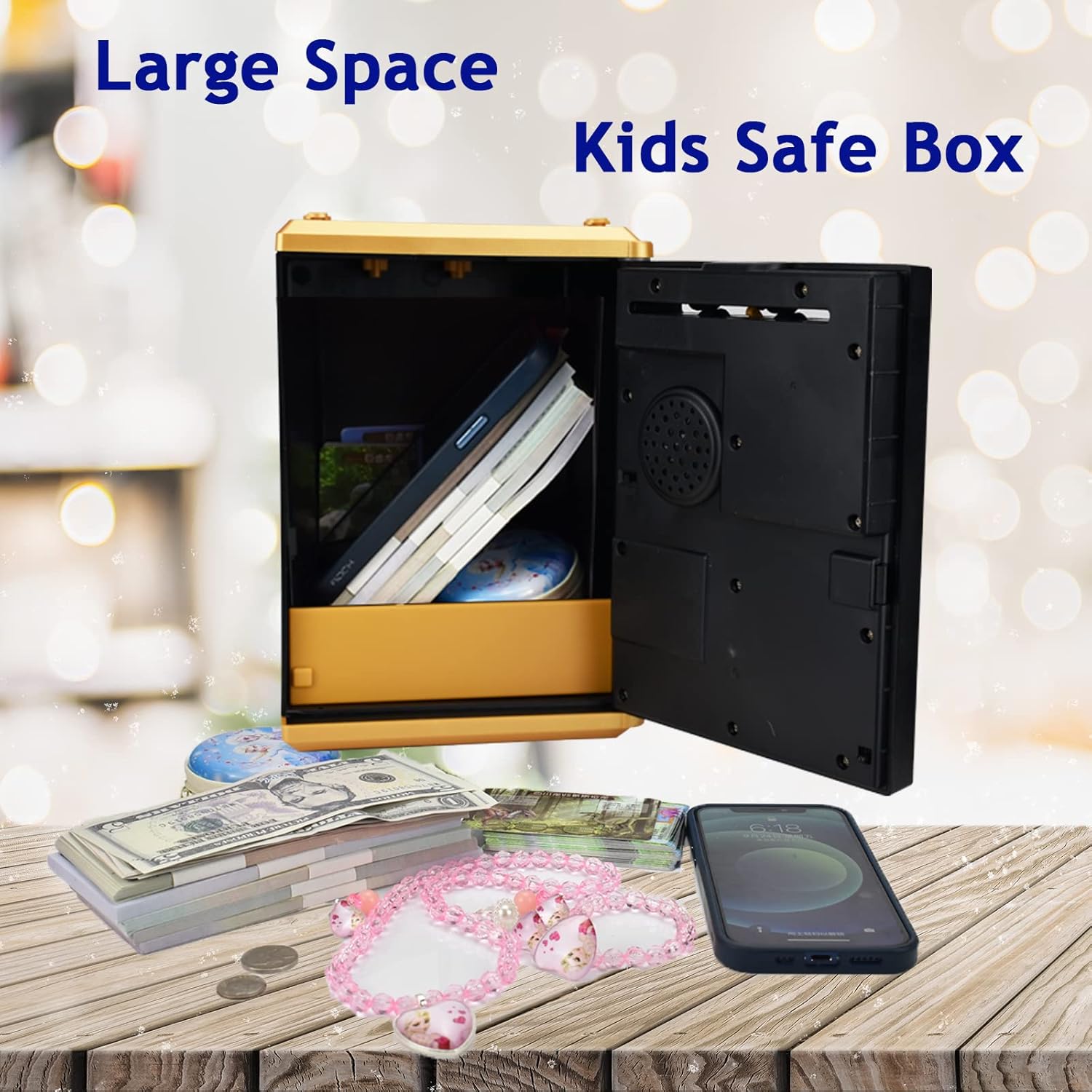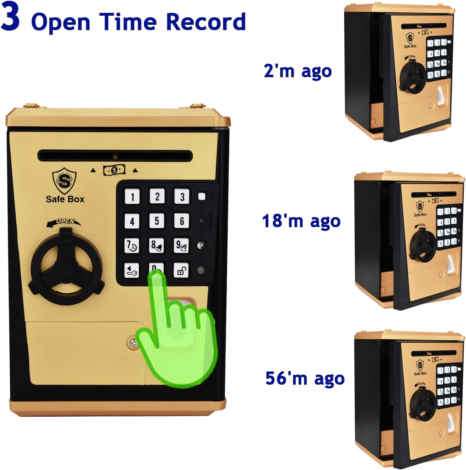 1️⃣Child safe: il nascondiglio crittografato ideale per i tesori dei bambini. Il codice a 4 cifre, che puoi impostare tu stesso, protegge gli oggetti importanti dagli intrusi; 2️⃣Una cassaforte per bambini che sa quando è stata aperta. Puoi vedere le ultime 3 volte che la cassaforte è stata aperta, così puoi capire a colpo d'occhio se qualcun altro ha aperto la cassaforte.; 3️⃣ Salvadanaio con alimentazione automatica delle banconote: le banconote vengono inserite nella fessura delle banconote per attivare l'alimentazione automatica e le monete possono essere inserite attraverso una speciale fessura per le monete; grande capacità, fino a 1000 banconote e 600 monete; 4️⃣Interessante verifica delle impronte digitali: la necessità di verificare le impronte digitali dopo aver inserito la password aumenta il divertimento; 5️⃣Password a 4 cifre: la password a 4 cifre può essere composta da qualsiasi combinazione di numeri da 0 a 9 per aumentare la sicurezza della password; la password iniziale è "0000"; 6️⃣Ampio spazio: per cellulari, agende, ecc. per gli oggetti personali dei bambini; 7️⃣Messaggi vocali: messaggi vocali in inglese oppure puoi passare a nessun messaggio vocale; 8️⃣Manuali multilingue in inglese, spagnolo, tedesco, francese e giapponese.