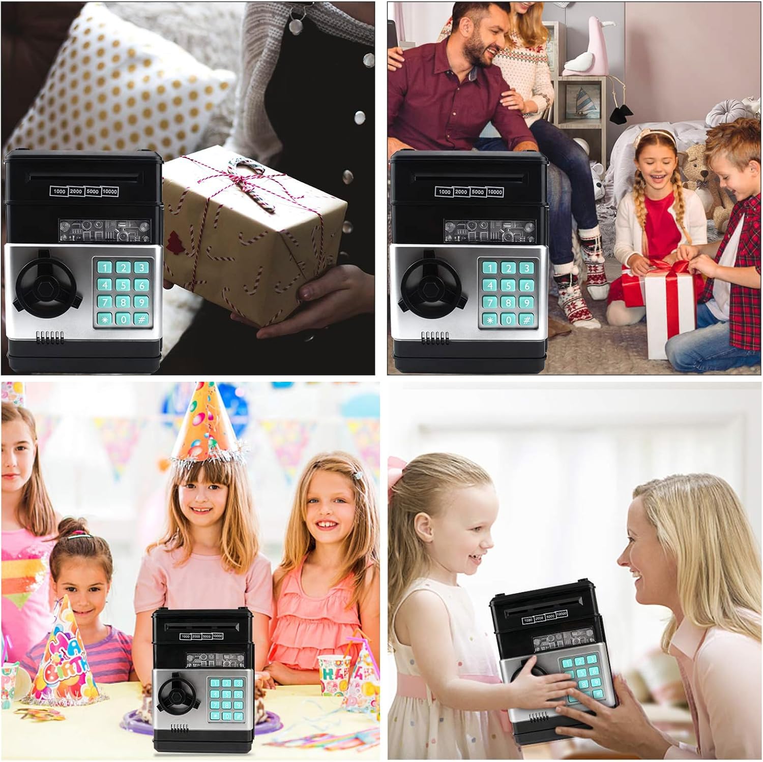 Materiali sicuri e di alta qualità: questa cassaforte per bambini è realizzata con materiali sicuri e molto resistenti come la plastica. Questo materiale è assolutamente inodore, estremamente durevole e resistente ai danni meccanici (comprese le cadute). 【Gestione del denaro per i bambini】: protegge gli effetti personali del bambino, può conservare monete, cartamoneta o altri oggetti importanti, aiuta i tuoi figli a sviluppare una buona abitudine di risparmiare denaro. Insegnare abilità di vita e gestione del denaro in giovane età è un’ottima cosa. 【Facile da usare】: inserisci le monete dalla fessura per monete sulla parte superiore del salvadanaio e quando depositi le banconote, aspira i soldi invece di spingerli semplicemente dentro. Nessuno può aprire la cassaforte senza una password. Il regalo perfetto: questo salvadanaio elettronico per conservare in sicurezza i soldi è perfetto per ogni bambino. Sia i ragazzi che le ragazze si divertiranno a conservare in modo creativo e sicuro i loro risparmi per nuovi giocattoli. La cassaforte sarà il regalo perfetto per compleanno, Capodanno, Festa dei bambini, Natale, Natale, Halloween e molte altre occasioni speciali per bambini. 【Elevata capacità di archiviazione】 Il salvadanaio ATM può contenere 600 monete o 100 banconote. Può proteggere gli effetti personali del bambino o riporre altri oggetti importanti. Molto facile da usare e i bambini adoreranno questo pratico salvadanaio.