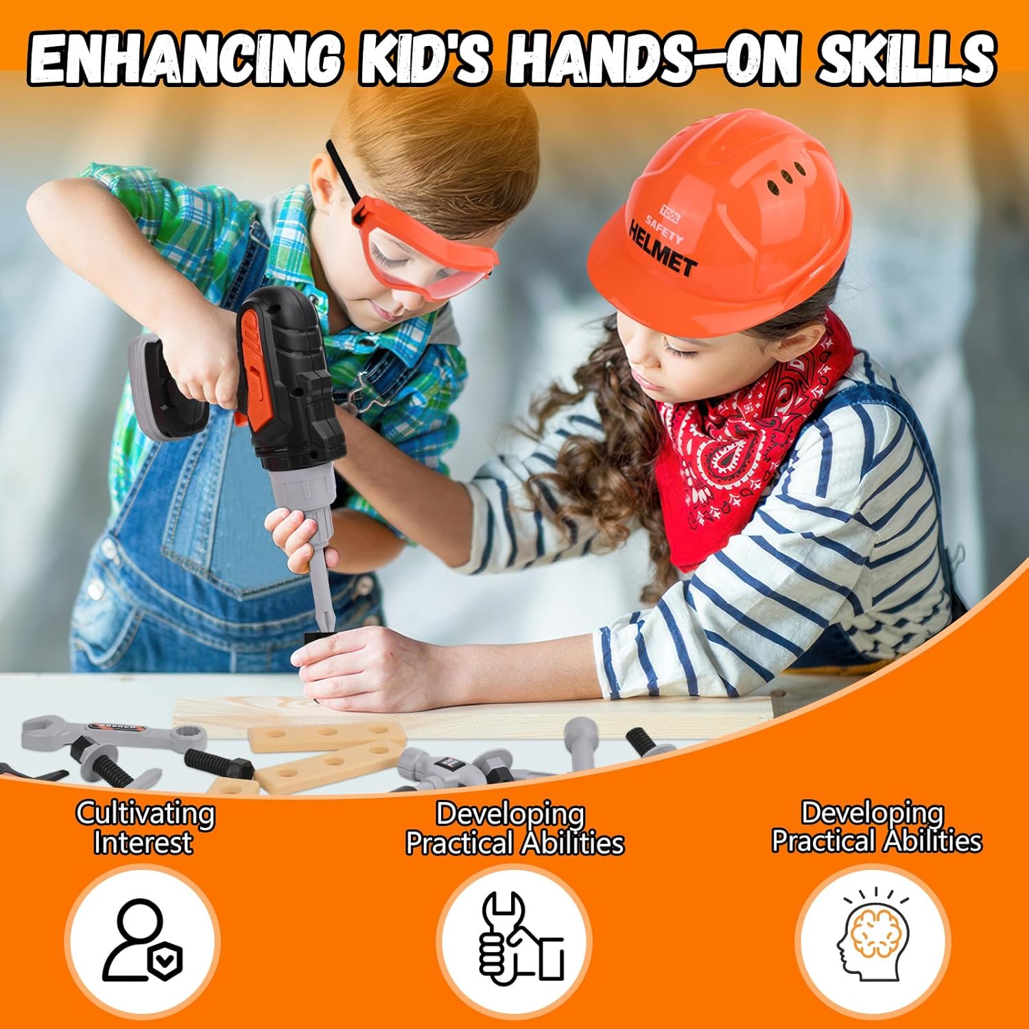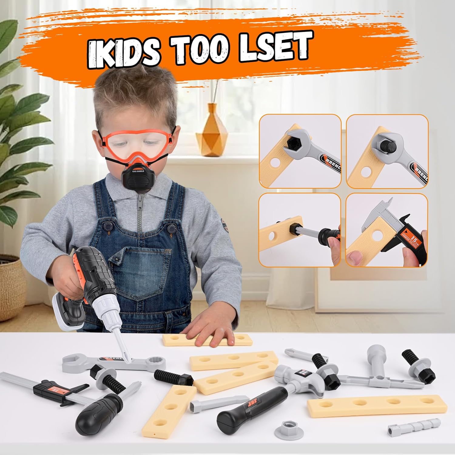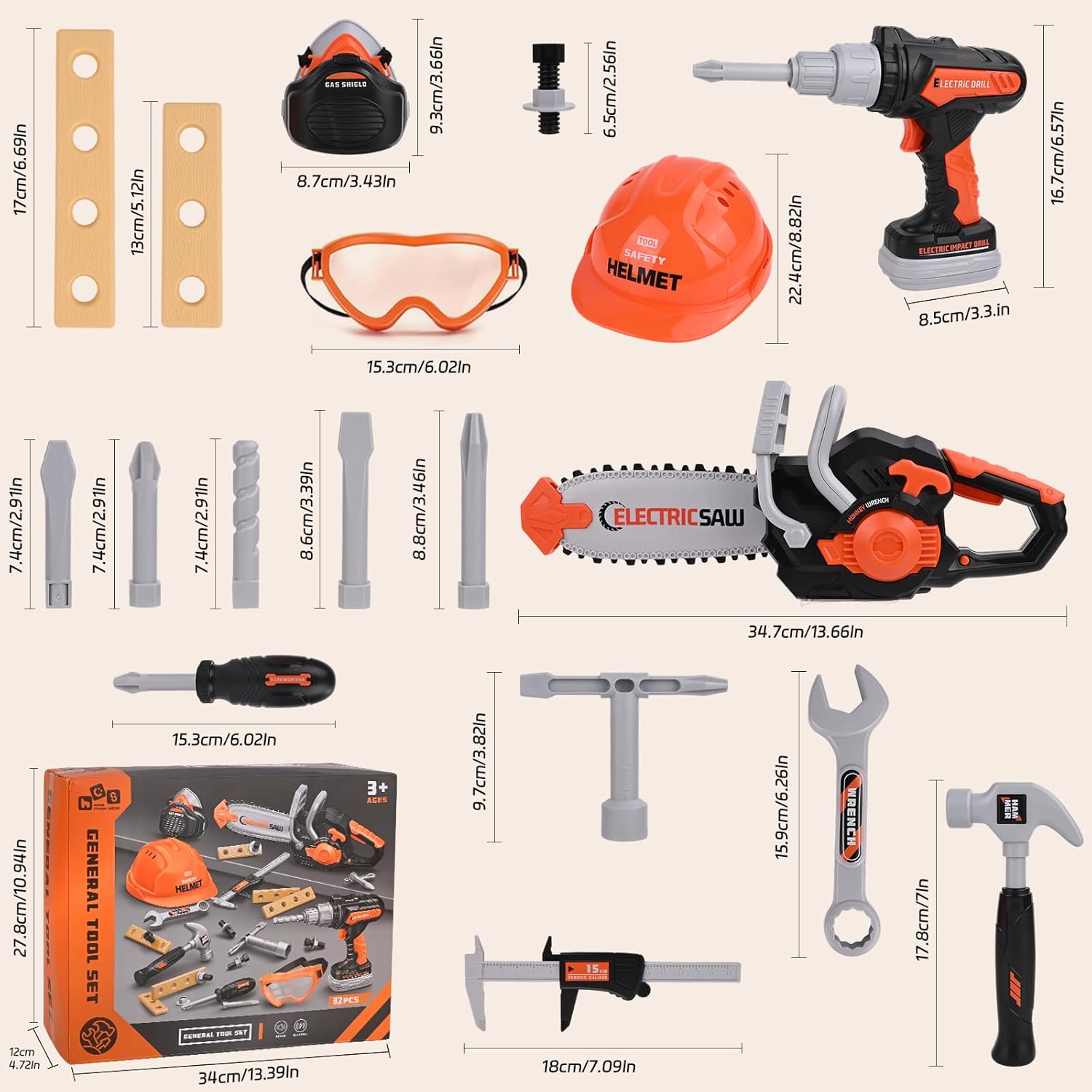 【Gioco di riparazione】 Set di utensili educativi per bambini: Questa cassetta degli attrezzi mira a stimolare la creatività e sviluppare le competenze di base attraverso scenari di costruzione ludici. È un giocattolo eccellente per bambini e bambine di 3, 4, 5 e 6 anni. 【Esperienza realistica con gli attrezzi】 Il set di utensili per bambini da 32 pezzi include una sega, un trapano (con tre punte intercambiabili), un casco di sicurezza, occhiali protettivi, una maschera, 2 chiavi inglesi, un cacciavite, un martello, listelli di plastica, viti e dadi, un calibro misurabile e un set completo di utensili. I bambini possono ricreare un cantiere edile realistico e imparare tutto sugli attrezzi attraverso il gioco di ruolo. 【Design sicuro】 Tutti gli utensili per bambini sono realizzati in robusta plastica ABS con bordi levigati e lisci. Adatto a bambini dai 3 anni in su. Il vano batteria è fissato con viti per prevenirne l'apertura facile. Avvitare, segare e costruire in sicurezza promuove la coordinazione occhio-mano e le abilità motorie fini. 【Vari accessori fai-da-te】 La cassetta degli attrezzi per bambini include viti, chiodi, dadi e listelli di plastica: perfetti per insegnare ai bambini le basi della meccanica, creare le loro opere creative e costruire la fiducia in se stessi. 【Regalo perfetto】 Che sia per un compleanno o per una festa, questo set di utensili giocattolo è il regalo ideale per i piccoli costruttori. Stimola la creatività e offre opportunità di apprendimento divertenti. Un regalo adatto per bambini e bambine di 3, 4, 5 e 6 anni.