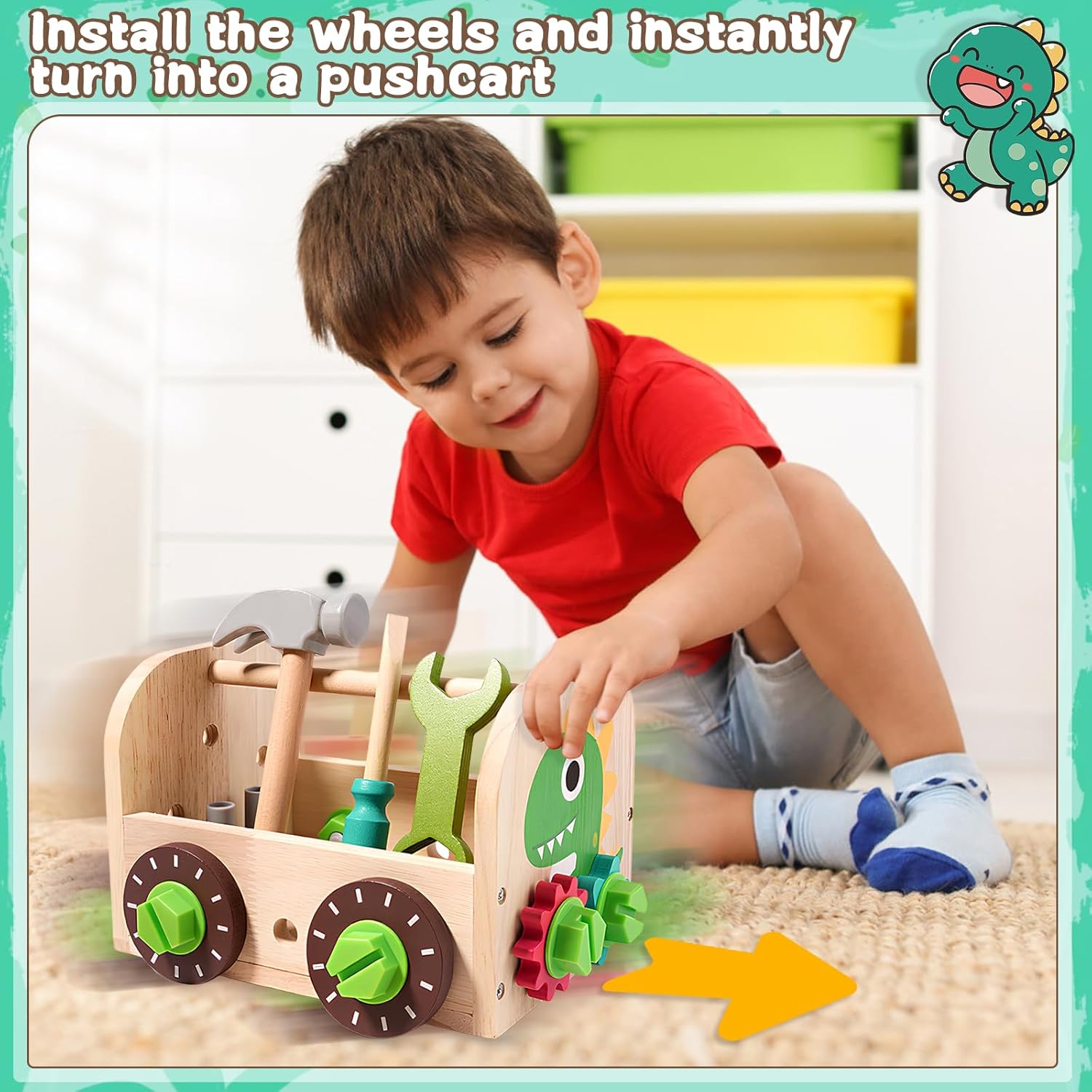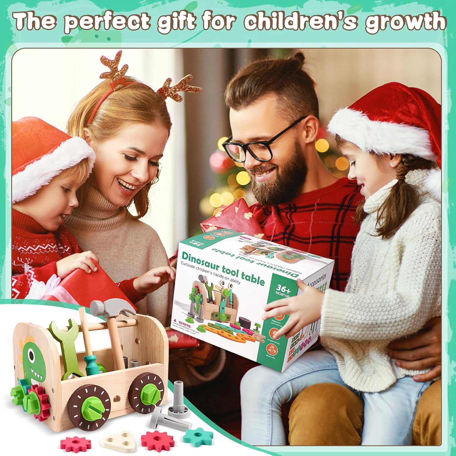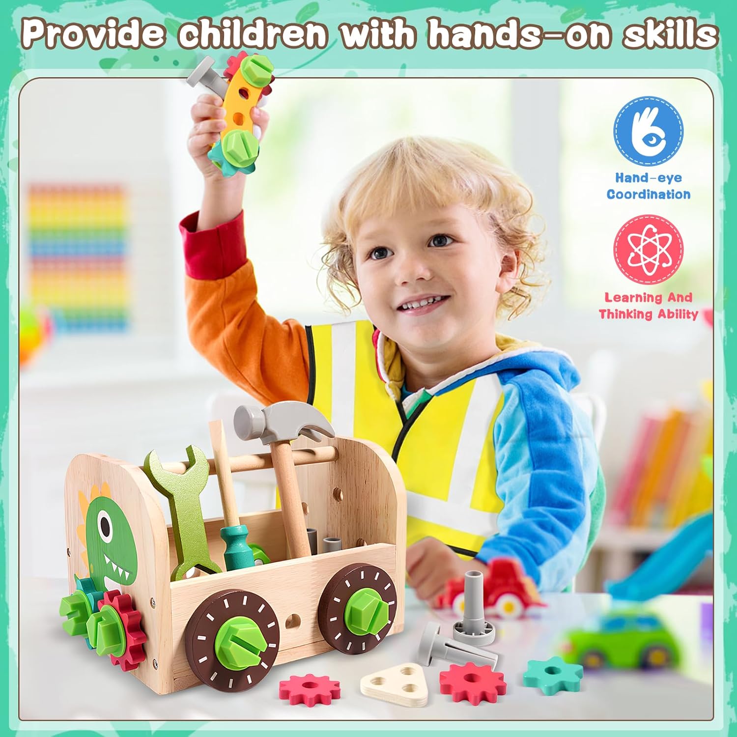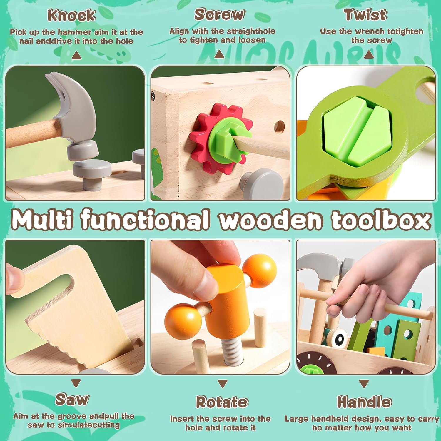 Set di Attrezzi da 41 Pezzi: Questo set comprende un banco da lavoro, attrezzi manuali realistici come cacciaviti, martelli e chiavi inglesi, oltre a vestiti da ingegnere per un gioco di ruolo fantasioso. Con accessori versatili come viti, ingranaggi e dadi, il bambino può costruire forme emozionanti come automobili, aeroplani e fiori. Ottimo per ore di gioco creativo Materiale Sicuro: Realizzato in legno robusto e completato da plastica ABS resistente, questo attrezzo per dinosauri è costruito per un divertimento duraturo. Ogni utensile è dotato di bordi lisci e arrotondati, per garantire la protezione della pelle delicata durante il gioco, e le dimensioni sono adatte alle piccole mani, per una presa sicura e confortevole Design Ingegnoso: La scatola di legno si trasforma in un funzionale banco da lavoro, completo di maniglia per una facile trasportabilità. Il design a tema dinosauri aggiunge un tocco giocoso che ispira ore di avventura. Insegnate al vostro bambino il valore dell'organizzazione quando usa la scatola per riporre ordinatamente gli attrezzi dopo il gioco Sviluppo Delle Competenze: Con strumenti come la sega a mano e gli ingranaggi, i bambini possono imparare tecniche essenziali come la torsione, la rotazione e la battitura, che rappresentano una porta d'accesso all'apprendimento pratico e alla costruzione di abilità, sviluppando le capacità di risoluzione dei problemi, la coordinazione motoria e il pensiero creativo Regali Straordinari: Il tavolo degli attrezzi Dinosauro è un regalo ideale per compleanni, festività o ricorrenze. Il suo design vivace, il valore educativo e le possibilità di gioco di ruolo affascinano sia i bambini che i genitori. Guardate come il vostro bambino si trasforma in un giovane ingegnere, stimolando la sua immaginazione e la sua curiosità. (Note: non adatto a bambini di età inferiore a 3 anni)