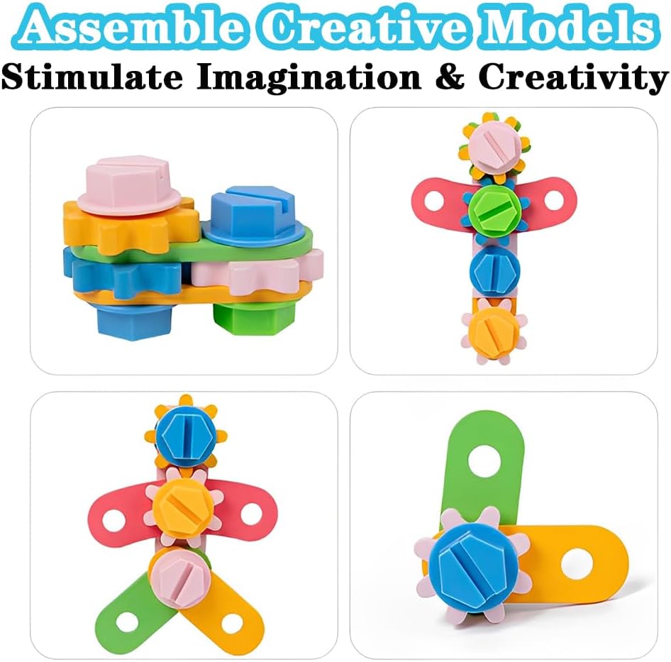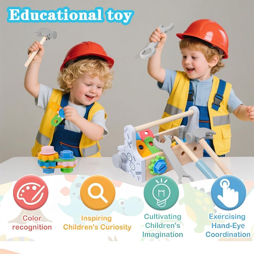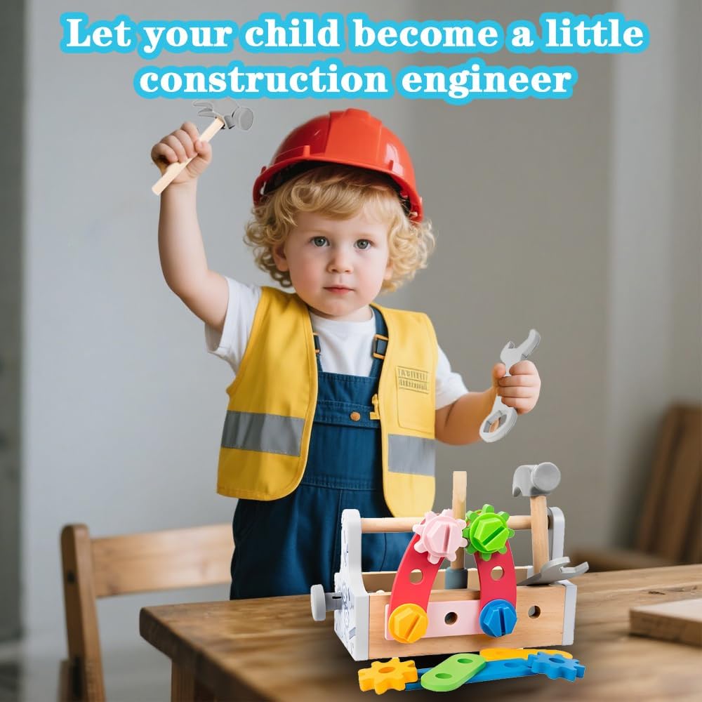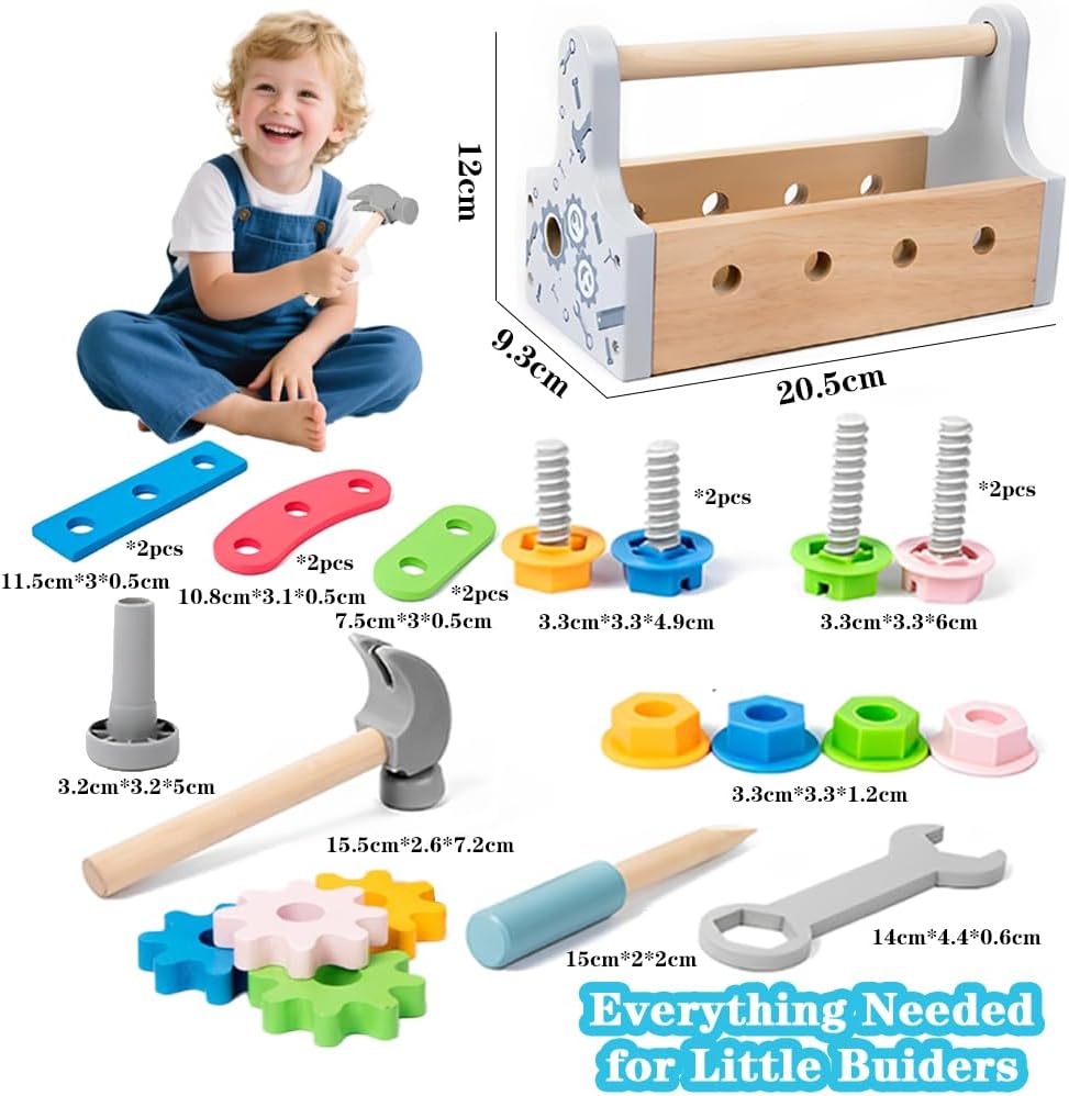 Kit di attrezzi per giochi di finzione: Questo kit di attrezzi per bambini piccoli include una cassetta degli attrezzi in legno, una chiave inglese, un martello, un cacciavite, quattro ingranaggi, quattro viti, quattro dadi e sei accessori perforati. I colori vivaci e la varietà di attrezzi in legno intratterranno i vostri piccoli con questi giocattoli da costruzione per giochi di ruolo. Giocattoli STEM Montessori: I bambini possono usare il cacciavite per avvitare le viti, il martello per piantare i chiodi e la chiave inglese per costruire vari modelli interessanti. Possono creare fiori, cani, aeroplani, automobili e altre forme creative, stimolando l'immaginazione e migliorando le capacità motorie fini, la coordinazione occhio-mano e le capacità di risoluzione dei problemi. Giocattoli da costruzione sicuri e divertenti: Abbiamo utilizzato materiali di alta qualità durante la produzione perché sappiamo che volete solo il meglio per i vostri bambini. Questo giocattolo da costruzione è realizzato in legno massello di alta qualità con bordi lisci ed è della giusta dimensione per essere utilizzato dai bambini. Il kit di attrezzi con utensili di dimensioni adeguate è facile da impugnare e con cui giocare per i bambini. Migliora l'intimità tra genitori e figli: Questo giocattolo da costruzione è un'attività perfetta per i genitori che vogliono divertirsi con i propri figli, incoraggiando l'interazione e la partecipazione alla loro crescita. Inoltre, incoraggia i bambini a riordinare i loro giocattoli nella scatola dopo aver giocato, migliorando le loro capacità di conservazione e gestione e regalando ai genitori una casa pulita e ordinata. Il regalo perfetto per bambini e bambine: Confezionato in una bellissima cassetta degli attrezzi in legno, questo set è il regalo perfetto per i più piccoli in occasione di compleanni, Ringraziamento, Natale, Capodanno e altre festività e occasioni speciali. Progettato per bambini dai 2 ai 5 anni, questo resistente giocattolo in legno favorisce l'interazione tra genitori e figli e offre divertimento senza fine e intrattenimento educativo sia per i bambini che per le bambine.