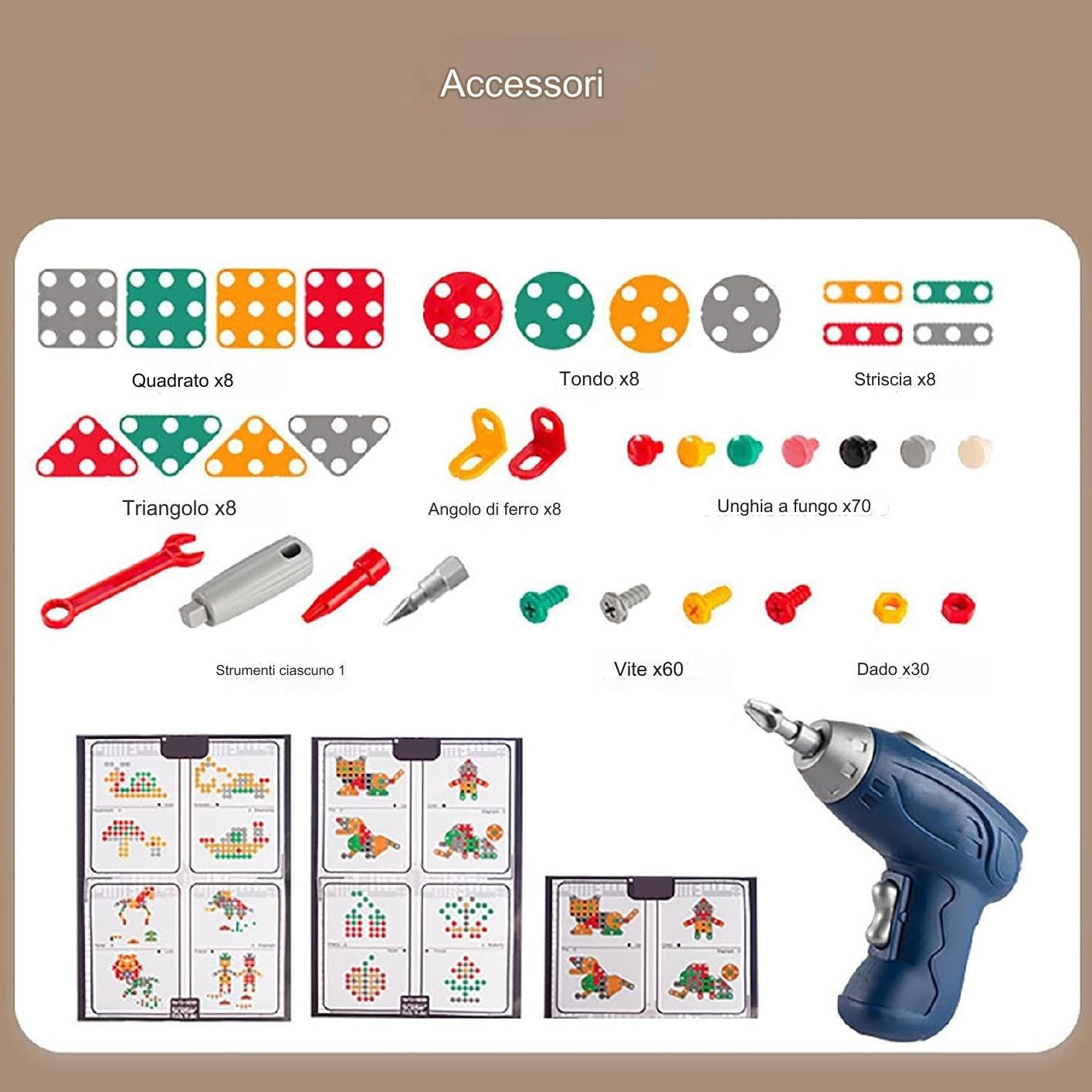 Combo creativo: Set da 203 pezzi con dadi colorati, bulloni e mattoncini in una valigetta trasformabile in base per trapano, per esplorazione interattiva e intrattenimento costruttivo con eccellente portabilità Sviluppo Abilità: La facile inserzione delle viti con il trapano giocattolo realistico e gli utensili come cacciavite e chiave inglese ispira il divertimento mentre sviluppa la coordinazione occhio-mano e le competenze pratiche nei bambini Design Sicuro per Bambini: I componenti levigati e privi di spigoli , realizzati in ABS di qualità, assicurano una manipolazione sicura, con un trapano elettrico a batteria che simula il gioco reale senza rischi. Divertimento ispiratore alle costruzioni: Realizzata per bambini che amano le attività costruttive, questa cassetta degli attrezzi con trapano è un regalo splendido per Natale o compleanno, specificamente studiata per bambini dai 3 ai 12 anni con un design coinvolgente e materiali sicuri per ore di gioco creativo Gioco Costruttivo Creativo: Unisce l'emozione del gioco all'esplorazione di concetti costruttivi, promuovendo sia la creatività organica che lo sviluppo di vitali capacità di risoluzione problemi attraverso l'impegno tattile e manuale.