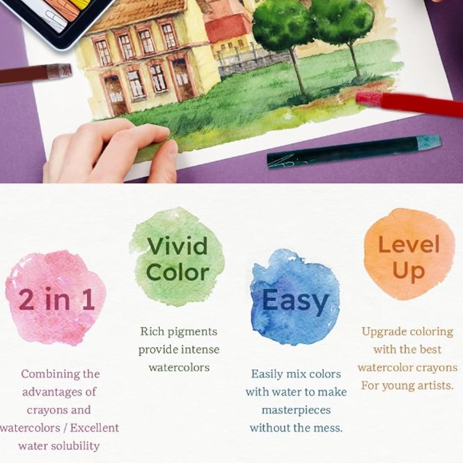 Ampia applicazione: questi pastelli ad acquerello hanno una vasta gamma di applicazioni e sono perfetti per i principianti in quanto consentono agli aspiranti giovani artisti di apprendere le basi del disegno, della colorazione e della miscelazione, possono essere utilizzati per la pratica quotidiana, la creazione artistica e altro ancora. Multifunzionale: questi bastoncini di pastello ad acquerello sono perfetti per superfici chiare, scure o strutturate, che possono essere utilizzati su carta, vetro, specchi, poster, trame diverse e altro ancora! Buone prestazioni: questo set di pastelli ad acquerello è realizzato con pigmenti e cera di alta qualità per qualità e durata superiori, ogni pastello è levigato con burro, a base di cera e altamente pigmentato. Facile da trasportare: questo set di pastelli ad acquerello da galleria viene fornito con una scatola di ferro portatile che può essere utilizzata per riporre i pastelli ed è molto comodo portarlo fuori casa. Facile da impugnare: questo pastello solubile in acqua è progettato con un design facile da impugnare, comodo da tenere ed è molto comodo da usare e facile da usare, offrendo ore di divertimento agli artisti di tutte le età.