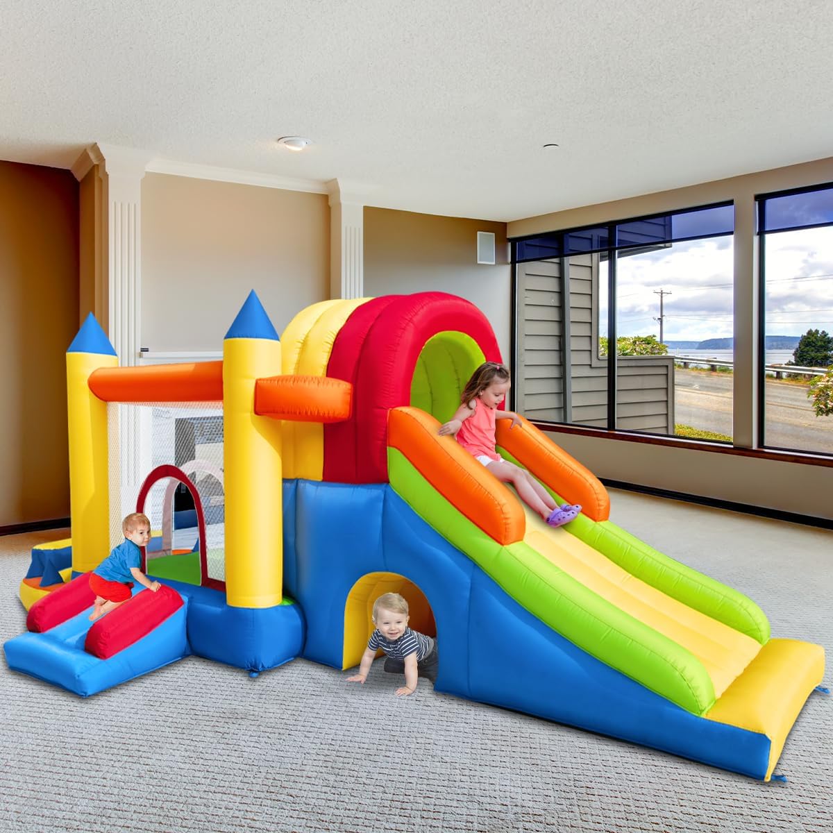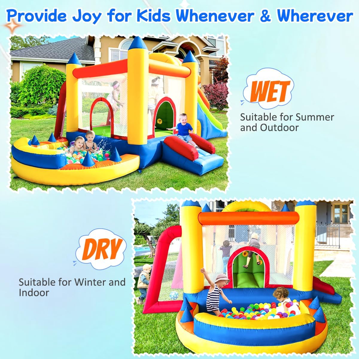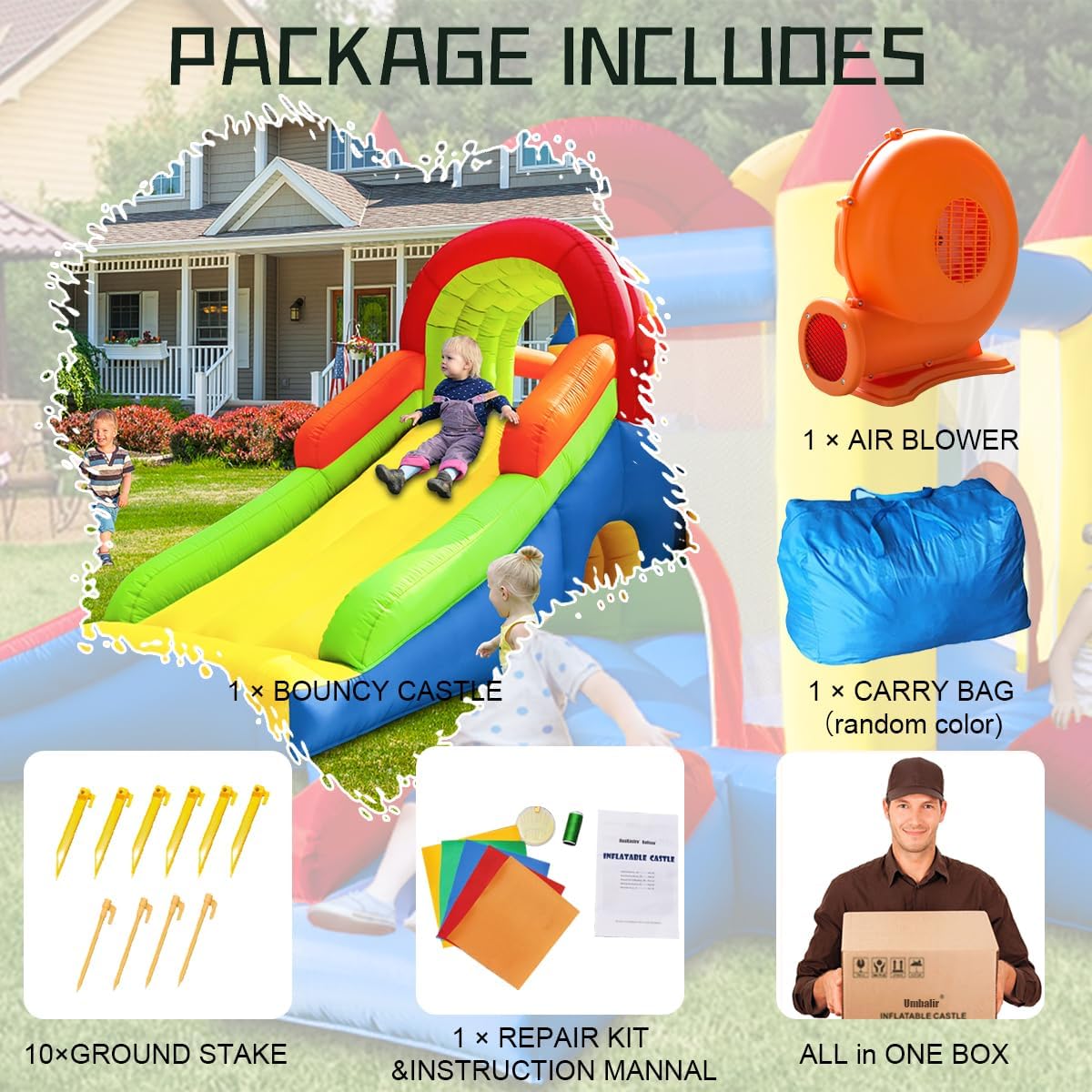 【DIVERTIMENTO DI GIOCO CERTIFICATO IN SICUREZZA】: Castello gonfiabile Ballsea realizzato in resistente tessuto Oxford 420D + 840D e PVC, con rete protettiva e ventilatore conforme UE per uso domestico, certificato EN71-1/2/3. 【PIÙ GIOCO INFINITO GARANTITO】: questo castello gonfiabile XXL offre ai bambini la perfetta combinazione di sport e divertimento. Ideale per corse energiche, arrampicate e salti con gli amici. 【VARIE ZONE DI GIOCO】: Dotato di trampolino, scivolo, porta da calcio, campo da gioco, tunnel strisciante e parete da arrampicata, il nostro castello gonfiabile è versatile per ogni stagione e ogni ambiente. 【IL PUNTO DI OGNI FESTA】: Che si tratti di un compleanno o di una festa, il castello gonfiabile Ballsea è il regalo che fa battere forte il cuore dei bambini e crea momenti indimenticabili. 【QUALITÀ DUREVOLE】: Realizzato con doppie cuciture rinforzate, il nostro castello gonfiabile può resistere a salti intensi. Carico massimo: 180 kg, per bambini dai 3 agli 8 anni, fino a 5 bambini contemporaneamente. BALLSEA ha 19 anni di esperienza nello sviluppo e nella produzione di prodotti gonfiabili. Dalla selezione dei materiali alla produzione e all'attento controllo, solo la perfezione può far sorridere ogni bambino.