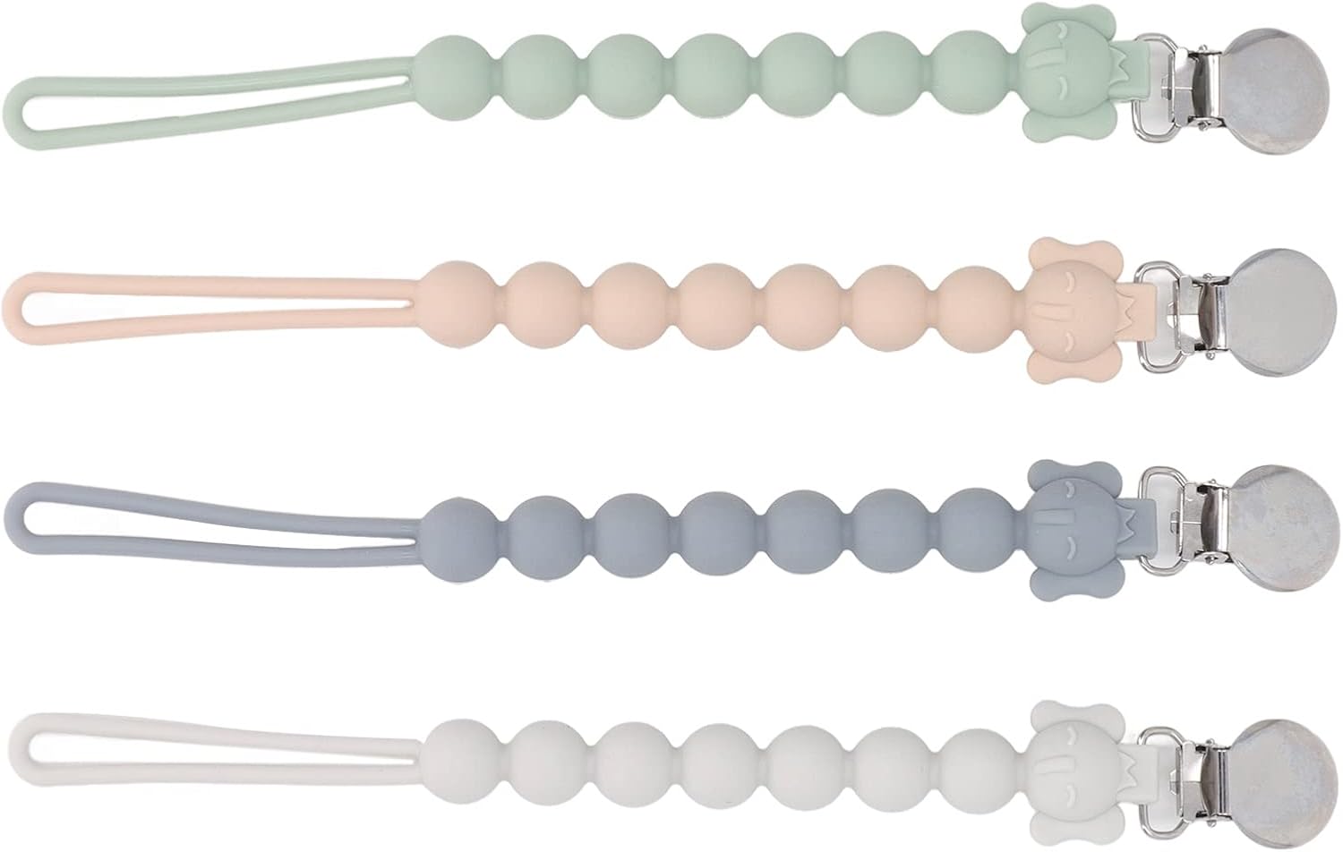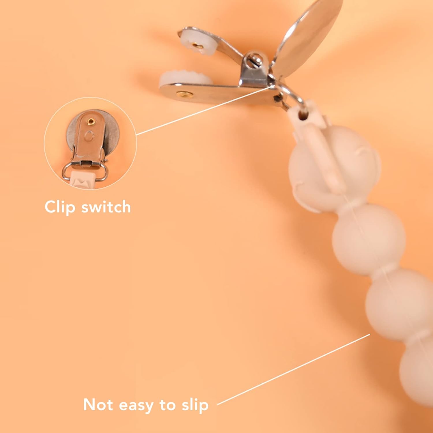 [DESIGN ATTRAENTE] Simpatico disegno di elefante sulla testa di una collana di perle per attirare l'attenzione del bambino. [PREVENIRE LA PERDITA] Attacca saldamente il ciuccio a vestiti, coperte, passeggini o borse per pannolini per evitare che cada. [FACILE DA PULIRE] Lavare a mano con salviette per ciuccio o acqua tiepida, risciacquare abbondantemente e asciugare all'aria per una comoda pulizia. [MATERIALE SICURO] Realizzato in materiale siliconico morbido e delicato sulla pelle per garantire la sicurezza del bambino [AMPIA APPLICAZIONE] Il morsetto/supporto robusto e sicuro si adatta alla maggior parte dei tipi di ciucci, dentiera e coperte ed è versatile.