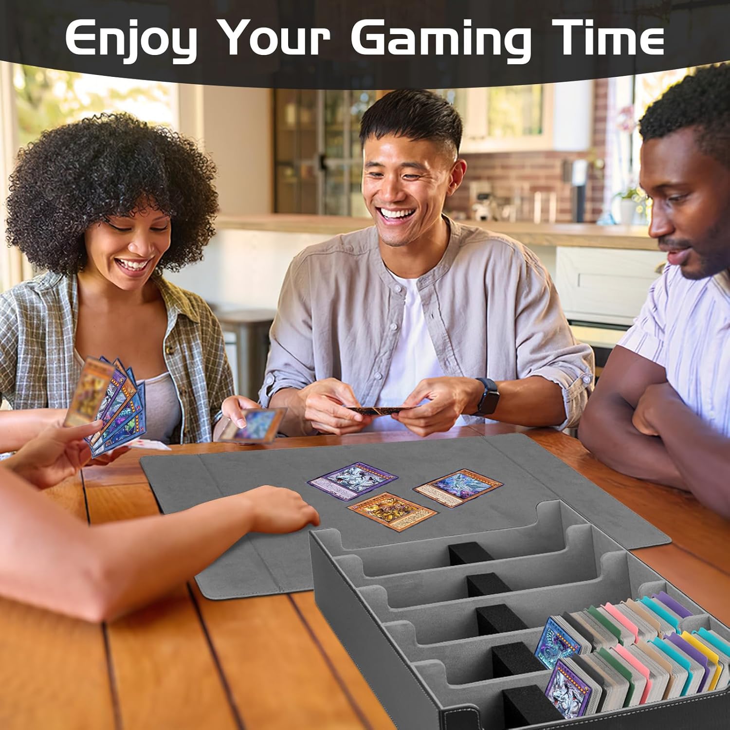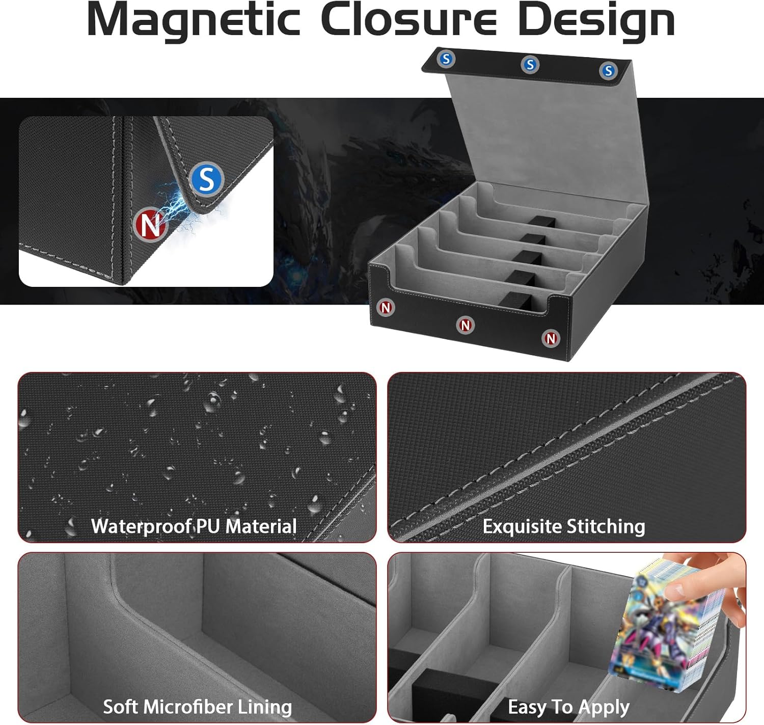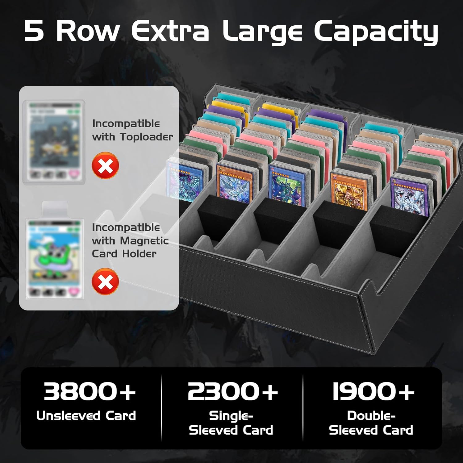 CAPACITÀ EXTRA GRANDE, ORGANIZZAZIONE PROFESSIONALE: Questa scatola è stata progettata per i collezionisti di carte, può contenere facilmente 3800 carte! Che si tratti di carte da gioco, carte sportive o periferiche per l'osservazione delle stelle, una scatola per fare tutto, dire addio al disordine. COPERCHIO MAGNETICO AGGIORNATO: Questa scatola ha un innovativo design a tenuta magnetica, che si apre e si chiude in modo fluido e sicuro, evitando efficacemente l'umidità e la polvere e proteggendo le preziose carte da eventuali danni! Inoltre, il coperchio può essere completamente rimosso, consentendo un accesso più libero alle carte, un'organizzazione e una conservazione più semplice. SET DELUXE, GESTIONE PARTIZIONATA: Questa scatola per carte contiene 5 griglie per carte + 5 mattoncini di spugna + 48 pezzi di divisori colorati, combinazione libera di partizione, classificazione e conservazione è più conveniente, in modo che la vostra collezione sia in ordine. MATERIALE PU, FORTE E DUREVOLE: la scatola per carte è realizzata in pelle PU impermeabile sulla facciata esterna, che è resistente ai graffi e alle deformazioni; l'interno della scatola è foderato con fibra a setole ultra sottili, che è morbida per prendersi cura delle carte per evitare graffi e proteggere i vostri tesori per lungo tempo. COMPATIBILE CON MOLTEPLICI TIPI DI CARTE: la nostra scatola per la conservazione delle carte supporta carte standard come PTCG, TCG, CCG, LCG, YugioH, ecc. ed è anche adatta per carte di baseball, basket, calcio e altri sport.