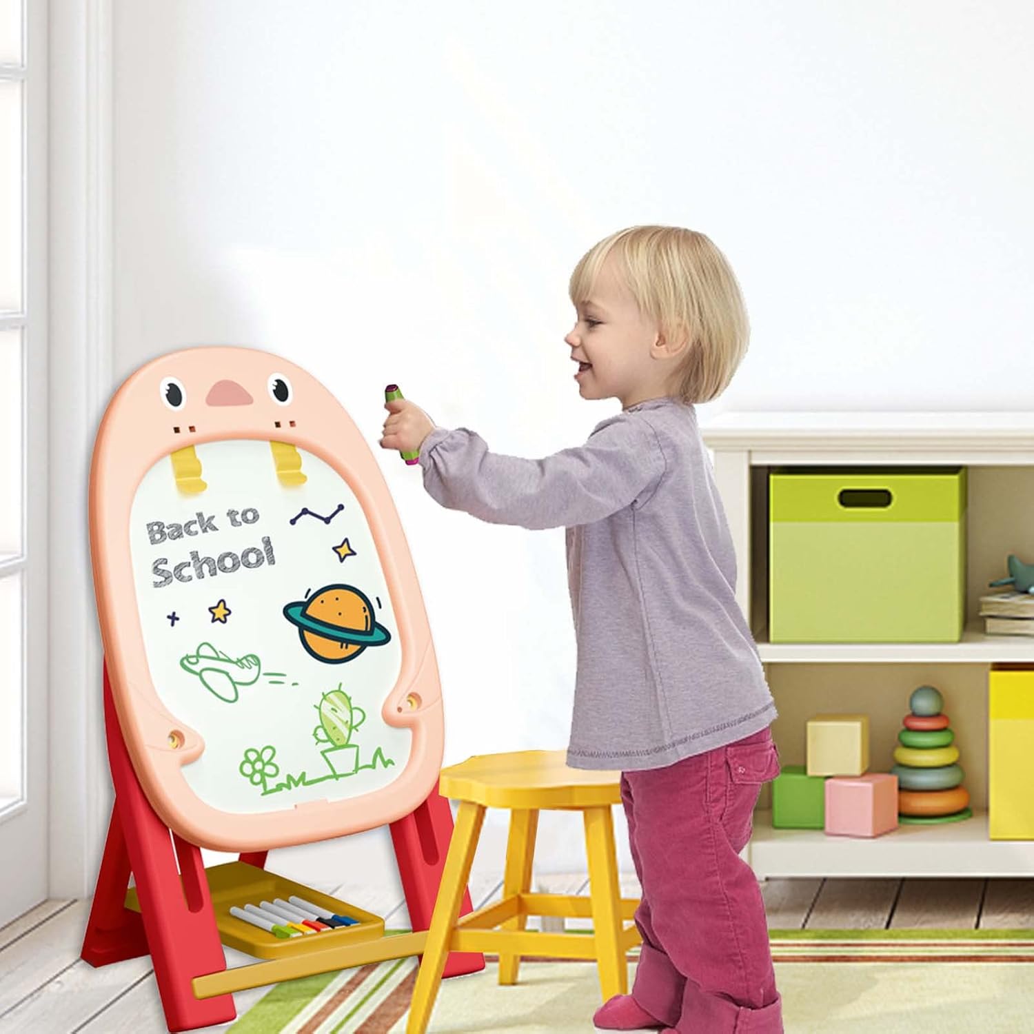 λMateriale ABS di lunga durata: la superficie è liscia e realizzata in materiale ABS di alta qualità per evitare graffi. Il cavalletto è regolabile in due altezze per un comodo utilizzo da seduti o in piedi. λImagination Igniter: la nostra selezione di cavalletti per bambini consente a tuo figlio di esplorare ed esprimere liberamente la propria creatività attraverso l'arte. Con vari colori tra cui scegliere, ispira e aumenta il loro senso artistico e le loro capacità immaginative. λDesign versatile: il nostro cavalletto per bambini presenta una struttura triangolare in piedi che è staccabile per la massima flessibilità. La costruzione stabile garantisce che rimanga in posizione per un uso sicuro e il suo design leggero e portatile ti consente di utilizzarlo facilmente all'interno o all'esterno. λStrumenti di apprendimento innovativi: questo cavalletto artistico per bambini vanta un set educativo con numeri magnetici e alfabeto, ampio vassoio portaoggetti, gomma a doppia faccia, gesso colorato con per la pittura e pennarello cancellabile a secco per un'esperienza di apprendimento interattiva e coinvolgente. λRegalo sorprendente: regala a tuo figlio il regalo di Natale o di compleanno con questo cavalletto per bambini. È adatto per l'istruzione prescolare ed è progettato sia per ragazze che per ragazzi.