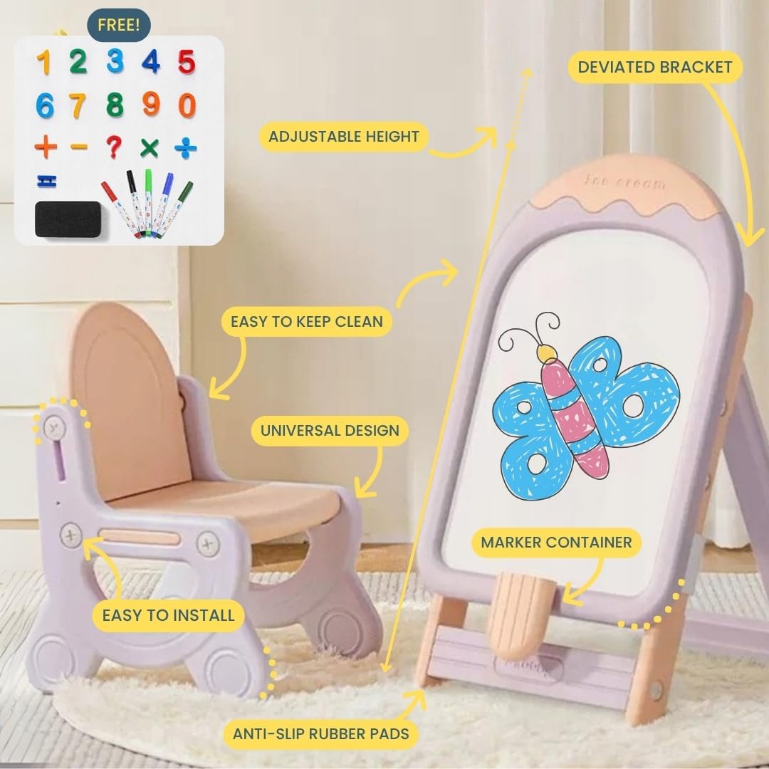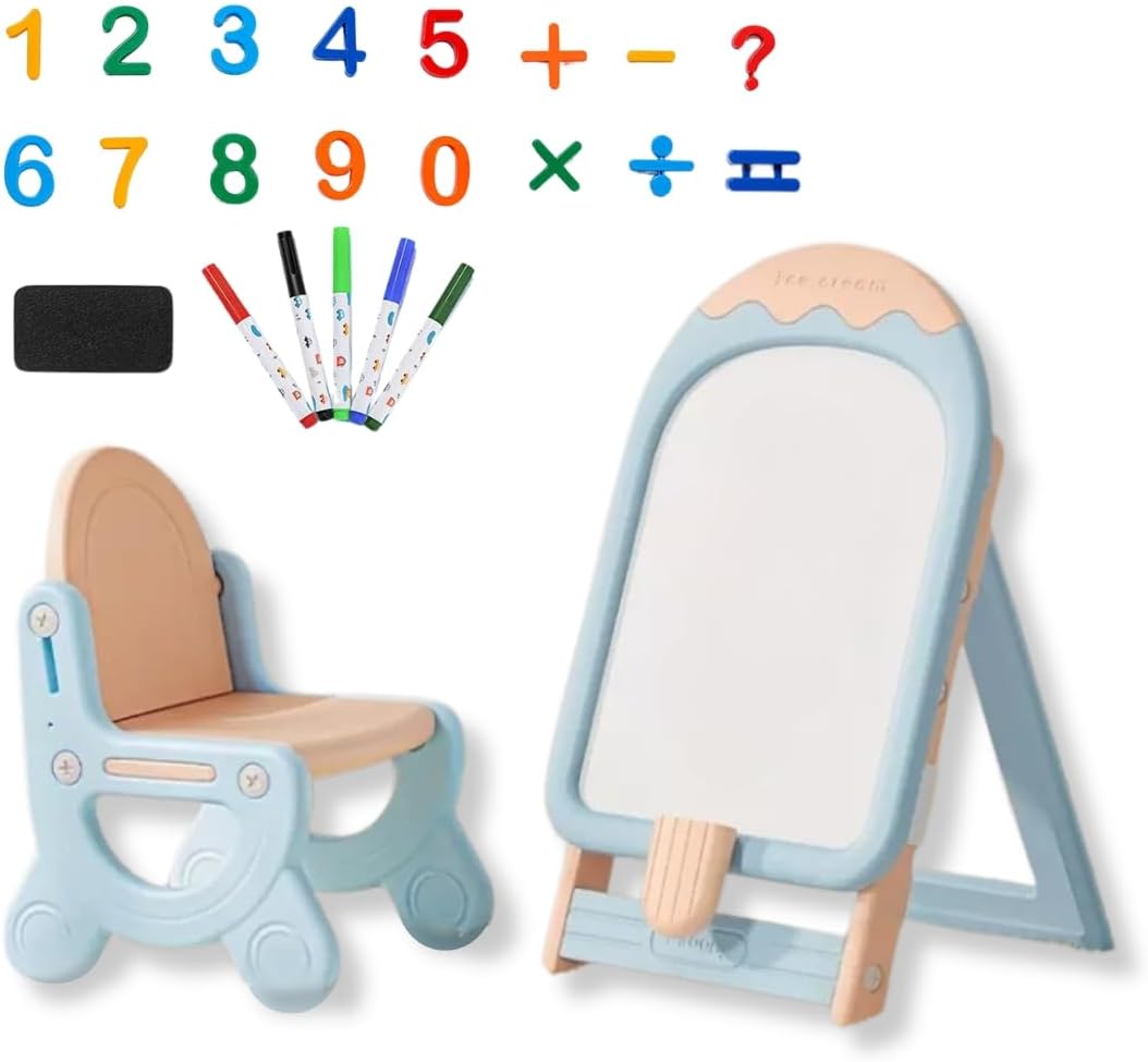 Lavagna magnetica con seggiolone e accessori per bambini. Sviluppa l'immaginazione e le abilità pratiche del bambino. Il cavalletto è funzionale e sicuro. Ottima idea regalo! ️ FUNZIONALE - l'altezza regolabile della lavagna consente di adattarsi alla altezza del bambino, nonché alla posizione durante la pittura e il gioco (posizione in piedi o seduti). ️ COMODO - condizioni ergonomiche, che supportano lo sviluppo e la creatività del bambino. Il set è leggero, può essere facilmente spostato in un altro luogo, in un'altra stanza, in cucina, sul balcone e persino in giardino, dove ne hai bisogno. ️ SICURO - Tutti i bordi e gli angoli sono arrotondati, il tavolo e la sedia non hanno spigoli vivi. Inoltre, il tutto è realizzato in HDPE sicuro. Il prodotto è certificato CE, quindi soddisfa tutti gli standard europei applicabili. Il set cresce con il bambino! 3 livelli di altezza della lavagna. Una soluzione pratica che consente di adattare la lavagna alla crescita del bambino in diverse fasi del suo sviluppo. Inoltre, la regolazione consente di utilizzare il set da seduto o in piedi. Vantaggi del set: bordi arrotondati e sicuri, cavalletto regolabile in altezza, seggiolone ergonomico, dimensioni ottimali della lavagna, cavalletto pieghevole per una facile conservazione, pratica tasca per magneti e pennarelli, piedini in gomma antiscivolo. Gratis: un set di 5 pennarelli colorati e una spugna per cancellare la lavagna, 16 magneti per imparare e giocare. ️ L'uso del materiale HDPE consente di pulire facilmente tutti gli elementi. Facile da montare con tappi e piume in plastica.