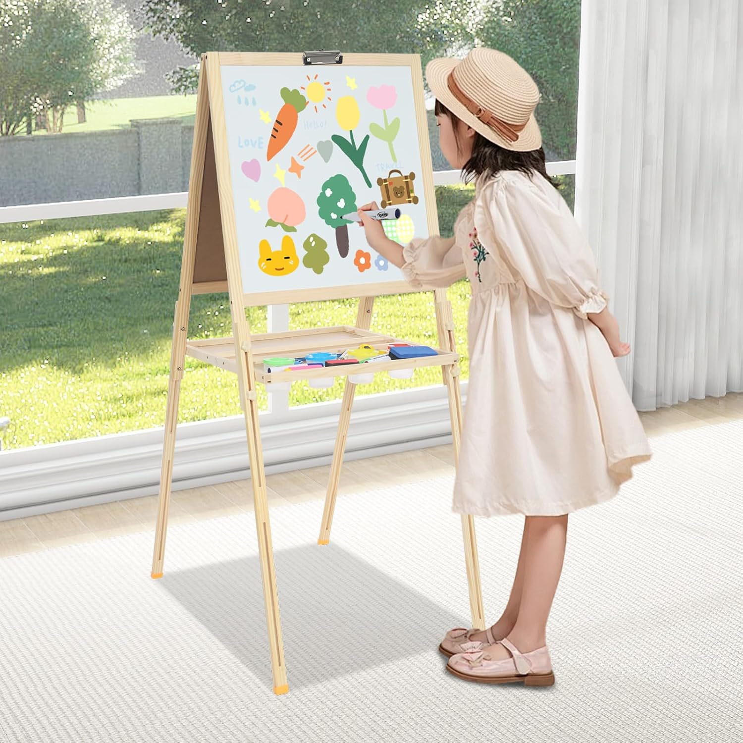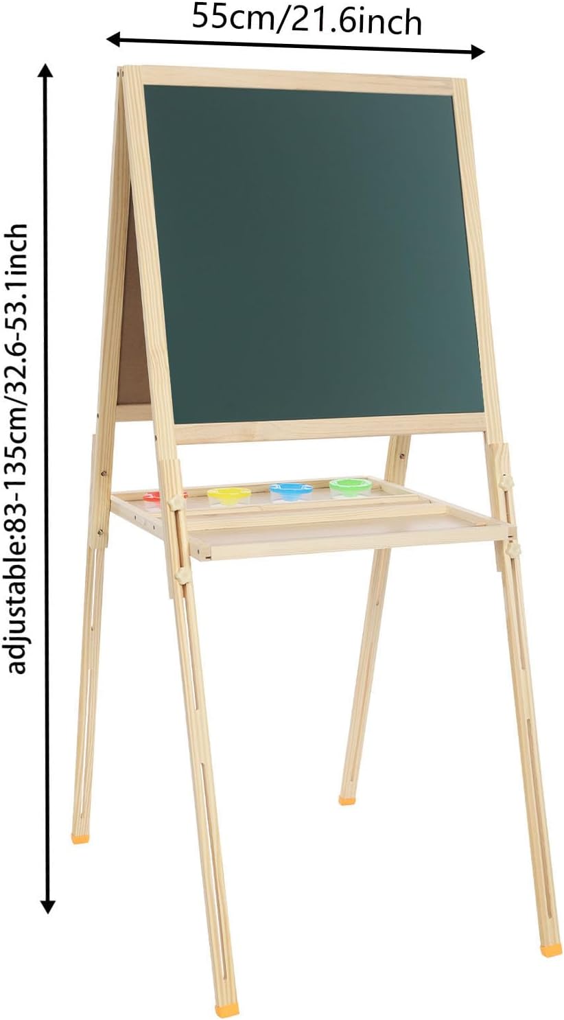 Struttura stabile: il materiale ispessito, le gambe di supporto stabili (75° angolo di sicurezza rispetto al pavimento) e la robusta struttura a telaio ad A conferiscono al prodotto un'elevata stabilità, in modo che possa facilmente contenere una varietà di strumenti di pittura, dandoti sicurezza. Qualità e robustezza: è realizzato in legno massiccio di alta qualità, lamiera zincata e lamiera densa, lucidata con una smussatura a mano, resistente, antiurto, antistrappo, non facile da deformare e ha una lunga durata. Design 3 in 1: questo prodotto è dotato di 2 pannelli. La lavagna magnetica verde scuro è progettata per i bambini per scrivere e disegnare con il gesso, che è facile da scrivere e cancellare, proteggendo la vista. Design regolabile: l'altezza del prodotto può essere regolata nell'intervallo di 32.6-53.1in, che può soddisfare le esigenze di altezza dei bambini di età diverse. Accessori completi: include 4 bicchieri colorati, 1 vassoio, 1 grembiule, 1 paio di polsini, 1 scatola di gesso, 4 pennarelli per lavagna bianca, un set di lettere magnetiche colorate e numeri, ecc.