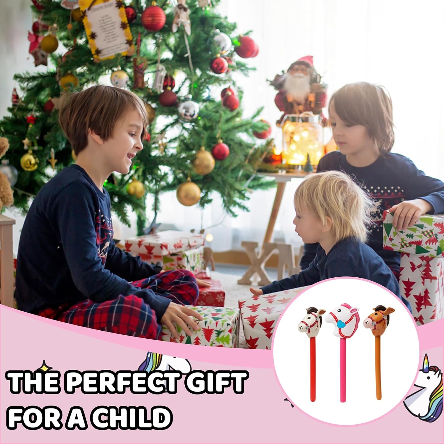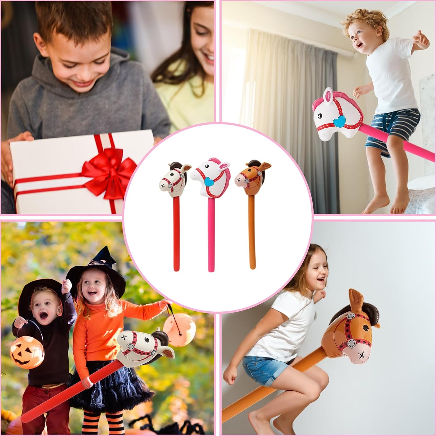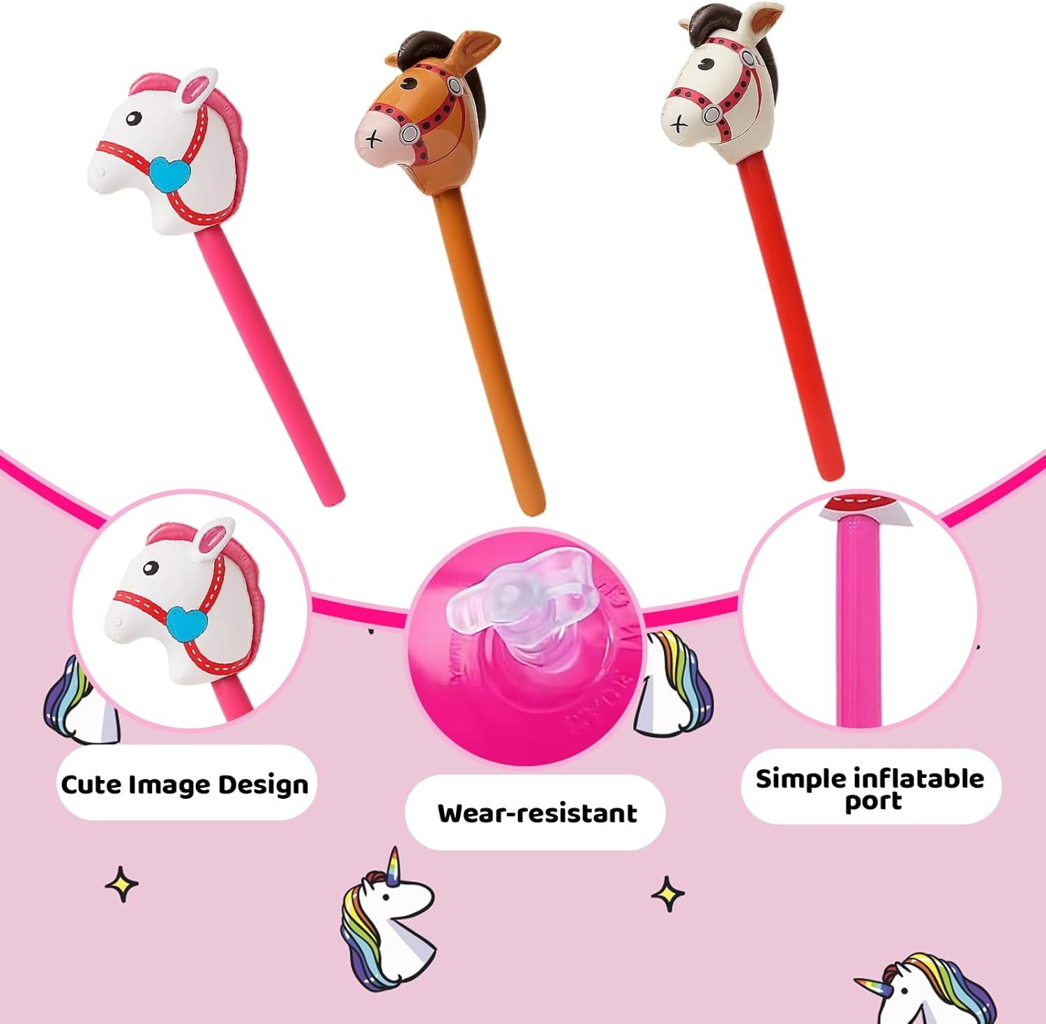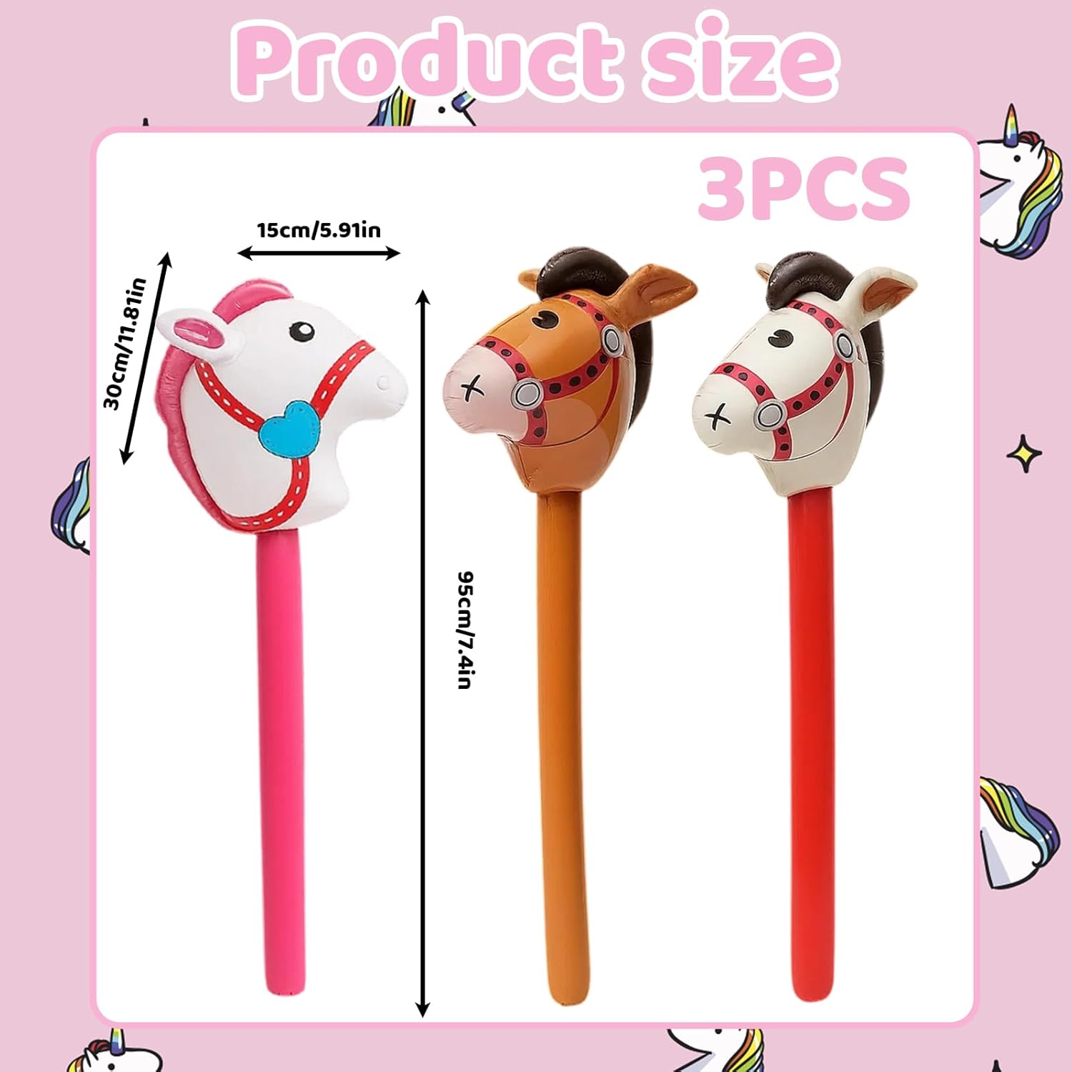 Set di cavalli gonfiabili: tre aste gonfiabili colorate per cavalli in beige, rosa e marrone; ideali per bambini dai tre ai dodici anni; perfetto per feste di compleanno a tema cavallo e feste di carnevale Materiale PVC di alta qualità: i cavalli sono realizzati in PVC resistente e sicuro; facile da pulire e riutilizzabile; impugnatura morbida per un divertimento sicuro Molteplici possibilità di utilizzo: ideale come decorazione per feste natalizie, accessori per foto o attività di gioco all'aperto; incoraggia il gioco creativo e giochi di ruolo immaginativi Facile da usare: gonfiabile rapidamente con una pompa comune; Facile da svuotare e risparmiare spazio; Non sono necessari strumenti aggiuntivi Divertimento per grandi e piccini: porta gioia a qualsiasi festa o evento; ideale per genitori e organizzatori di eventi; crea momenti indimenticabili per i bambini