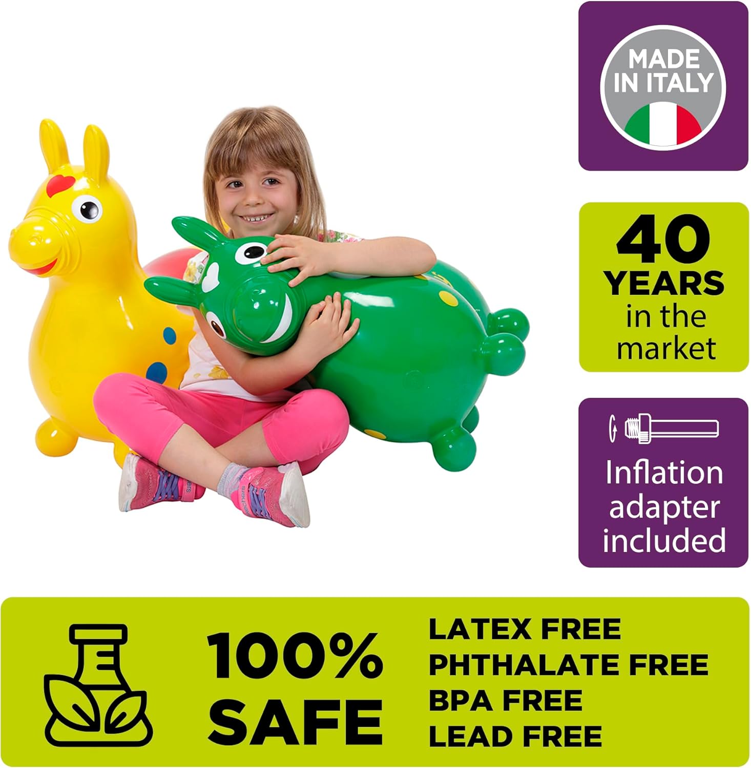 Latex Free - Phthalate Free - BPA Free - Lead Free Made in Italy Contenuto confezione: 1 Rody - 2 tappi - 1 adattatore gonfiaggio - 1 libretto istruzioni Dimensioni prodotto: 54 x 45 x 22 cm