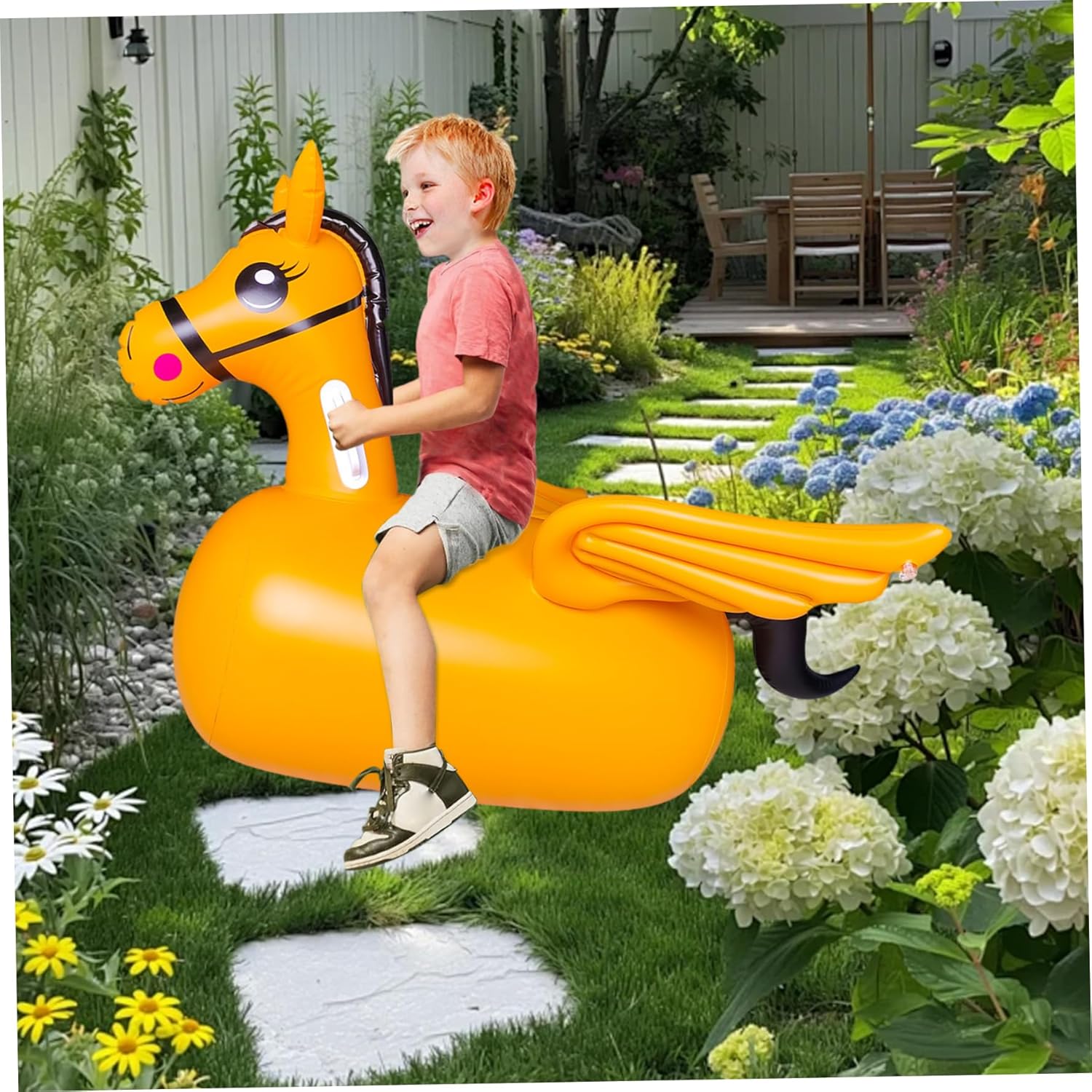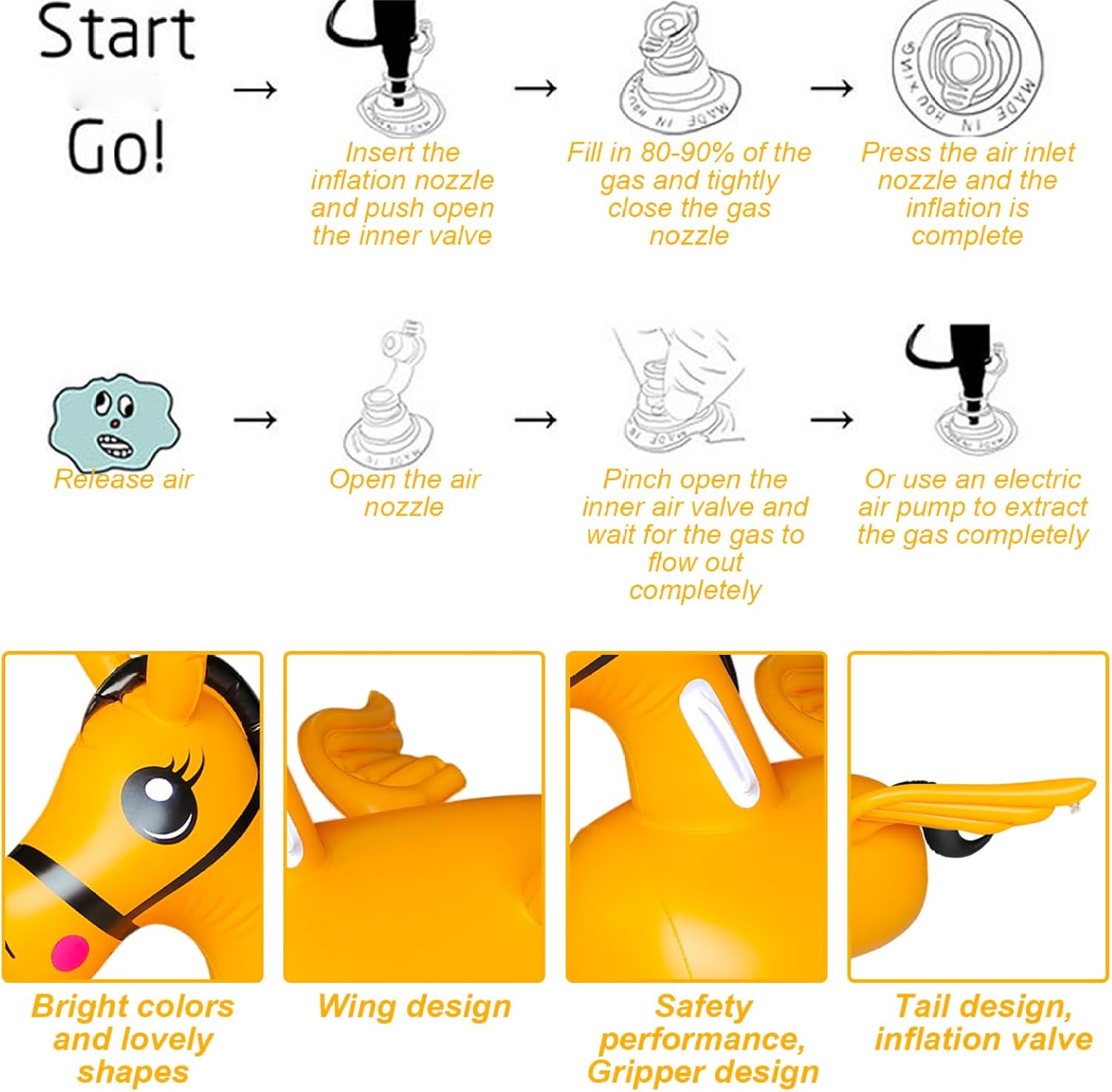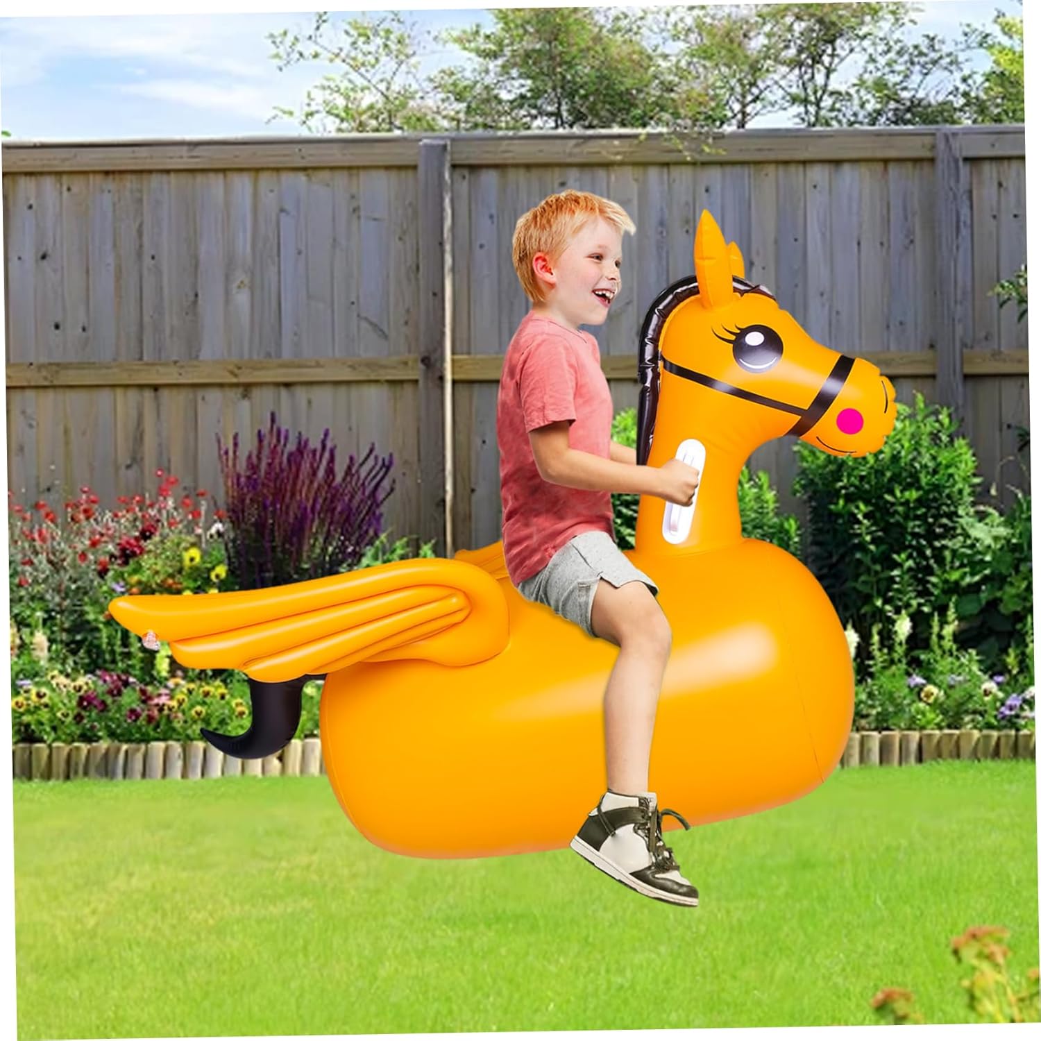 Materiale sicuro: realizzato in PVC gonfiabile di alta qualità, il cavallo gonfiabile ha una superficie robusta ma delicata che consente ai bambini dai 3 anni in su di giocare in sicurezza e dà ai genitori un senso di sicurezza durante il divertimento attivo sui rimbalzi. Aspetto divertente e attraente: i colori vivaci e la simpatica forma del cavallo sono progettati per affascinare sia i ragazzi che le ragazze. Incoraggiano il gioco fantasioso, rendendolo un compleanno ideale che i bambini adoreranno e apprezzeranno. Incoraggia il gioco attivo: questo cavallo gonfiabile è perfetto per uso interno ed esterno e incoraggia l'attività fisica. Incoraggia i bambini a esercitare le gambe e a migliorare le loro capacità motorie attraverso gioiosi esercizi di rimbalzo. Leggero e portatile: questo giocattolo per cavalli è facile da gonfiare, sgonfiare e trasportare, adatto ai viaggi e facile da trasportare, consentendo alle famiglie di divertirsi e giocare facilmente ovunque. Design ergonomico della maniglia: con maniglie facili da impugnare, questo giocattolo da cavalcare promuove la stabilità e l'equilibrio, aiutando i bambini a sviluppare le loro capacità di coordinazione dando loro una presa comoda e sicura mentre rimbalzano e cavalcano.