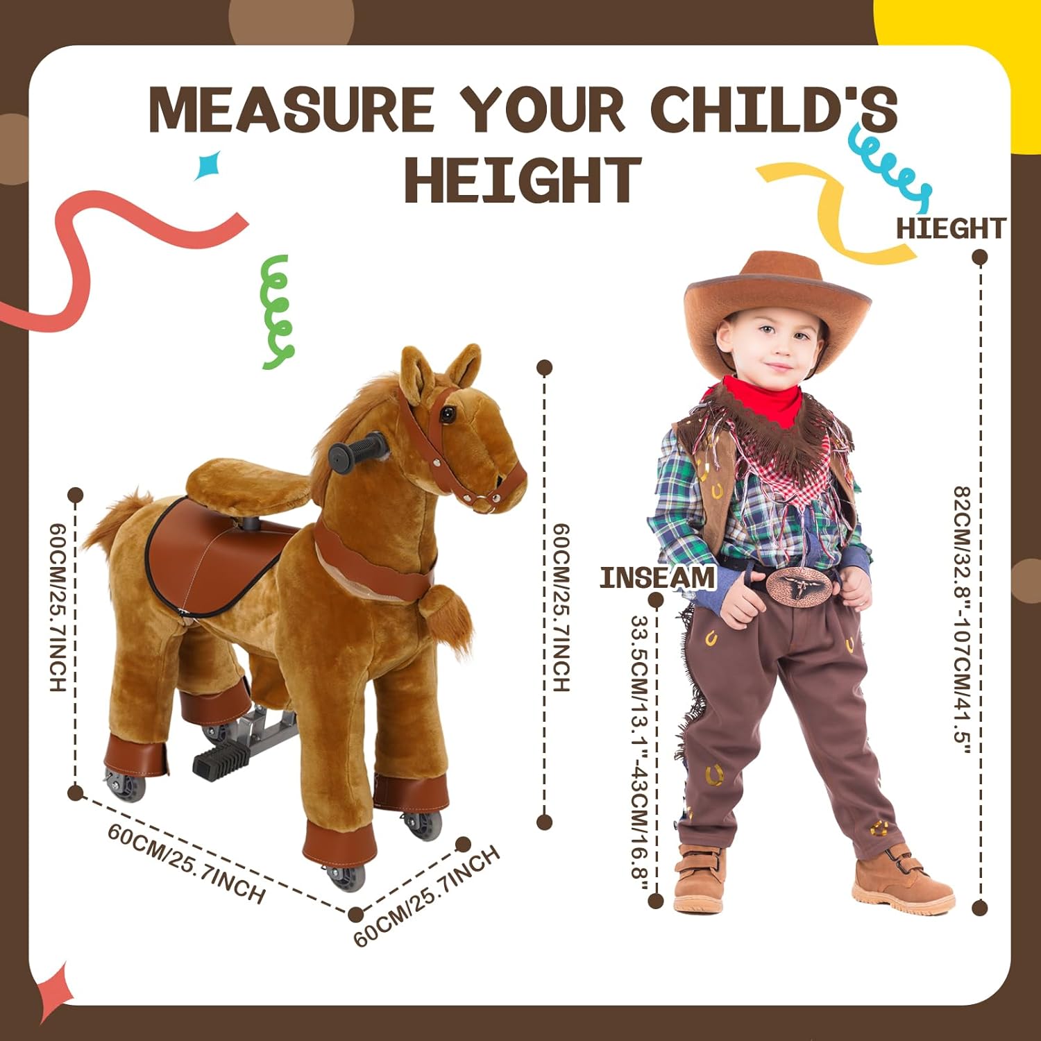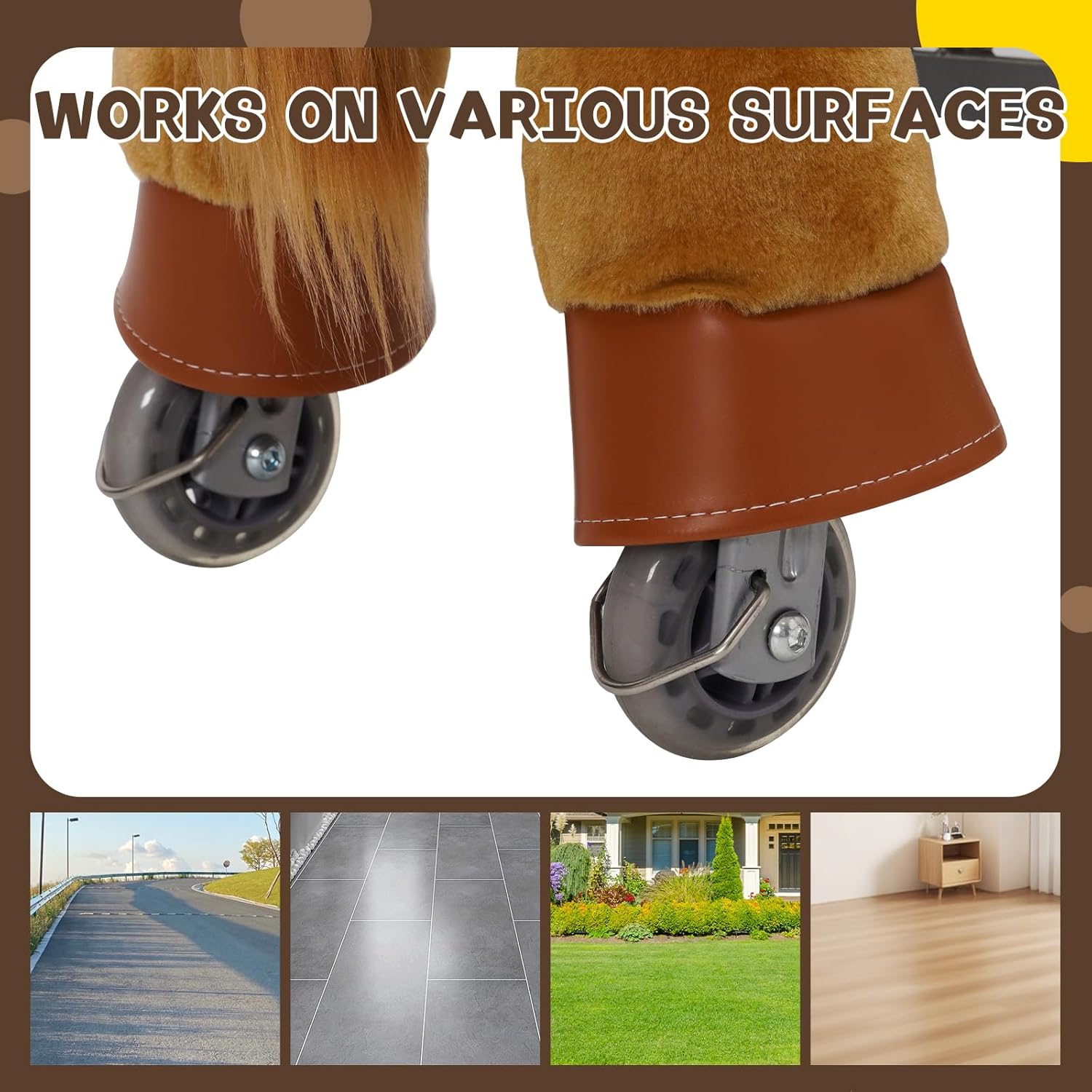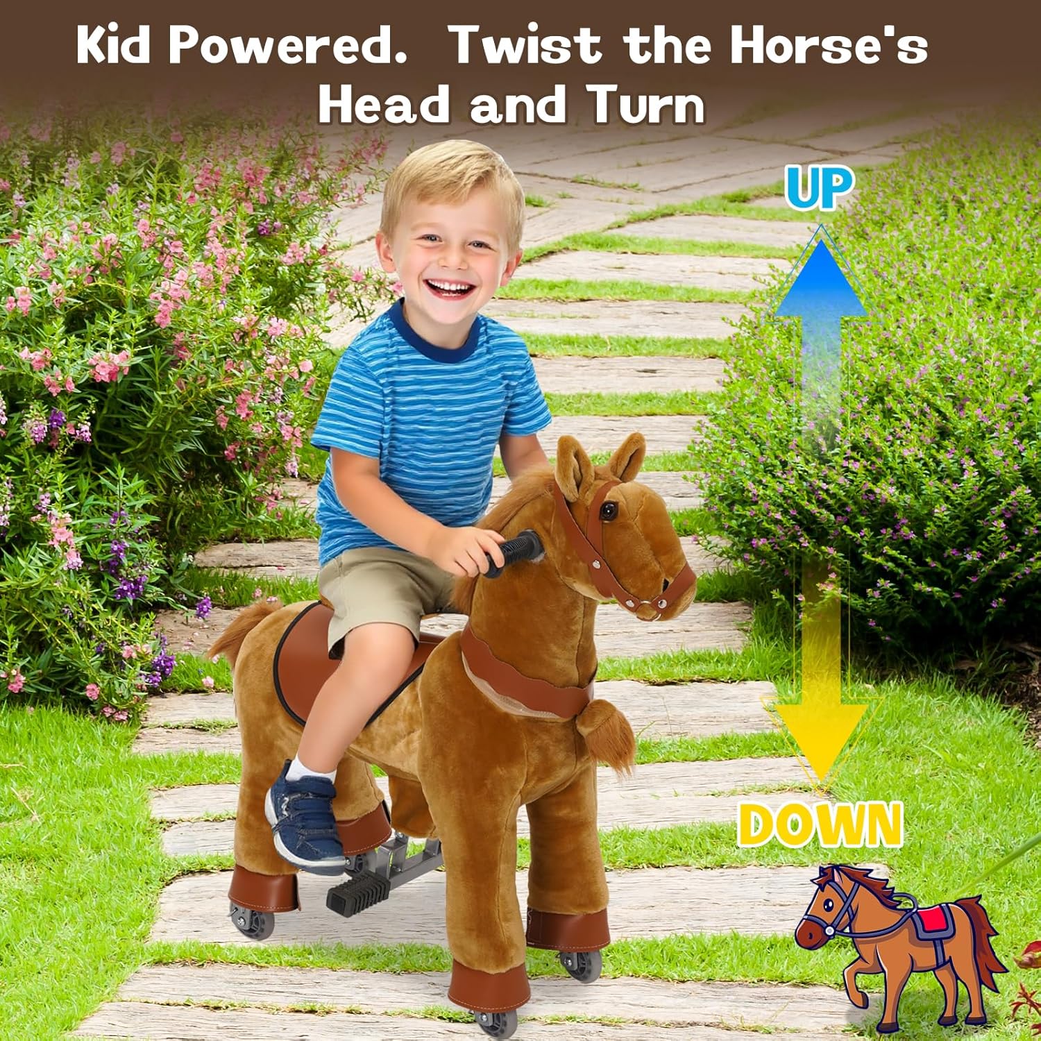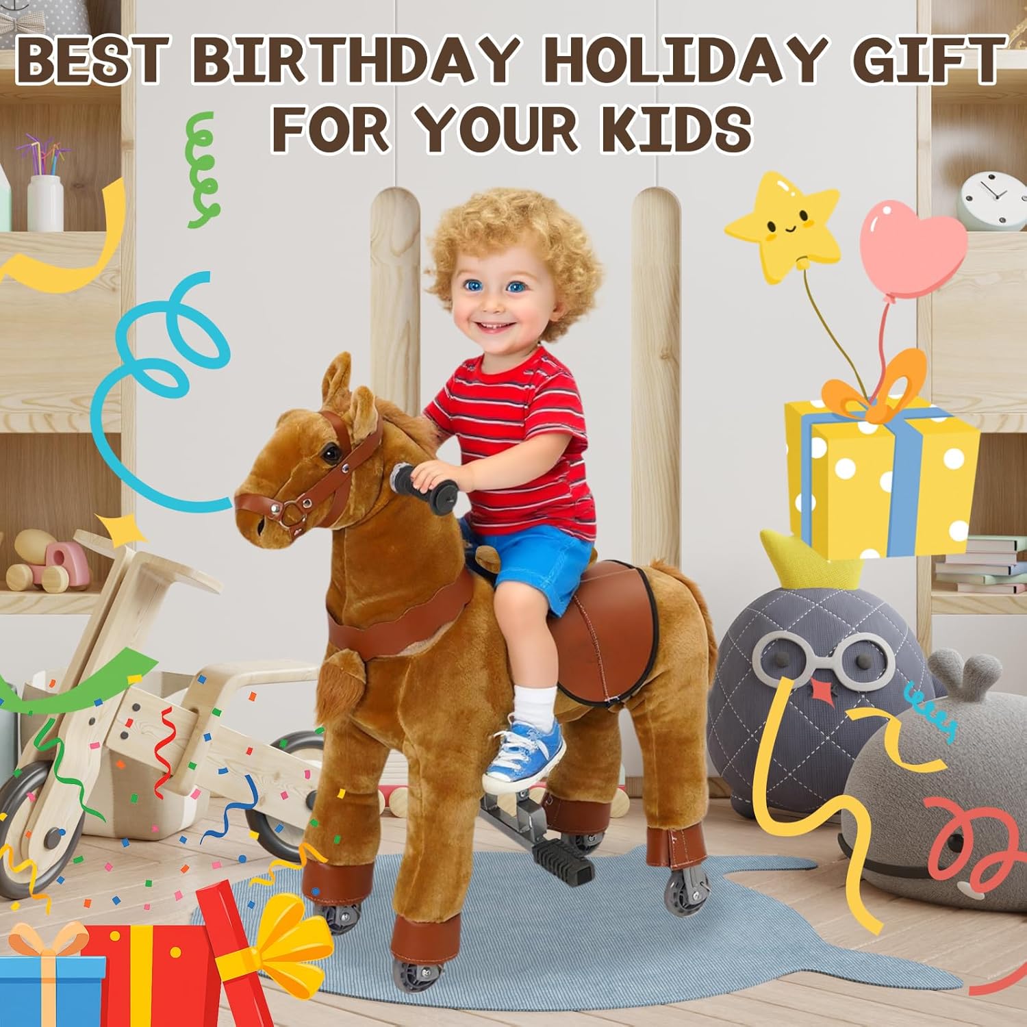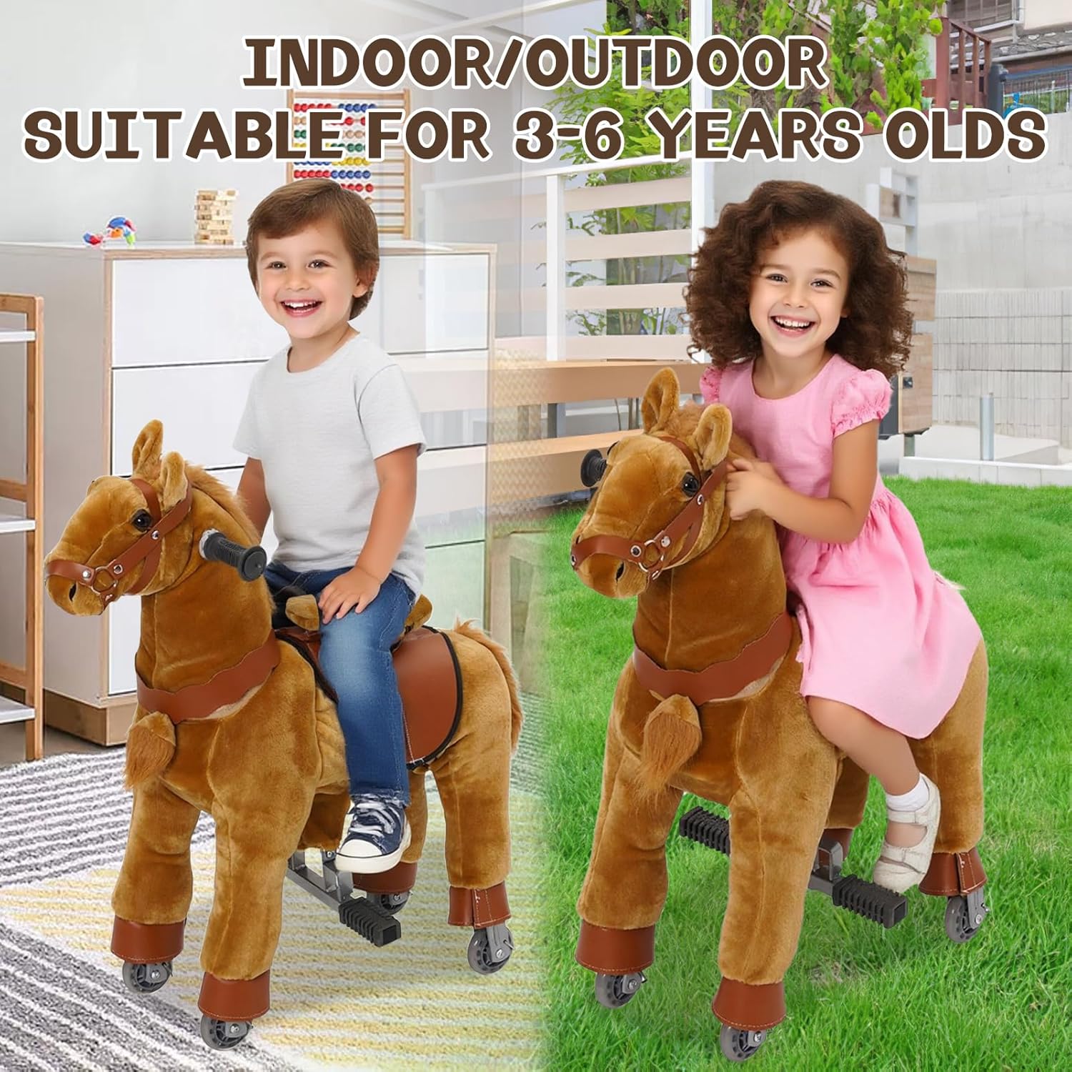 [Esperienza di Guida Sicura e Confortevole] --- Il giocattolo Ride On Horse è realizzato in morbido peluche di alta qualità, confortevole e resistente. Presenta un telaio sicuro e altamente resistente. L'avanzato sistema meccanico offre ai bambini l'emozione di cavalcare un vero pony, rendendolo un'esperienza indimenticabile ogni volta. I giocattoli da equitazione, cavalcano come un vero pony. [Facile da Usare] --- Il giocattolo Ride On Pony è azionato dal movimento del bambino. Basta premere il pedale per far avanzare il pony e sterzare utilizzando il manubrio. Le ruote sono progettate per impedire il rotolamento all'indietro per una maggiore sicurezza. [Allena i Muscoli del Core] --- Cavalcare un pony promuove lo sviluppo fisico. Mentre i bambini cavalcano, coinvolgono tutto il corpo, sviluppando forza, migliorando la flessibilità e la coordinazione. Il sedile rialzato fornisce un supporto efficace ai bambini durante la cavalcata, rendendo più facile per loro guidare il pony e divertirsi. [Interno ed Esterno] --- Il cavallo a dondolo per bambini dai 3 ai 5 anni può essere utilizzato sia all'interno che all'esterno. Sia nel comfort della propria casa che per esplorare il giardino, questo giocattolo da cavalcare su pony offre un divertimento senza fine su diverse superfici piane. [Regalo per Bambini 3 4 5 6 Anni] --- Le dimensioni del giocattolo da cavalcare sono: L*W*H: 60*72*31 cm, perfetto per bambini dai 3 ai 6 anni. Come regalo di compleanno o di Natale per i tuoi bambini e offre divertimento e attività fisica senza fine anche per i più piccoli.