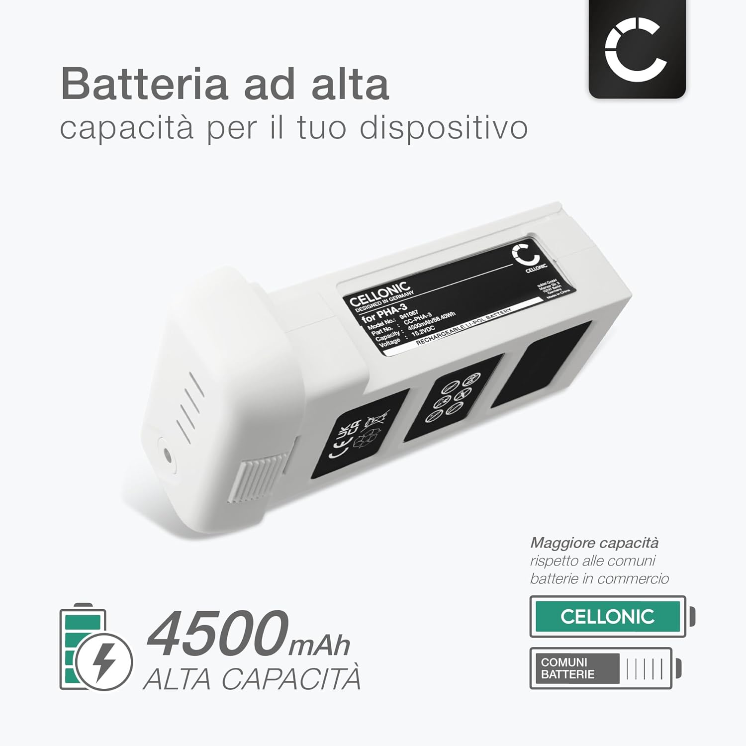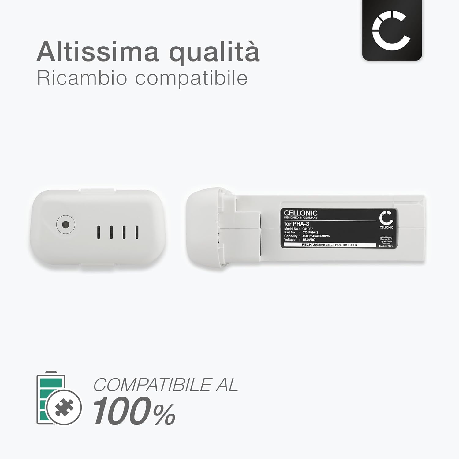 Perfetta compatibilità & adattabilità – compatibile con DJI Phantom 3 Professional, 3, 3 Advance, PHA-3, 3 Drones. Consulta l'elenco completo nella nostra scheda prodotto. Prestazioni premium & lunga durata – Batteria ai polimeri di litio di alta qualità con numerosi cicli di ricarica e bassa autoscarica per un utilizzo prolungato. Alta capacità & alimentazione affidabile – 4500mAh di energia efficiente e duratura per prolungare la vita del dispositivo. Ricambio affidabile con ottime prestazioni. Progettata per affidabilità – Testata secondo rigorosi standard tedeschi per garantire durata ed efficienza. Alternativa conveniente con prestazioni pari o superiori all’originale. Scelta intelligente & conveniente – Sostituire la batteria prolunga la vita del dispositivo e riduce i tempi di inattività. Alternativa affidabile per evitare i costi di sostituzione completa.