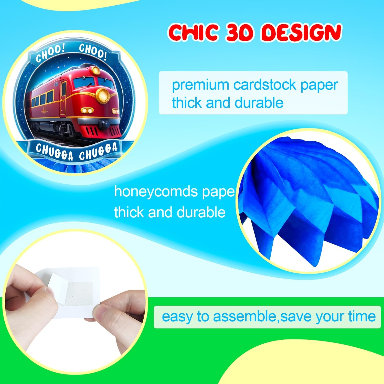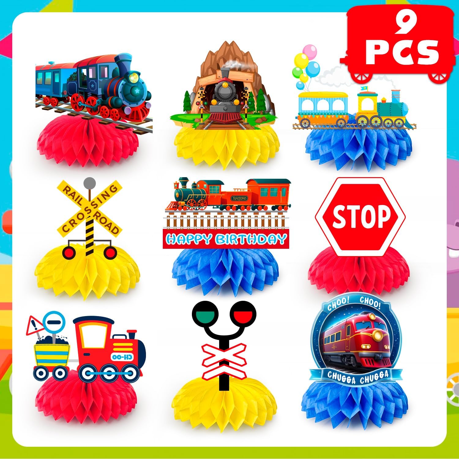 Set a nido d'ape per feste in treno: riceverai 3 decorazioni da tavola centrotavola con base rossa, 3 decorazioni per centrotavola per treni ferroviari con base gialla e 3 topper da tavolo con base blu per decorare il tavolo del tuo treno per feste in treno. Tema interessante: le decorazioni a nido d'ape per feste in treno sono ispirate a elementi classici come treni, cartelli e semafori, i motivi vivaci e realistici rendono il nido d'ape del tavolo di compleanno del treno più ornamentale. Design a forma di nido d'ape: la base delle decorazioni centrotavola del treno è progettata con ispirazione a nido d'ape per migliorare la stabilità, che consente alle decorazioni a nido d'ape di compleanno del treno di stare più saldamente sul tavolo. Facile da usare: le decorazioni per centrotavola per feste in treno sono facili da montare, basta attaccare le carte con la colla inclusa nel set di decorazioni per feste di trasporto, è possibile mettere i centrotavola per la tavola di compleanno del treno ovunque tu voglia decorare, il che è molto conveniente. Ampia applicazione: le decorazioni a nido d'ape a tema treno possono essere utilizzate non solo per feste a tema treno, feste di traffico, ma possono anche essere utilizzate in attività scolastiche, attività di educazione al traffico, mostre di treni e molte altre occasioni.