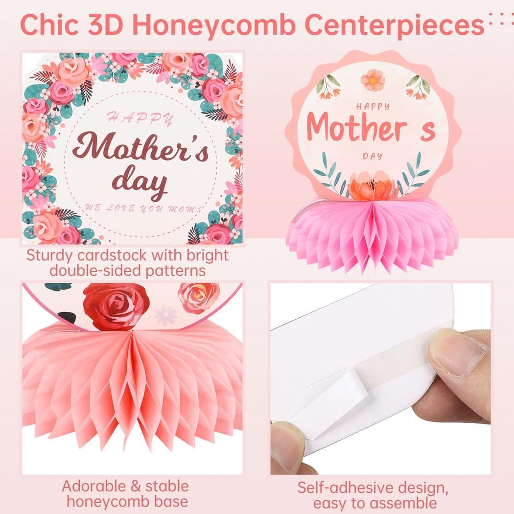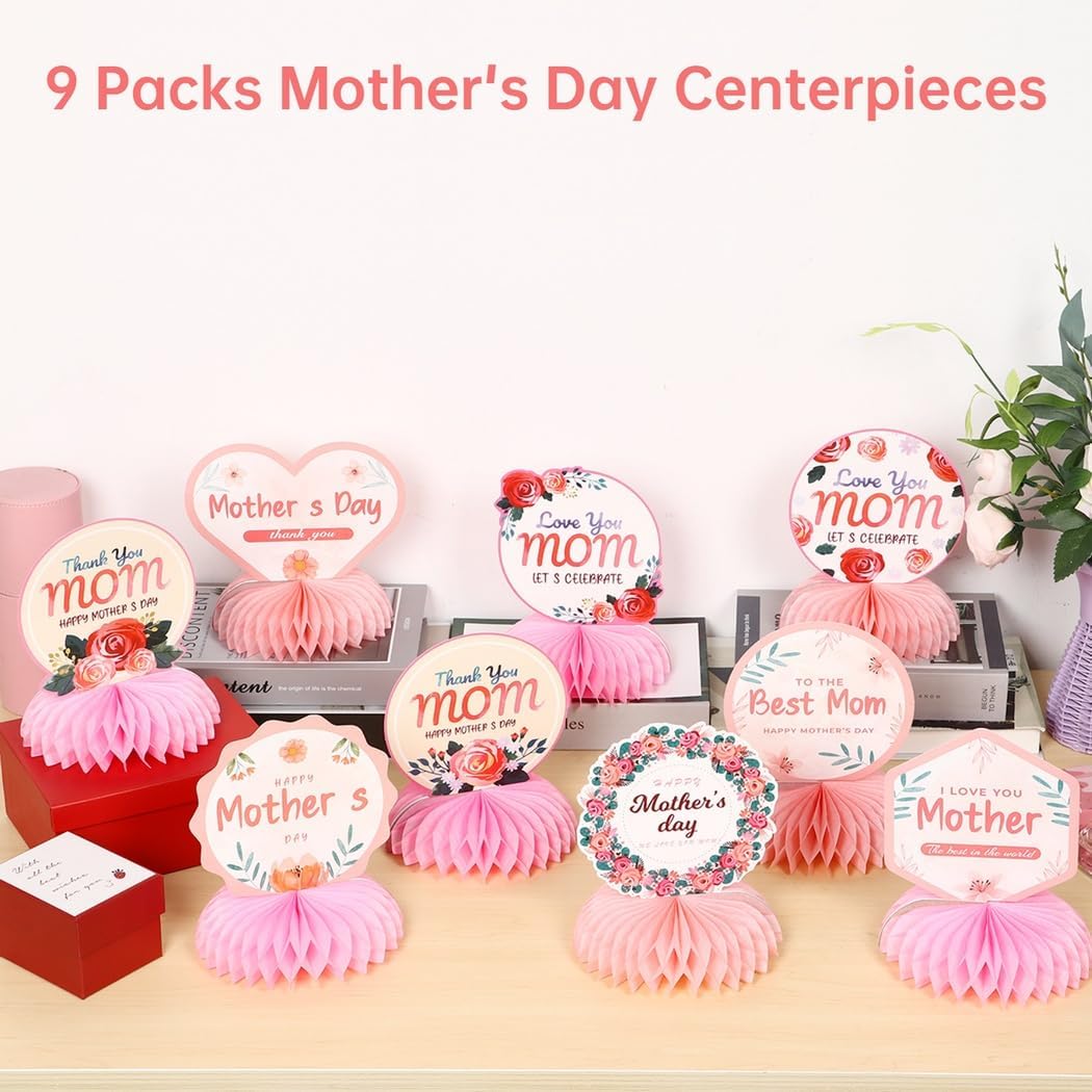 SET UNICO DA 9 PEZZI: include nove splendidi toppers a nido d'ape, design fronte-retro con temi classici della Festa della mamma, progettati per migliorare la tua celebrazione e aggiungere fascino alla tua tavola. Adorabile idea regalo: rosso vibrante e combinazione di colori; Design 3D a nido d'ape con motivi carini; fai sentire speciale la mamma nel suo grande giorno Facile da montare: attacca le decorazioni a nido d'ape ai biglietti a tema in pochi secondi con adesivi adesivi avanzati, non sono necessari strumenti per una configurazione rapida Costruzione di alta qualità: realizzata in cartone con stampa di alta qualità; robusto, trasparente e durevole per resistere allo sbiadimento; ideale per decorazioni di lunga durata Arredamento versatile: ideale per la festa della mamma, feste di compleanno o altre celebrazioni; Posizionalo sui tavoli o appendilo per una varietà di esposizioni creative