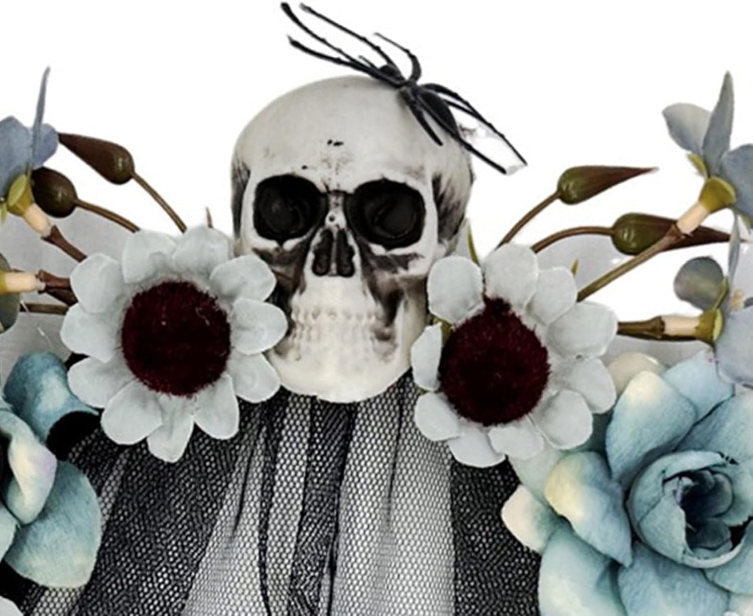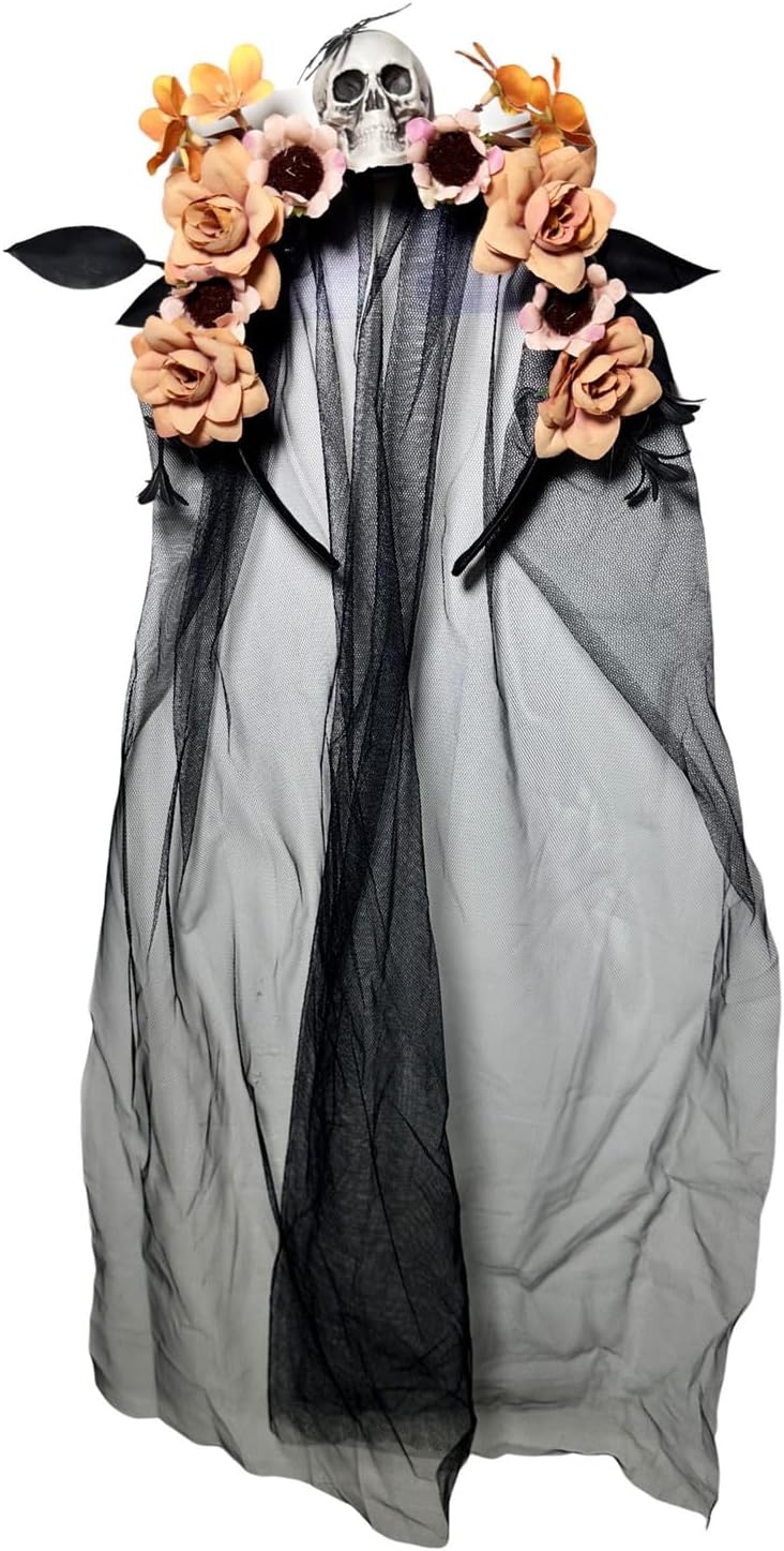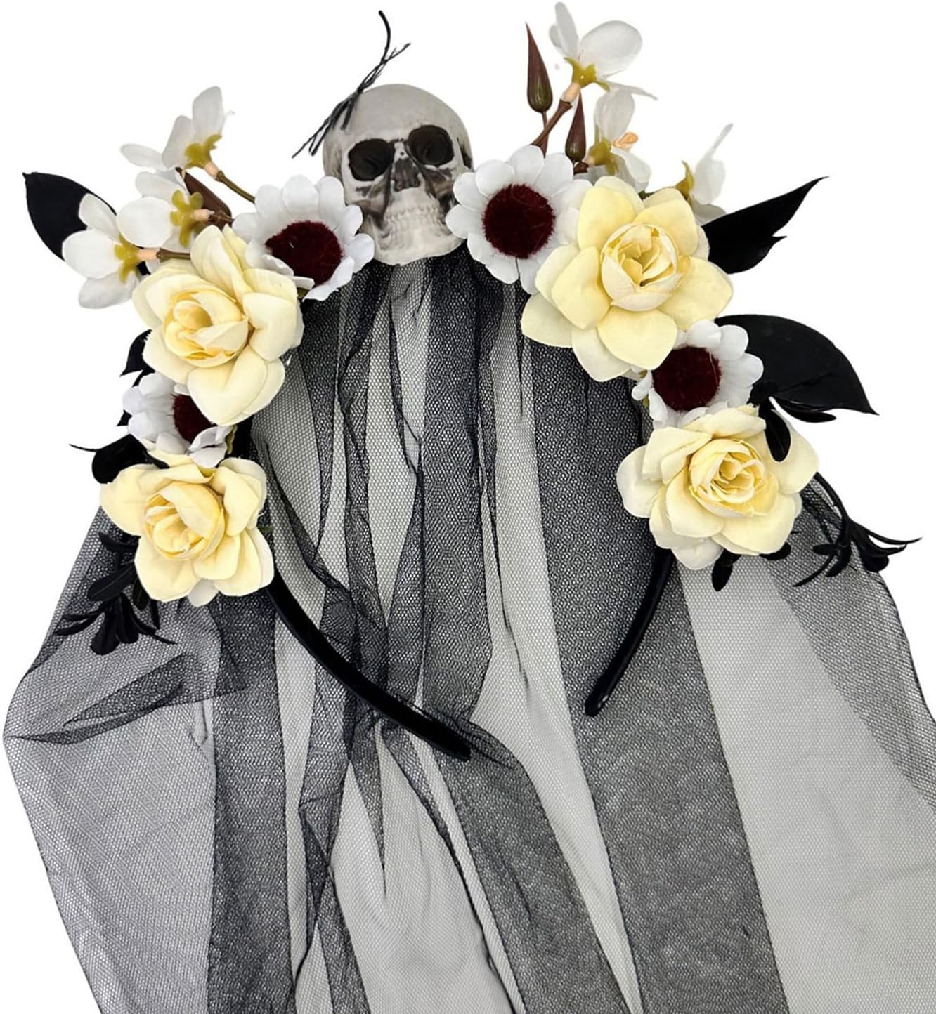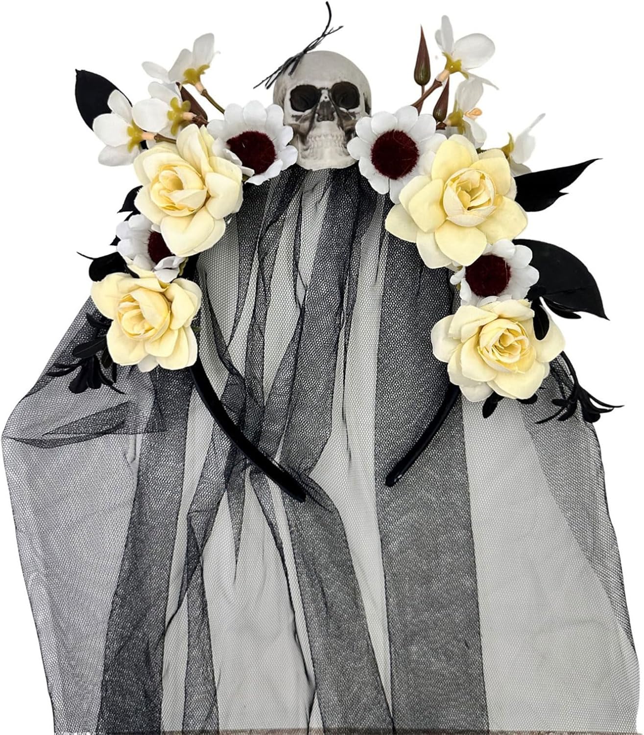 Cerchietto per capelli con fiore e teschio di Halloween, con velo, per costume da strega, festa dei morti, accessori per cosplay, costume da strega