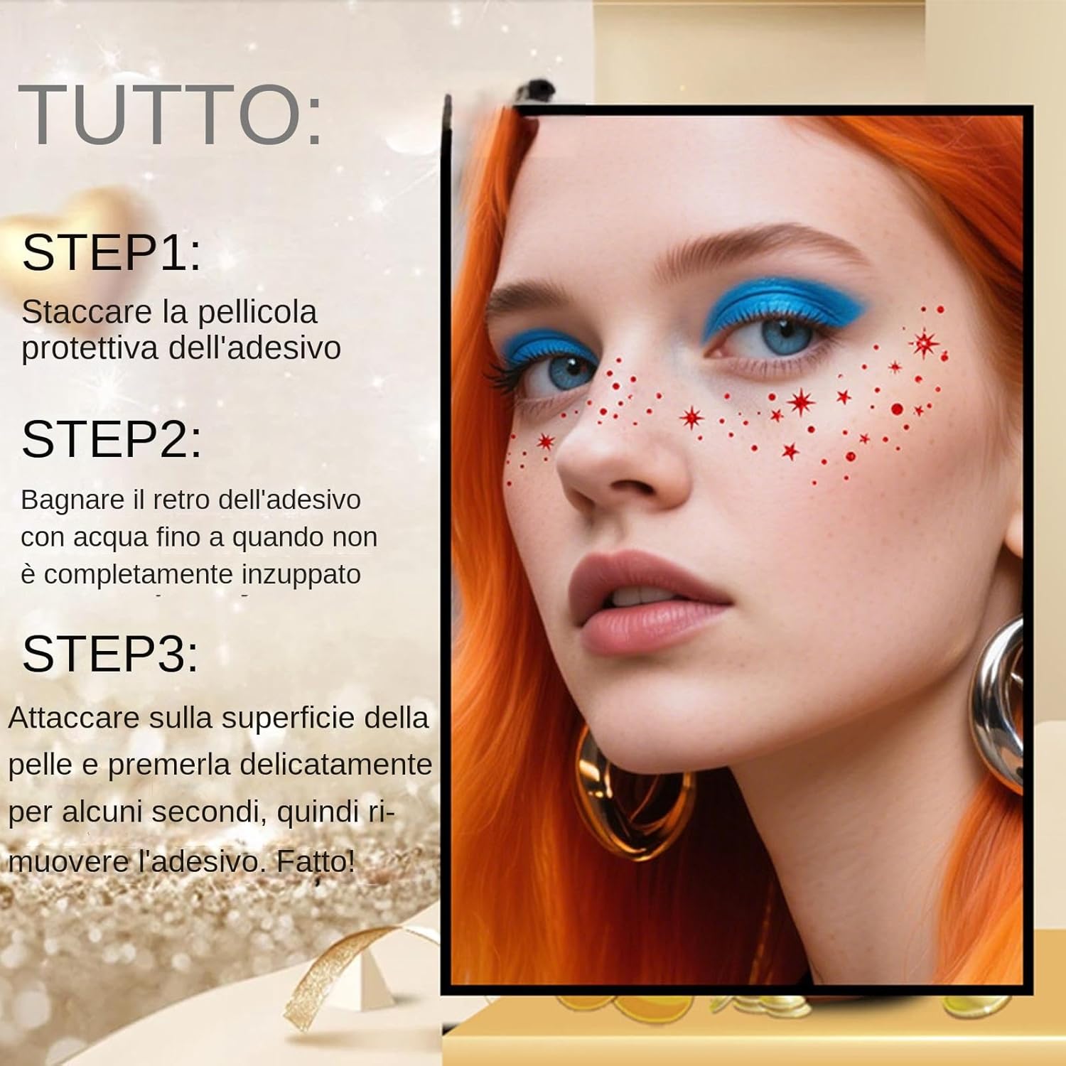 SoluZione Intelligente: Combina resistenza al sudore e protezione anti-sbavature con finitura naturale, potenziata dall'innovazione impermeabile che adatta il trucco agli sbalzi termici e umidità Design Tematici Unici: Trasforma il trucco quotidiano in un'esperienza creativa con motivi decorativi coordinabili a eventi stagionali, feste private o spettacoli, garantendo un effetto visivo armonioso senza necessità di competenze tecniche Adatto a tutti i tipi di pelle: Tessuto delicato e biocompatibile per pelli sensibili e normali, garantisce comfort prolungato senza causare arrossamenti o fastidi anche con utilizzo quotidiano continuativo. Ideale per qualsiasi esigenza cutanea grazie alla formula ipoallergenica testata. Soluzione veloce: un'esperienza di trucco senza intoppi con i 3 semplici passi peel, press e remove. L'applicazione di 60 secondi offre risultati impeccabili e un uso intuitivo Protezione dall'Umidità: Formula speciale contrasta l'umidità evitando deformazioni, assicurando adesione ottimale alla texture cutanea e copertura intatta per ore in condizioni climatiche sfidanti