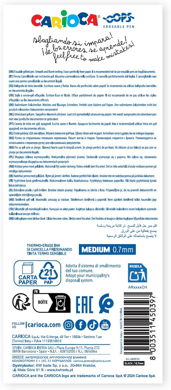 Prodotto: Confezione di 12 penne cancellabili ricaricabili con inchiostro termosensibile e doppia gomma. Penne con impugnatura ergonomica triangolare Funzionalità: Penna cancellabile ricaricabile con inchiostro termosensibile. Grazie alla doppia gomma, puoi cancellare gli errori ripetutamente senza danneggiare, con un semplice sfregamento Colore: Nero Utilizzo: Adatto per scuola e ufficio. Non raccomandata per la scrittura di documenti legali Extra: Punta Ø 0,7 mm. Refill compatibili universali con le principali penne cancellabili. Disponibile in 6 diversi colori