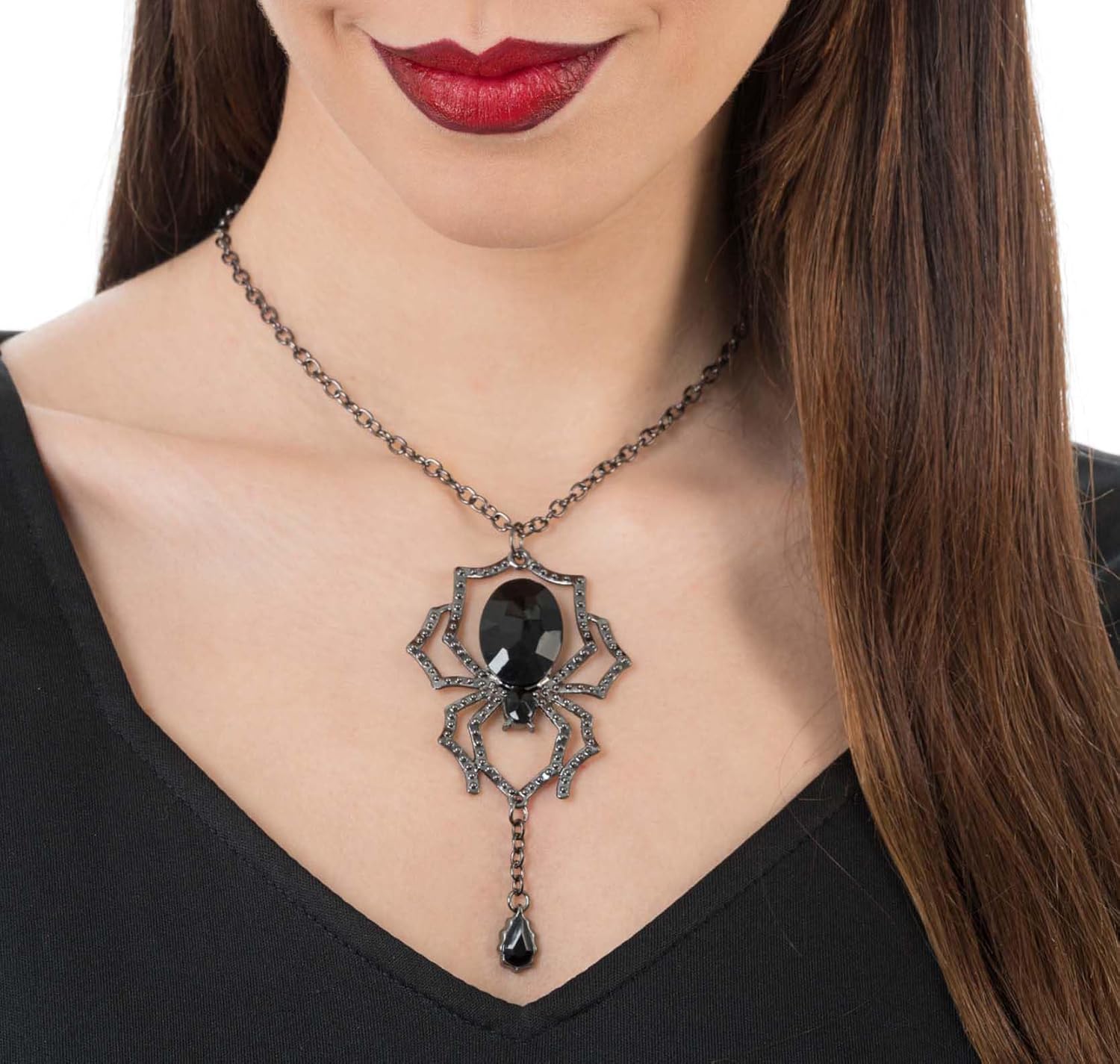 Descrizione Questa collana con un vistoso ciondolo a forma di ragno combina un design misterioso e materiali leggeri in un accessorio di grande effetto per Halloween, Carnevale o feste a tema. La grande pietra acrilica sfaccettata di un nero intenso conferisce al gioiello una lucentezza affascinante, mentre il ragno in lega di alluminio lavorato con grande attenzione ai dettagli garantisce stabilità e un piacevole comfort. Grazie al suo aspetto distintivo, la collana completa in modo efficace costumi da strega, gotici e fantasy, così come look quotidiani stravaganti. Con una chiusura sicura e una lavorazione resistente, è una scelta elegante per tutti coloro che desiderano sottolineare il proprio stile individuale con un tocco di drammaticità. Avviso di sicurezza Warning! ADULT PRODUCT. This product is not a toy and is not designed or intended for children under 14 years of age. Contenuto della confezione Collana Visualizza di più