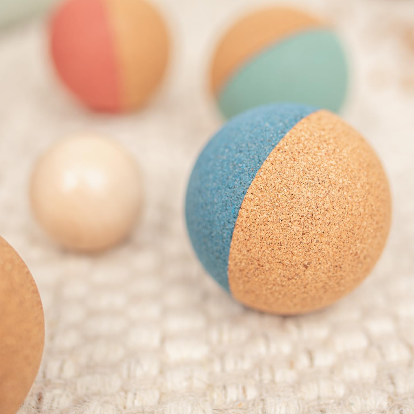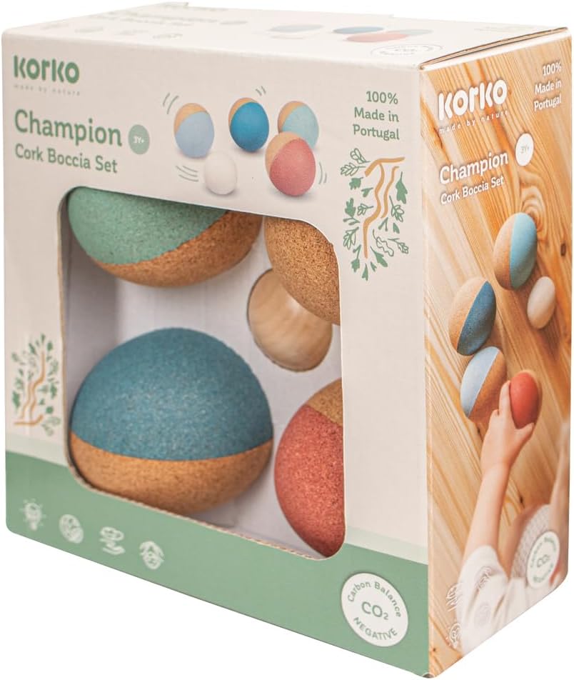 Set bocce Migliora la coordinazione occhio-mano Materiale: sughero Contenuto: 4 sfere di sughero, 1 sfera di legno Dai 18 mesi in su