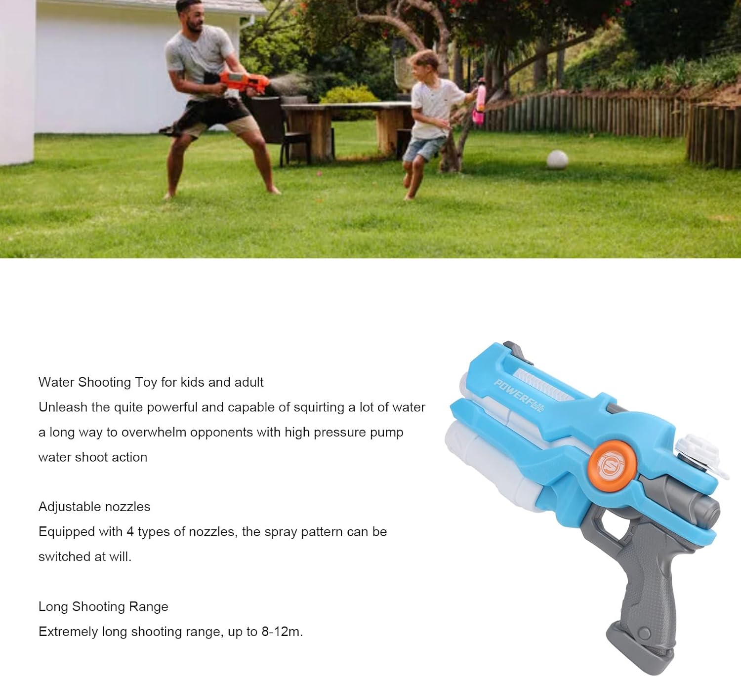 [Emozionanti battaglie acquatiche] Goditi emozionanti battaglie acquatiche con amici o familiari in piscina o in spiaggia utilizzando il nostro giocattolo da tiro in acqua ad alta capacità. [Opzioni versatili degli ugelli] Dotato di 4 ugelli che consentono di alternare tra le modalità di spruzzo morbido e duro per un gioco mirato. [Portata impressionante] Ottieni capacità di tiro a lungo raggio da 26 a 39 piedi, garantendo battaglie acquatiche emozionanti e coinvolgenti a distanza. [Design facile da usare] Questo meccanismo di estrazione intuitivo rende facile per bambini e adulti iniziare la loro lotta in acqua in qualsiasi momento. [ per il divertimento estivo] Ideale per feste a bordo piscina, gite in spiaggia o appuntamenti di gioco in giardino, creando ricordi estivi indimenticabili.