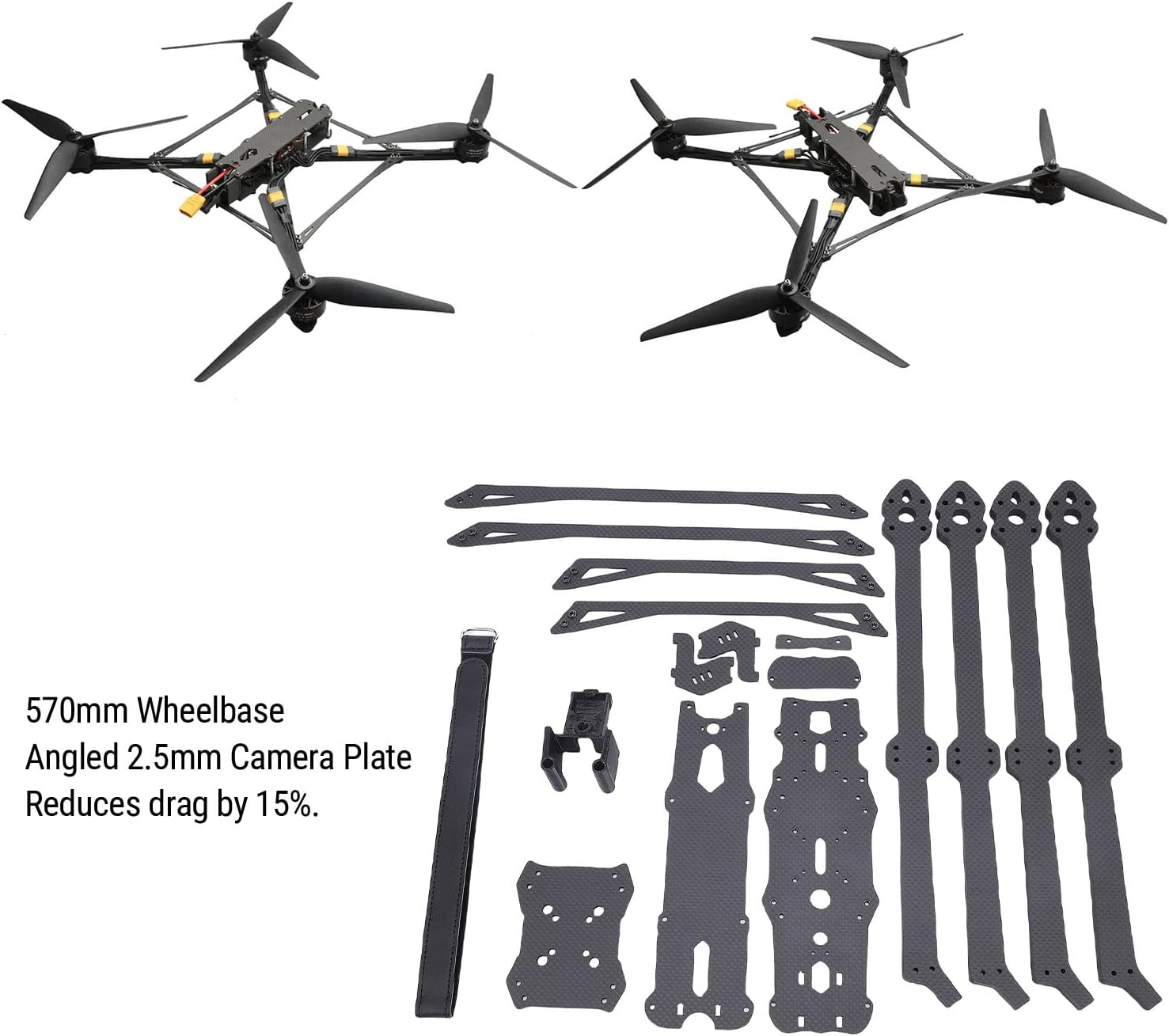 [Configurazione versatile del drone] Supporta doppi controller di volo e supporti video per una perfetta integrazione con le telecamere O3 e HDZero. [Prestazioni ad alta velocità] Raggiunge velocità superiori a 80 miglia all'ora con un passo di 570 mm ed è compatibile con eliche da 13" e 15". [Robusta costruzione in carbonio] Presenta bracci monoscocca in fibra di carbonio da 8 mm che possono resistere a oltre 100 impatti per un uso duraturo. [Design aerodinamico] La piastra della fotocamera angolata da 2,5 mm riduce la resistenza al vento del 15%, migliorando l'efficienza e le prestazioni di volo. [Elevata capacità di carico utile] Può ospitare fino a due batterie 6S da 10.000 mAh e consente di collegare dispositivi aggiuntivi come sensori LiDAR o telecamere cinematografiche.