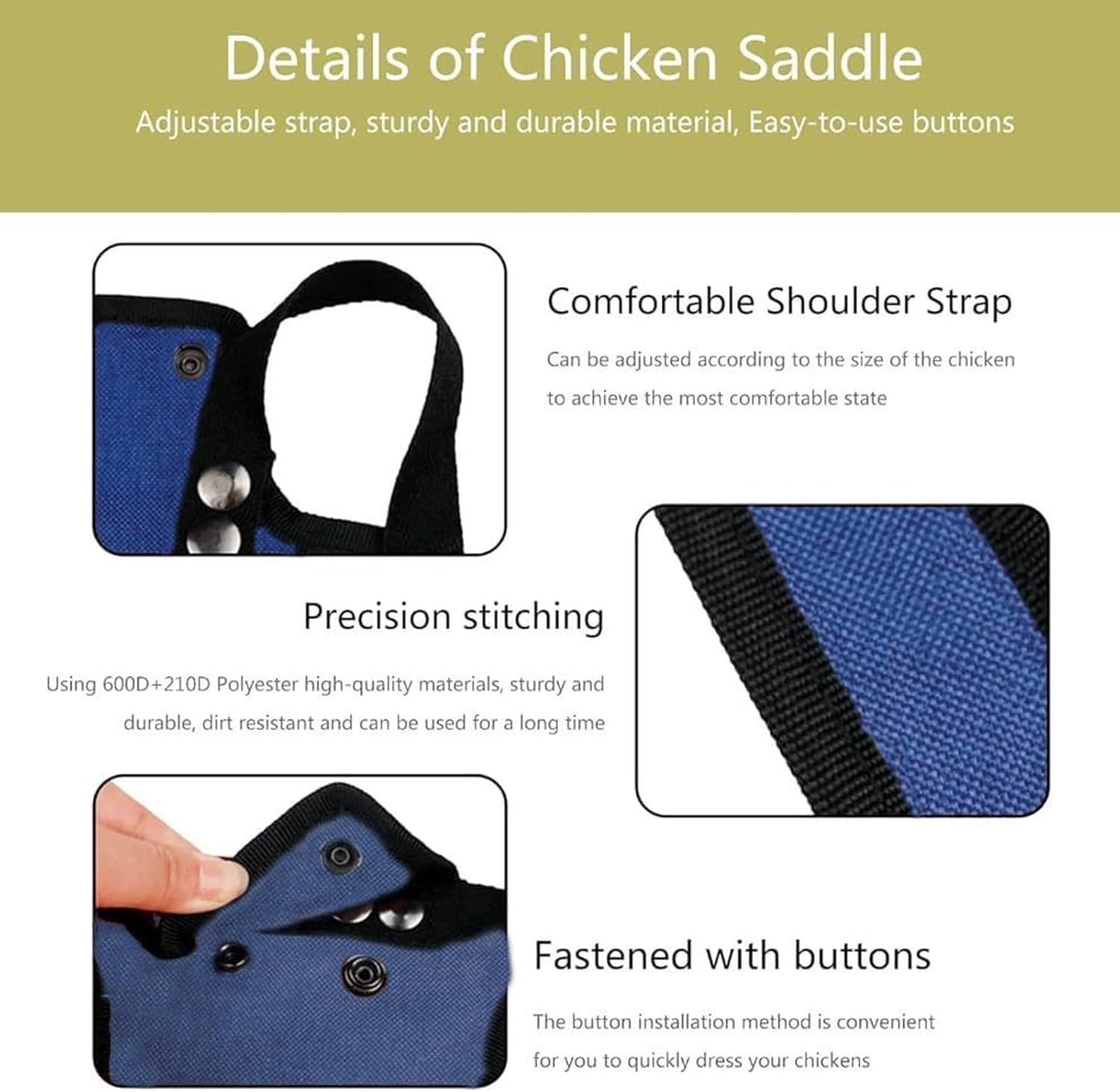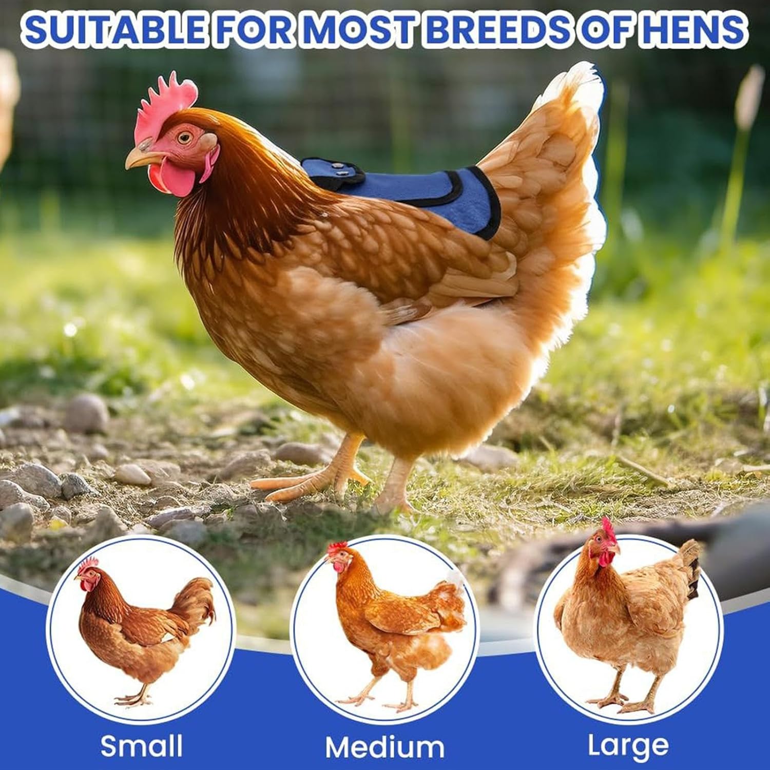 Protective Wing Shield: Designed to hens wings and backs from pecking or injury, this chicken saddle provides gentle coverage that reduces damage during mating, nesting, or flock interaction, helping maintain healthy plumage Adjustable Fit Straps: Features adjustable straps that secure the saddle comfortably around your hen’s body, ensuring a snug but gentle fit that won’t restrict movement or cause discomfort during daily activities or outdoor roaming Sturdy Lightweight Material: Crafted from breathable yet sturdy fabric, this vest jacket is durable enough for outdoor use but light enough to allow hens freedom to move, scratch, and forage without interference or overheating Easy to Use Design: Easy to put on and remove, the saddle makes poultry care easier for backyard farmers or pet owners, saving time while protecting valuable hens from loss or injury in mixed flocks Multi-Purpose Poultry Gear: Ideal for breeders, pet chicken keepers, or small farms, this protective vest assists in maintaining bird health during molting, breeding, or introducing new flock members, offering practical wing and back coverage