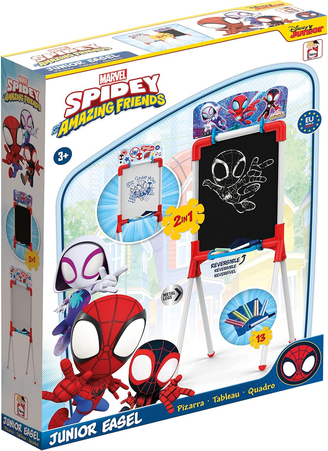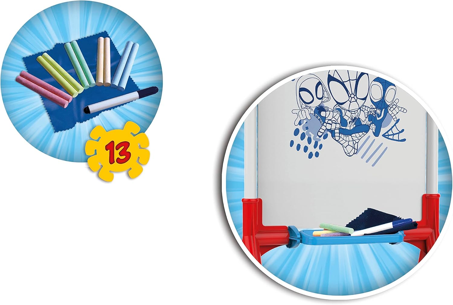 Lavagna reversibile: per gessetti sulla lavagna e pennarelli cancellabili sul viso di colore bianco Include 10 gessetti colorati, un pennarello cancellabile, un panno per cancellare e uno stencil Spidey e i suoi amici La Lavagna 2 in 1 Spidey è dotata di una struttura in tubo metallico, che garantisce solidità e durata e la sua altezza è per l'età in cui è destinata Altezza della lavagna: 98 cm Le lavagne sono ottimali nella prima infanzia, disegnare, dipingere e scrivere stimola la creatività, la concentrazione, l'attenzione e la capacità di espressione dei piccoli; consigliato dai 36 mesi in su