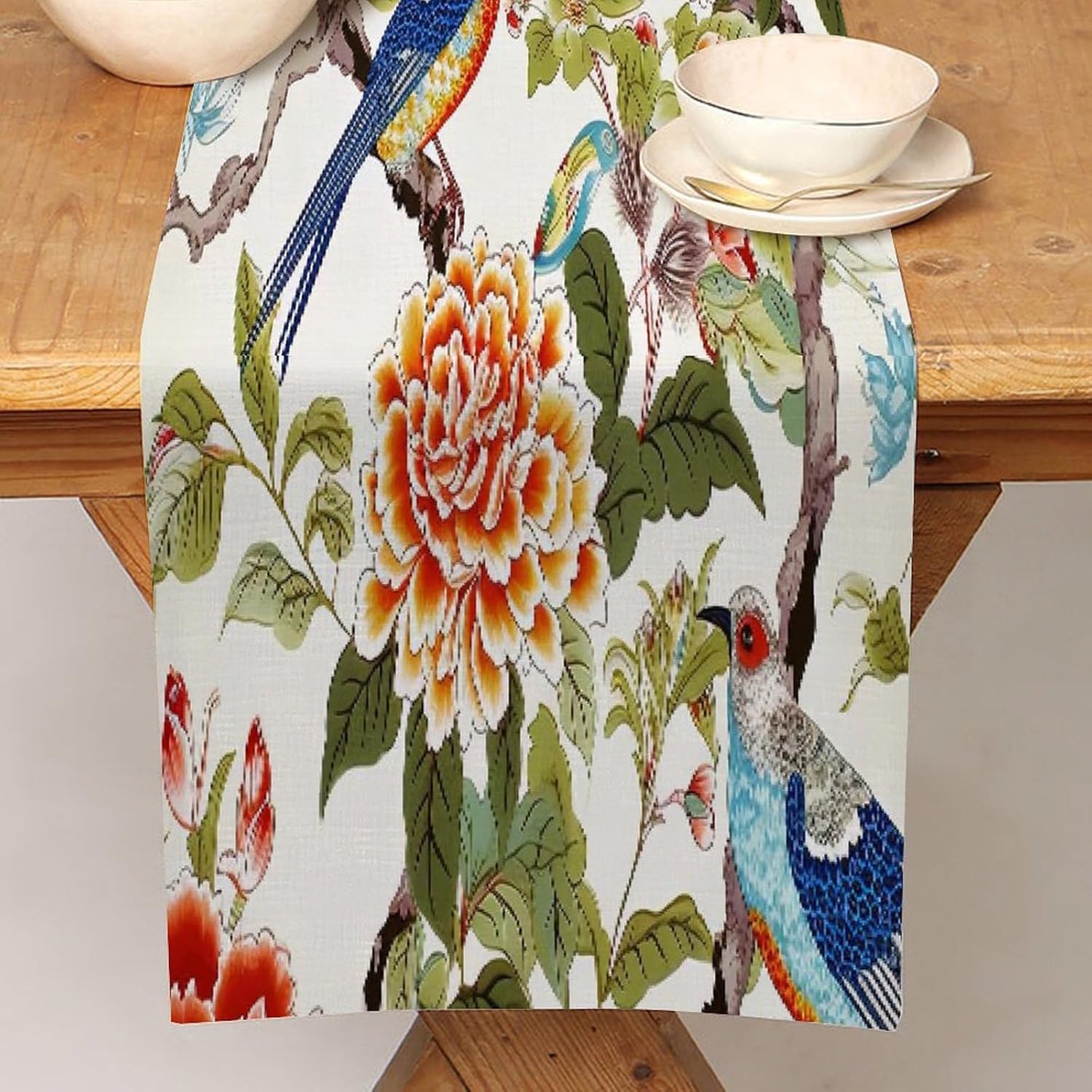 Chinoiserie, runner da tavola in iuta rustico, facile da pulire, con albero, peonia, uccello, floreale, corallo, turchese, 45,7 x 198,1 cm, rustico, facile da pulire, per soggiorno, cena, casa