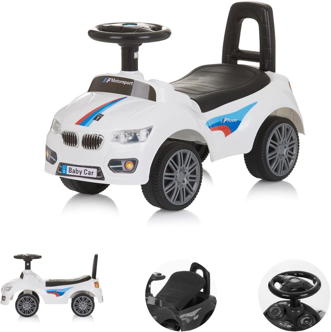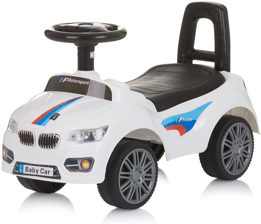 Auto cavalcabile per bambini a partire da 3 anni e peso massimo di 25 kg Pulsanti sul volante, funzione musicale con diverse melodie, sedile comodo, spazio di stivaggio sotto il sedile, clacson, adatto per uso interno ed esterno, pneumatici in plastica, volante antiscivolo per una buona presa, stimola lo sviluppo delle capacità motorie e della coordinazione del bambino, schienale per una sicurezza ottimale e anche come ausilio per camminare per spingere