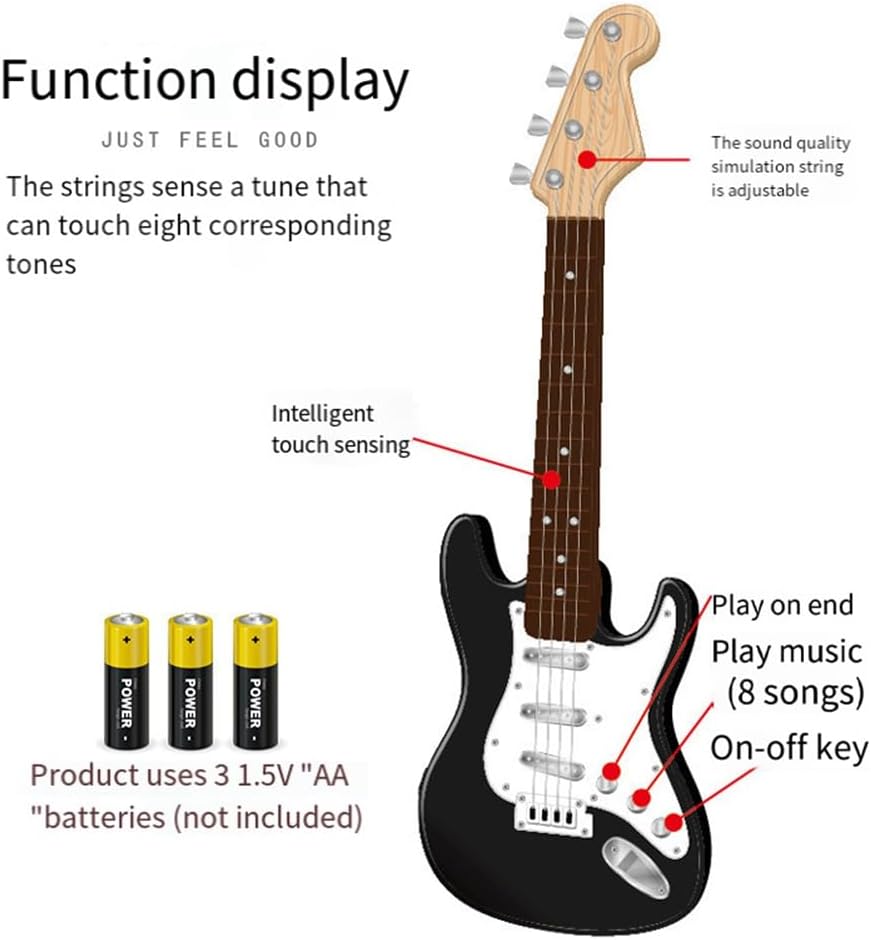 Corde per chitarra regolabili: i giocattoli per chitarra sono dotati di 4 corde. Corde diverse (corde regolabili da stringere o allentare tramite il pulsante testa) con ondulazioni diverse produrranno suoni diversi. Attraverso il ritmo del dito, lascia che il bambino distingua le scale per esercitare l'acutezza 'udito del bambino. Giocattoli per chitarra portatili: il giocattolo per chitarra elettronica per bambini è dotato di tracolla posteriore, facile da trasportare. E la chitarra giocattolo da 3 batterie AA (non incluse), la dimensione è di circa 17 x 6 x 1,6 pollici, pesa 0,77 libbre. Si prega di prestare attenzione alle dimensioni prima 'acquisto. Materiale sicuro: chitarra per bambini realizzata in materiale ecologico ABS di alta qualità per garantire la sicurezza dei bambini. regalo: gli strumenti musicali per chitarra giocattolo fanno sì che i bambini apprezzino la musica meravigliosa, un grande regalo musicale per bambini e chitarra per principianti.