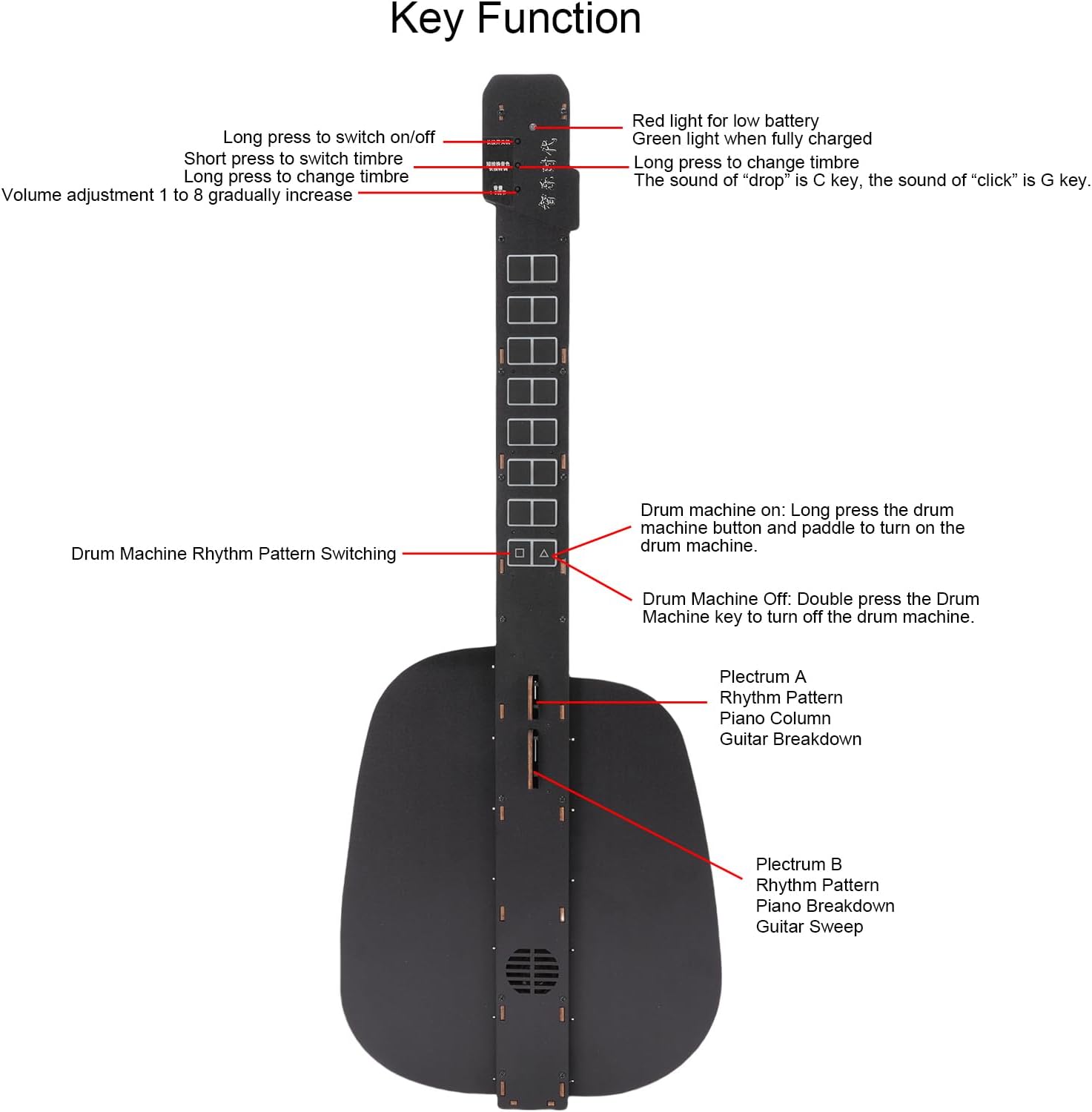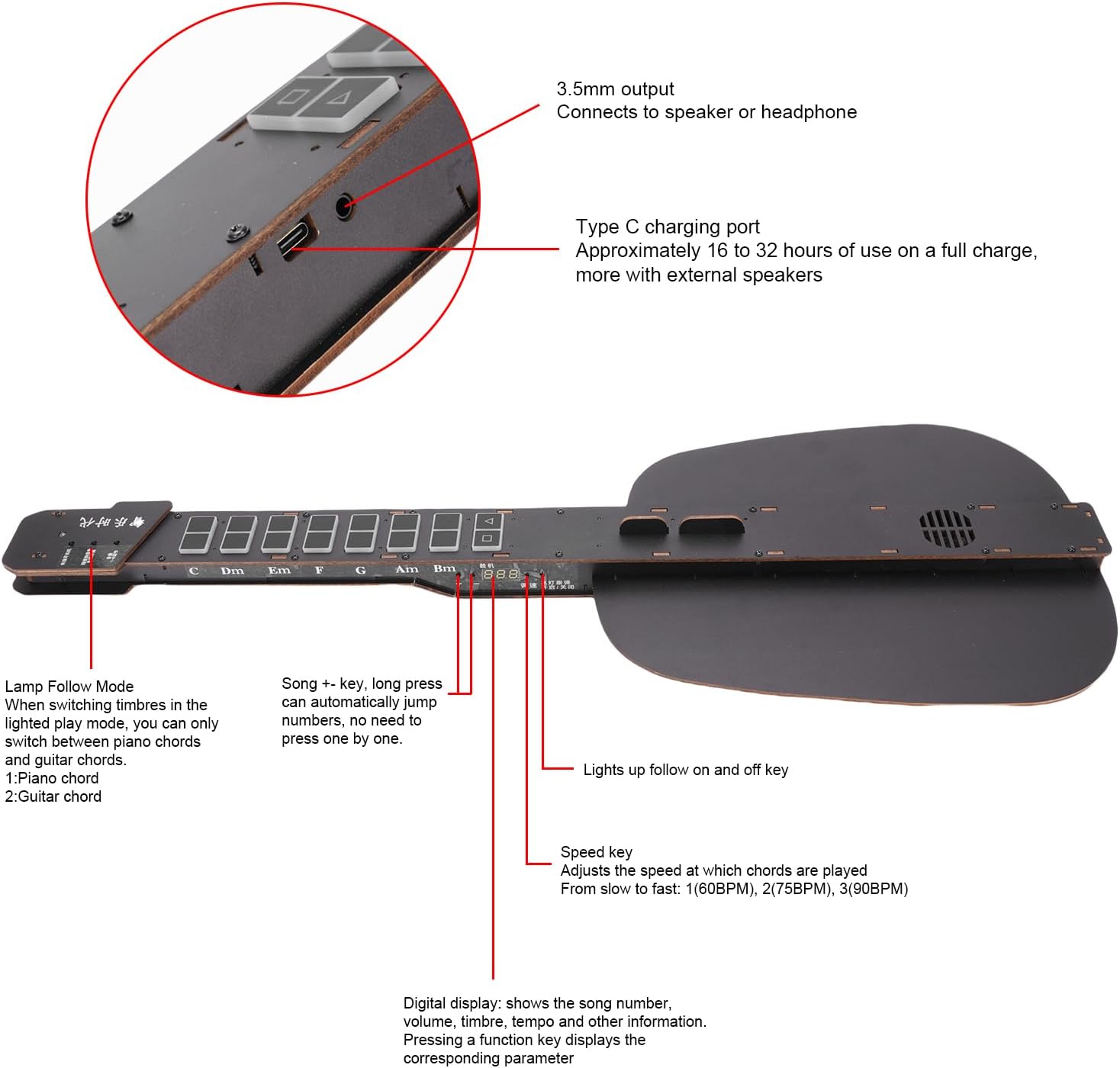 Uscita audio flessibile: fornisce una porta di uscita audio da 3,5 mm, che consente la connessione ad altoparlanti o cuffie, consentendo di passare senza problemi tra persona e azioni, adattandosi a diversi scenari. Design unico senza ferro: sperimenta una chitarra intelligente senza ferro da stiro con un esterno in legno distintivo. Mantiene la silhouette iconica della chitarra introducendo stile di gioco unico, dando potere alla creatività musicale. Automazione adatta ai principianti: con una modalità automatica ideale per i principianti per padroneggiare rapidamente le tecniche di suono, la chitarra senza ferro supporta la ricarica di tipo C per la compatibilità con i normali dispositivi elettronici, fornendo una ricarica comoda e veloce. Selezione versatile del suono: passa facilmente da sei suoni degli strumenti integrati, tra cui chitarra, pianoforte, batteria, chitarra elettrica, sassofono e Guzheng, catering per diversi stili musicali e esigenze di performance. Lunga durata della batteria: dotata di una batteria da 1800 mAh, la chitarra senza ferro completamente carica offre circa 16-32 ore di riproduzione, mentre il tempo di utilizzo prolungato con altoparlanti esterni consente di ascoltare musica senza limitazioni di corrente.
