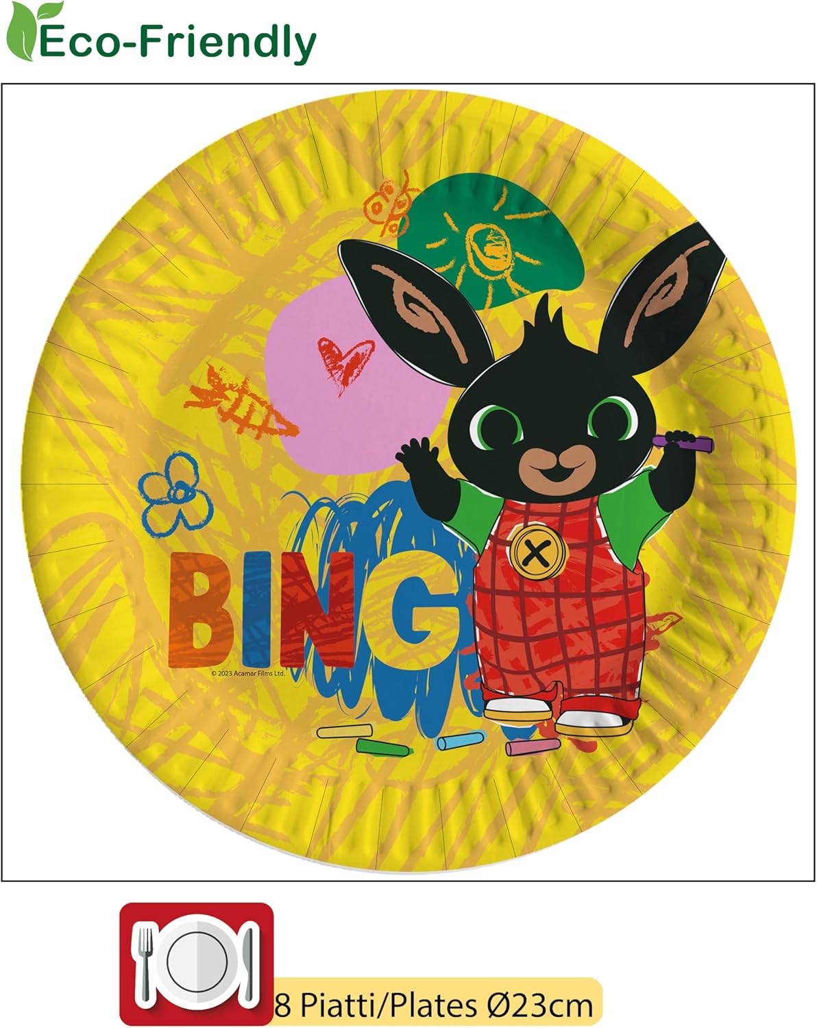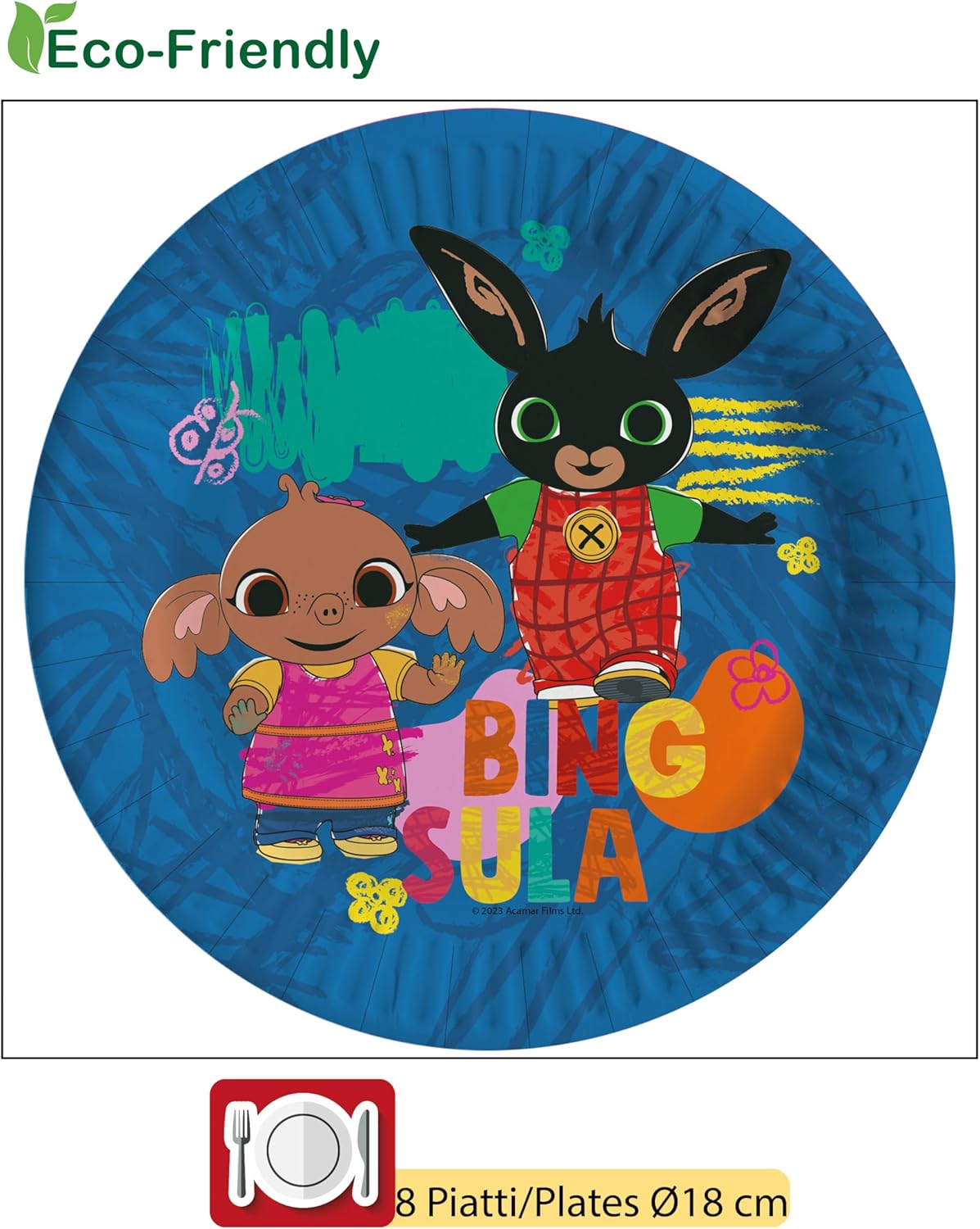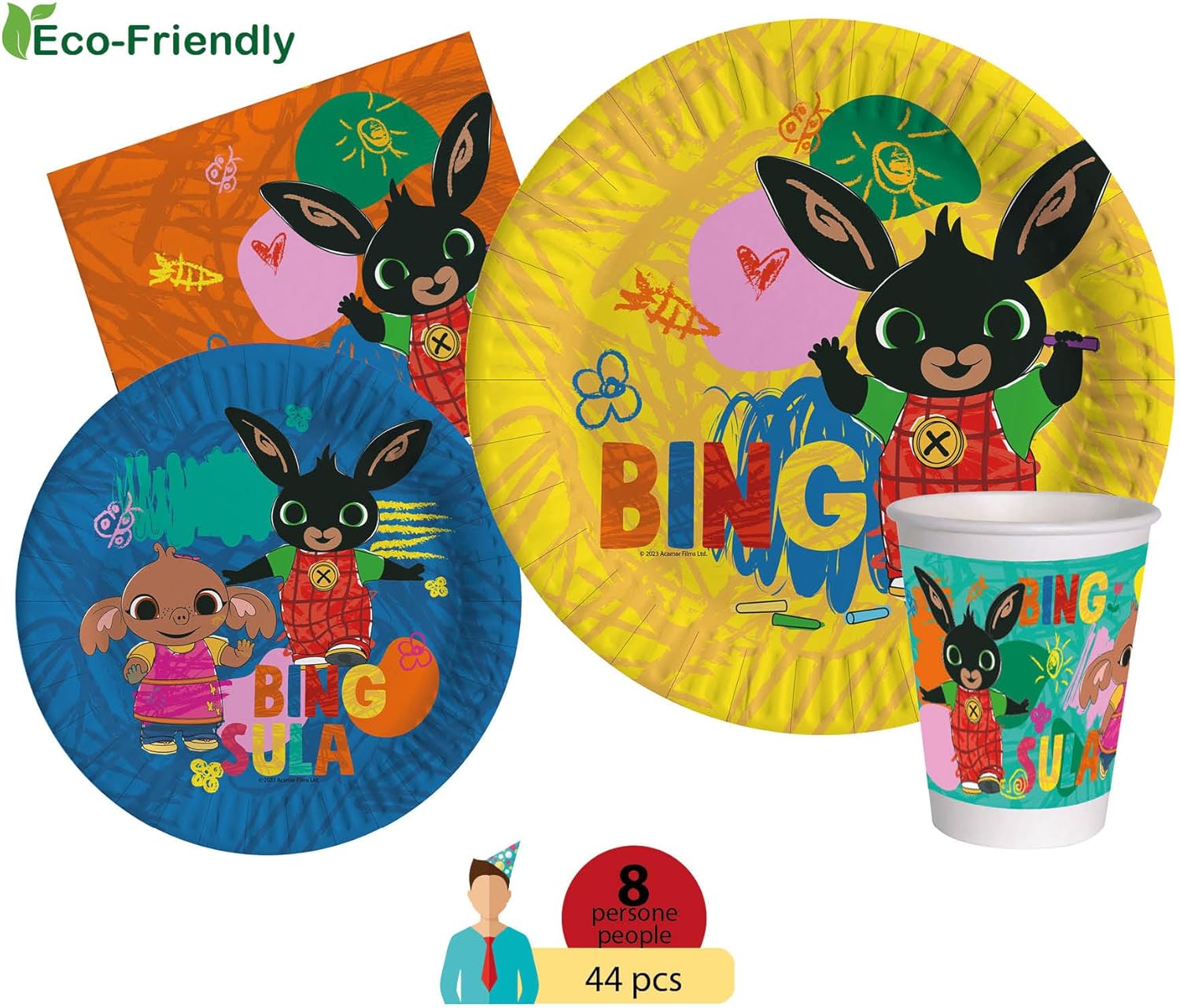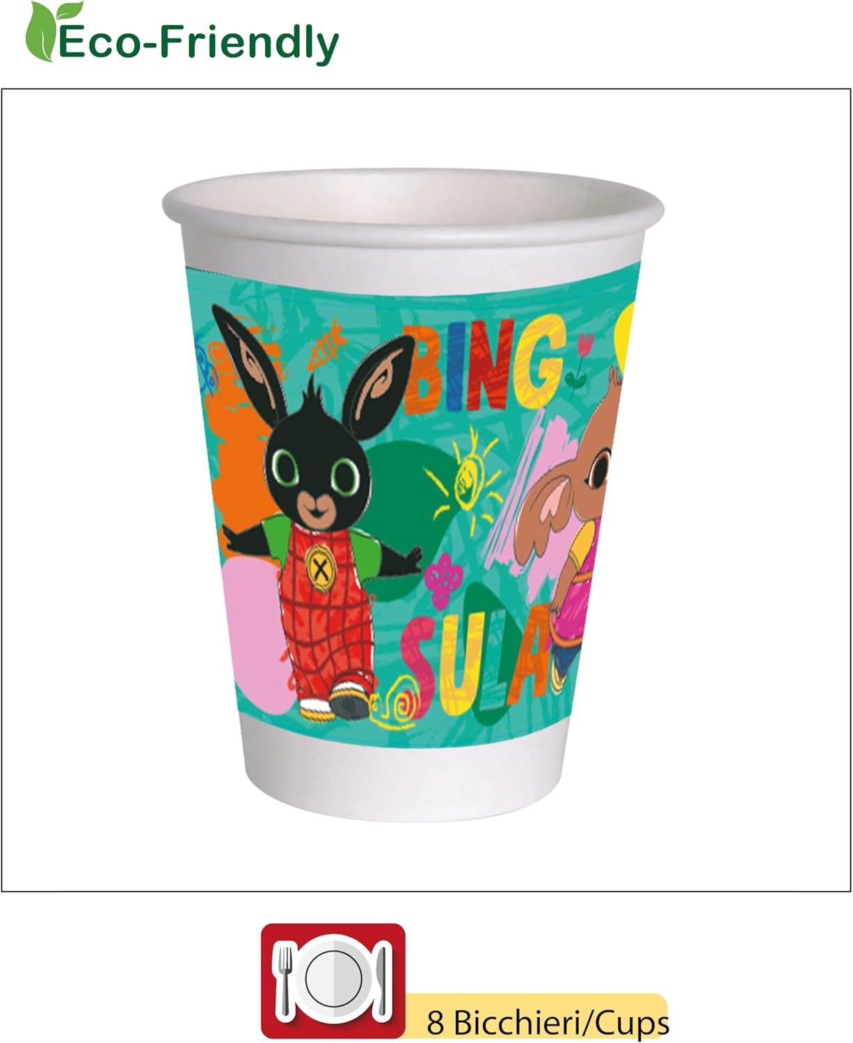 Prodotto originale licenziato Bing Contenuto: 8 piatti Ø23cm, 8 piatti Ø18cm, 8 bicchieri 250ml, 20 tovaglioli 33x33cm Prodotti in carta compostabile eco-friendly, conformi alle nuove normative. Occasioni: Compleanni, party, feste a tema, anniversari, celebrazioni, festeggiamenti, allestimenti, composizioni, eventi