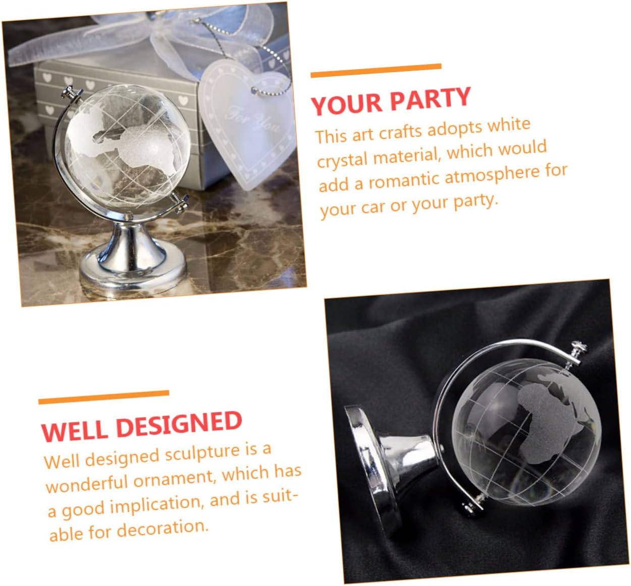 Decorazione del mappamondo da tavolo: materiali preferiti, sicuri e pratici. Decorazione del globo geografico: il design è squisito, alla moda e versatile e può essere applicato molto bene alla decorazione degli interni, aggiungendo un'atmosfera calda e romantica. Globo terrestre rotondo: scegli liscio e cristallo, luminoso, e pratico. Mappamondo da scrivania: con un aspetto trasparente e un tocco morbido, è un ornamento da scrivania molto e pratico. Arredamento: il design del globo è vivido e unico, che può conquistare meglio l'amore delle persone.