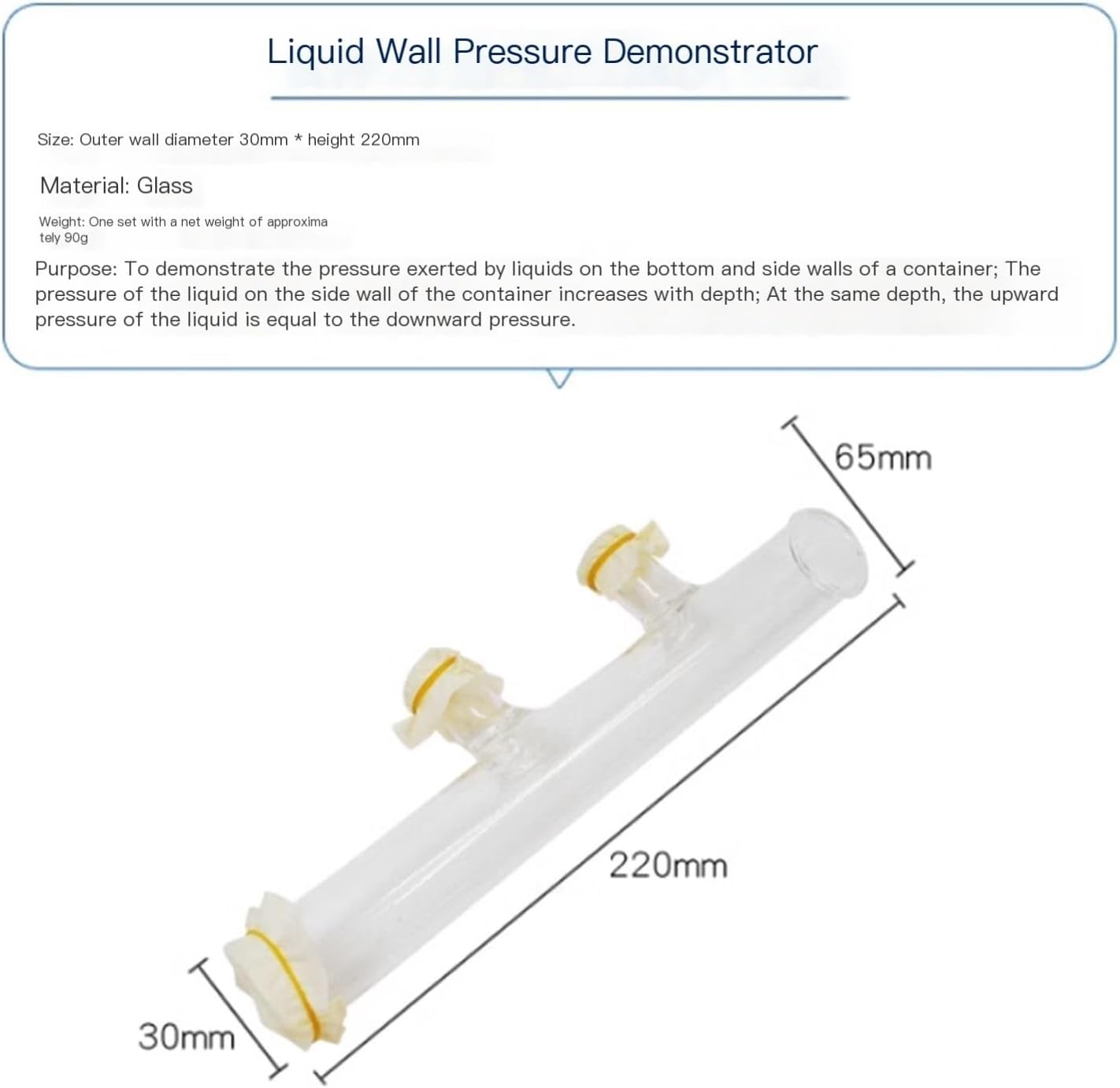 Dimensioni: diametro parete esterna 30 mm * altezza 220 mm Materiale: Vetro Peso: Un set con un peso netto di circa 90 g Scopo: dimostrare la pressione esercitata dai liquidi sul fondo e sulle pareti laterali di un contenitore; la pressione del liquido sulla parete laterale di un contenitore varia con la profondità Aumentare e ingrandire; alla stessa profondità, la pressione verso l'alto del liquido è uguale alla pressione verso il basso.