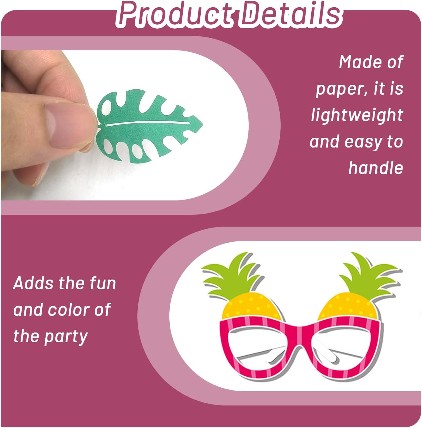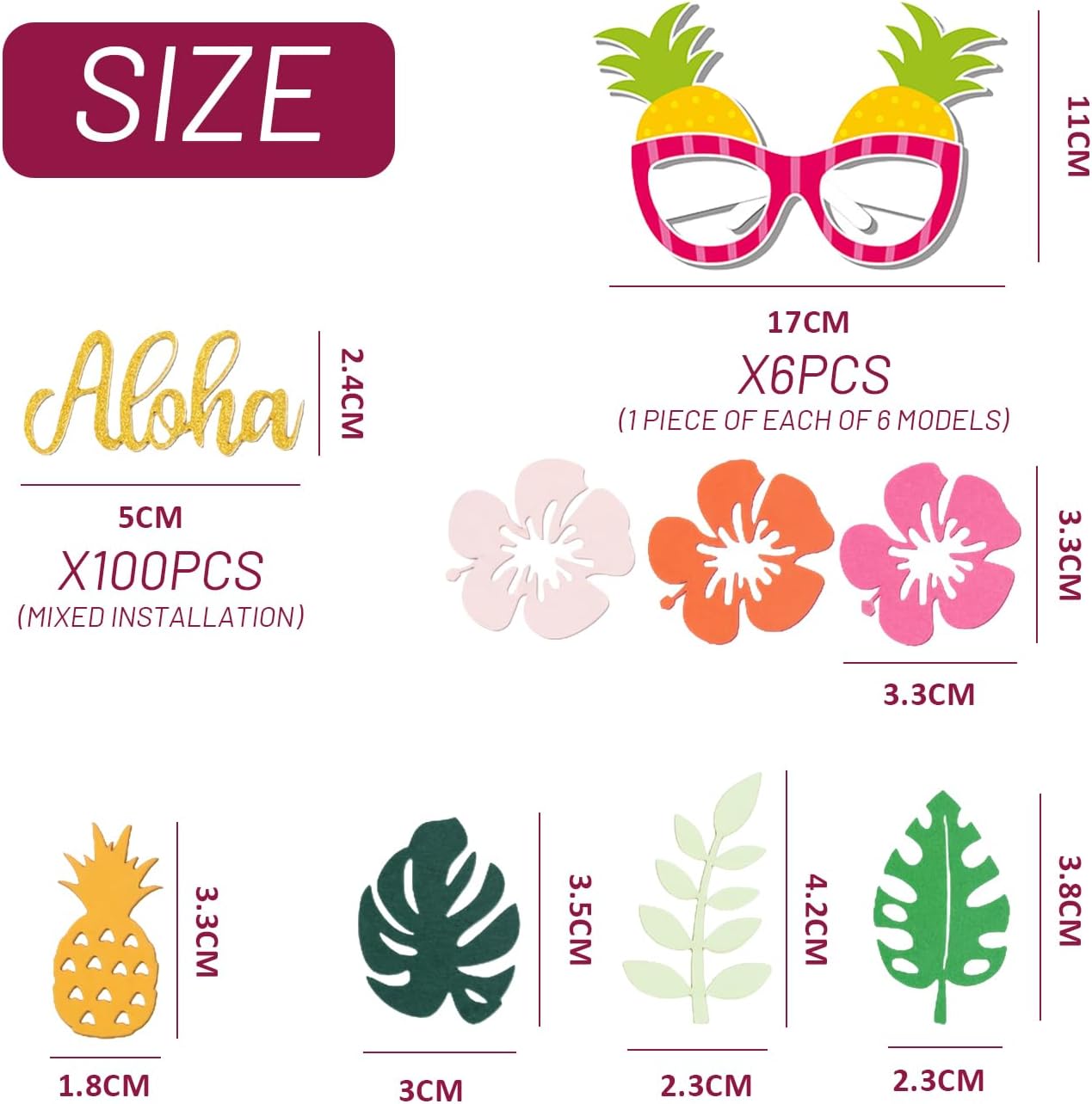 【Contenuto Del Prodotto】 Ottieni 100 Pezzi Di Coriandoli E 6 Occhiali Da Frutta Di Carta. I Coriandoli Sono 100 Pezzi E Gli Occhiali Da Frutto Sono 14*13 Cm. I Colori Sono Miscelati Adatti Alla Decorazione Del Partito Hawaiano. 【Materiale Del Prodotto】 Questo Prodotto È Costituito Da Carta Che È Facile E Facile Da Usare. La Carta Non È Solo Rispettosa Dell'Ambiente, Ma Consente Anche Che Le Decorazioni Vengano Facilmente Pulite Dopo L'Uso, Il Che La Rende Ideale Per La Decorazione Di Una Festa. 【Design Creativo】 Questo Prodotto È Unico, Tra Cui Coriandoli E Occhiali Da Frutta Creativi Che Contribuiscono Al Divertimento E Al Colore Della Festa. Gli Occhiali Da Frutto Vedono Un Look Carino Che Si Combina Perfettamente Con Il Tema Hawaiano E Diventa Un Punto Culminante Della Festa. 【Facile Da Usare】 Questo Prodotto È Facile Da Usare E Può Creare Una Scena Di Festa Piena Di Stile Hawaiano Con Solo Una Semplice Disposizione. I Coriandoli Possono Essere Cosparsi Sul Tavolo O Sul Pavimento, Mentre Gli Occhiali Da Frutto Possono Essere Usati Come Oggetti Di Scena Per Gli Ospiti Che Aumentano L'Interattività Della Festa. 【Ampliato】 Questo Prodotto È Molto Adatto Per Feste A Tema Hawaii, Feste Di Compleanno, Riunioni Di Famiglia E Altre Occasioni. Non Può Essere Usato Solo Come Decorazione Desktop, Ma Anche Come Richiesta Fotografica Per Dare Gioia E Divertimento Al Tuo Evento.
