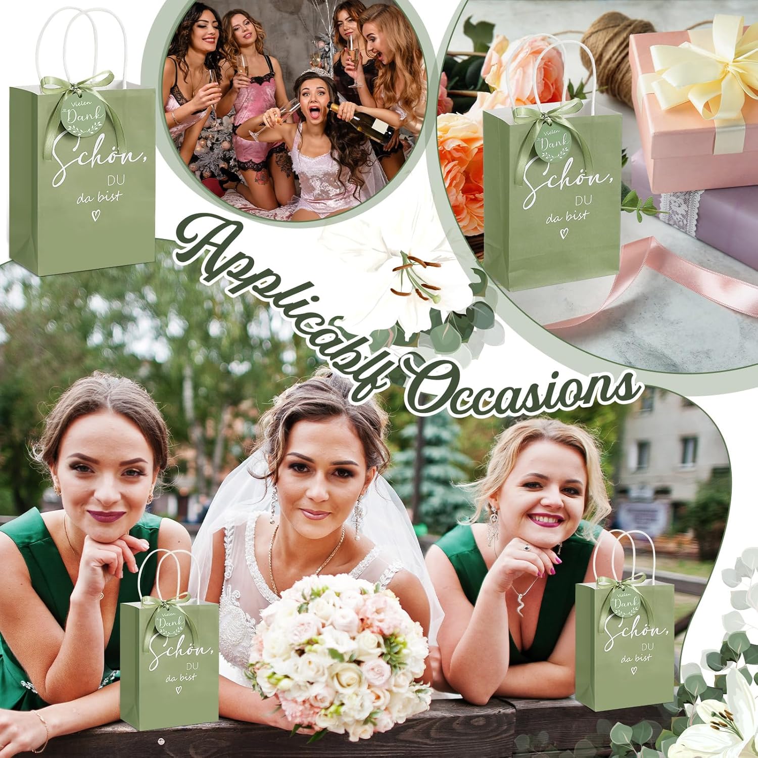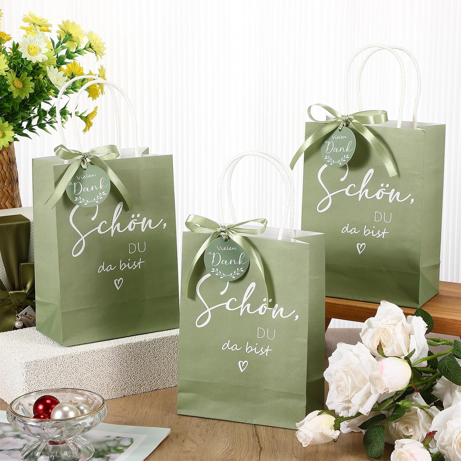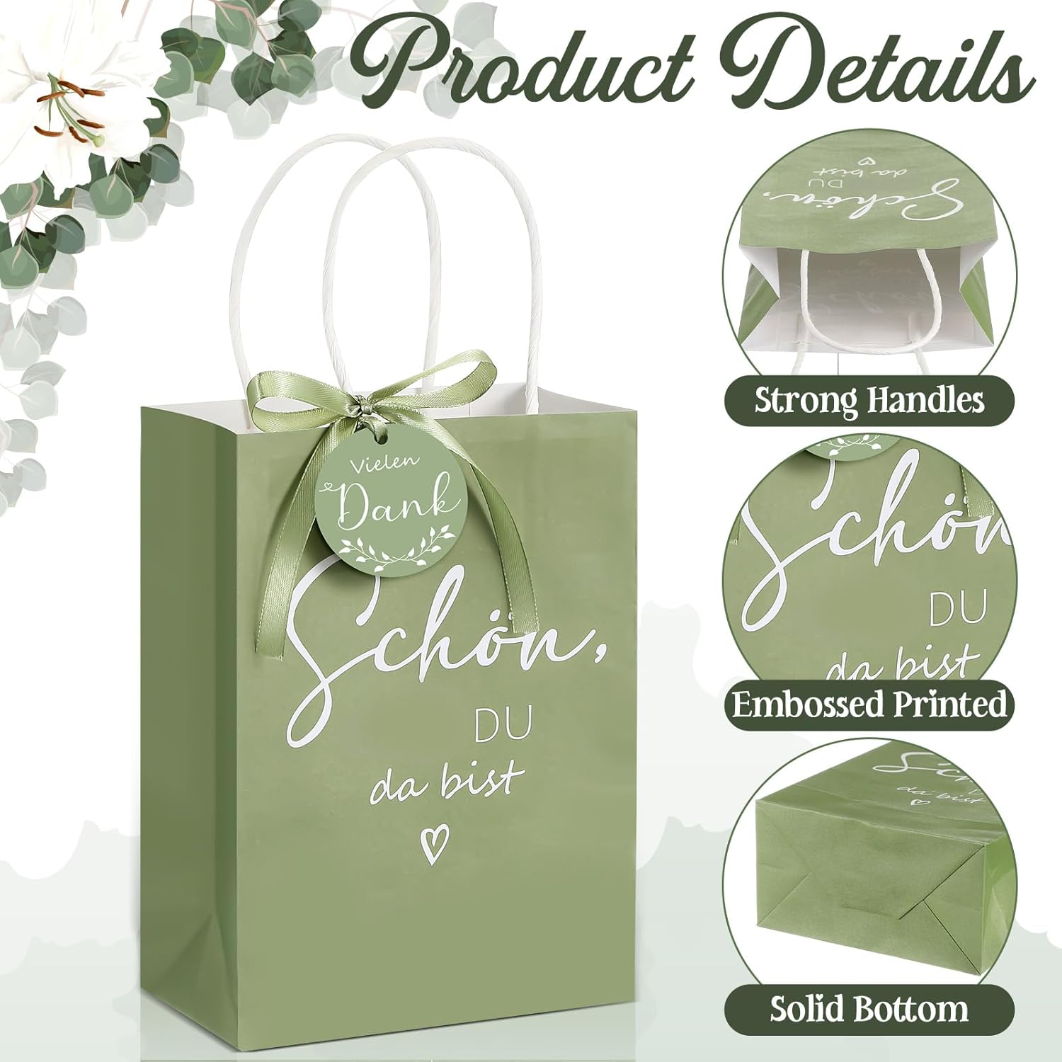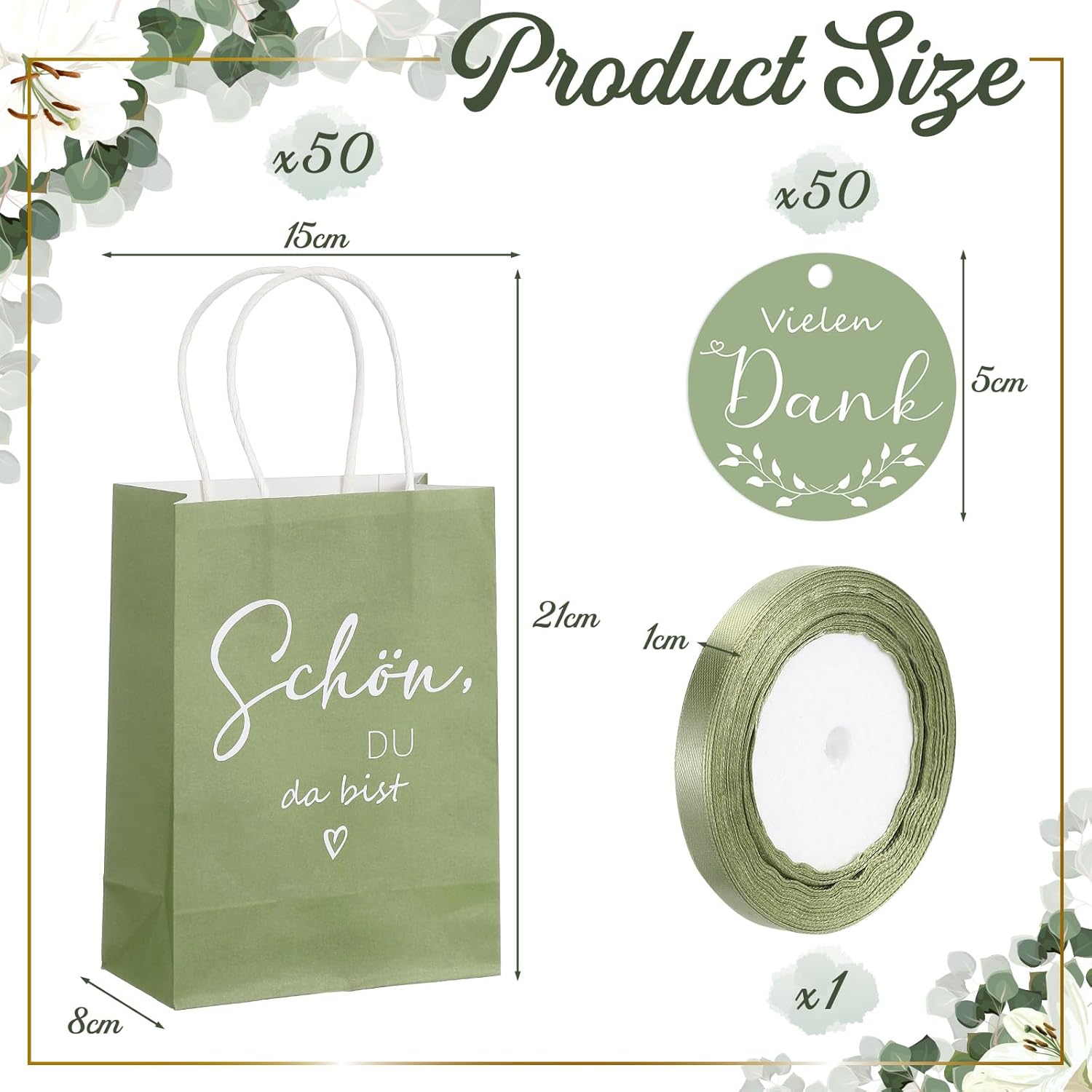 Dettagli del prodotto: Ogni set contiene 50 sacchetti di carta 21 x 15 x 8 cm, 50 cartellini 5 x 5 cm e un rotolo di nastro 220 x 1 cm. La quantità è sufficiente per soddisfare le esigenze di regali per gli ospiti. L'intero set di sacchetti regalo per gli invitati al matrimonio è verde salvia e il design è semplice. Materiale e design del sacchetto di carta elegante e rinfrescante: il sacchetto di carta verde salvia con manico è realizzato in carta di alta qualità con spessore medio, che è robusto e durevole pur riflettendo uno stile naturale. Ogni sacchetto di carta è progettato con cura con una superficie liscia che non si consumerà facilmente. Anche la maniglia del sacchetto di carta è robusta e durevole e non si rompe facilmente. Funzione e bellezza del cartellino: il cartellino grazie presenta uno stile semplice ma elegante con una dimensione di 5 x 5 cm. Il design dell'etichetta appesa non mostra solo le parole "Grazie mille", che esprimono rispetto e gratitudine verso i clienti, ma anche un delicato motivo a foglie che migliora ulteriormente il look. I molteplici usi possibili dei nastri: I nastri regalo verde salvia sono un ottimo modo per enfatizzare la bellezza della confezione dei prodotti. Grazie alla larghezza moderata del nastro, molti tipi di imballaggio si adattano insieme, sia che si tratti di una semplice rilegatura o di un bellissimo fiocco, può essere presentato in modo efficace. Decorare con nastri rende ogni regalo più premuroso e unico ed è ottimo per le feste di matrimonio. Coordinazione generale: la combinazione di sacchetti di carta, nastri ed etichette verde salvia non è solo coordinata a colori, ma è anche coerente con lo stile di design generale. L'uso di questo colore trasmette visivamente una sensazione accogliente e le borse per feste di matrimonio sono particolarmente adatte per distribuire souvenir agli ospiti durante le celebrazioni nuziali