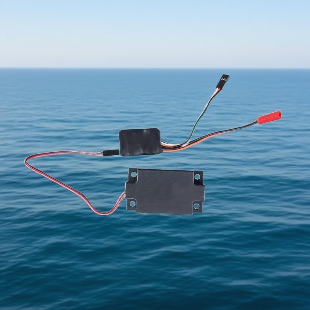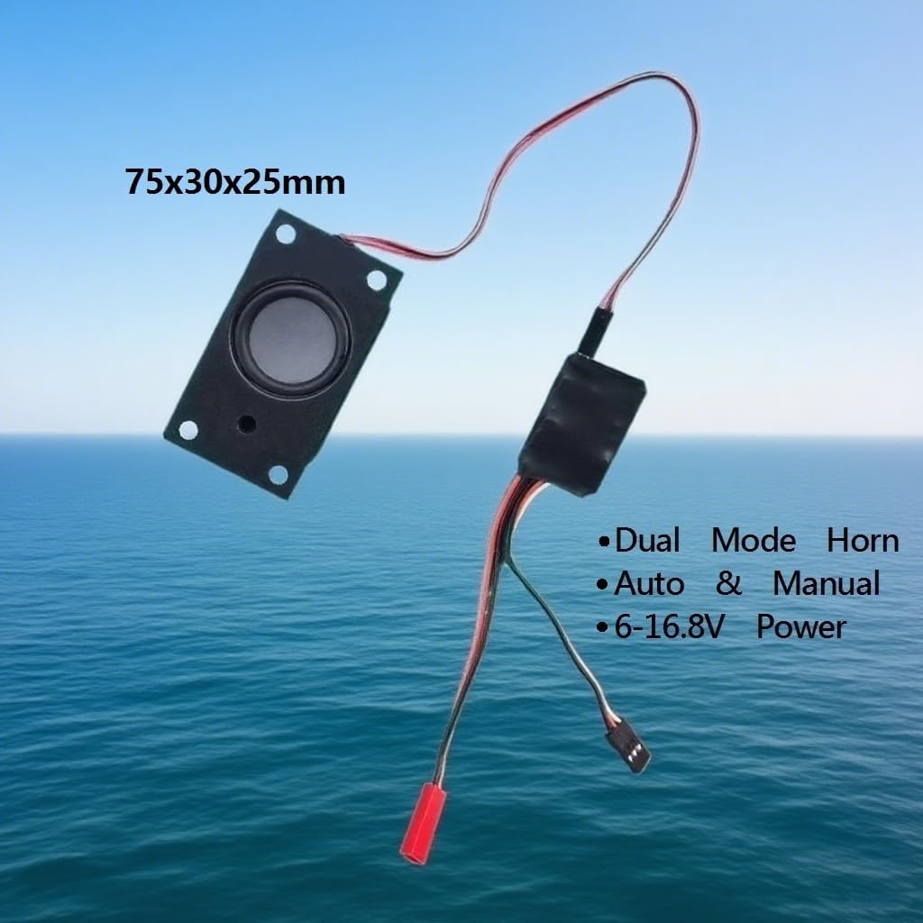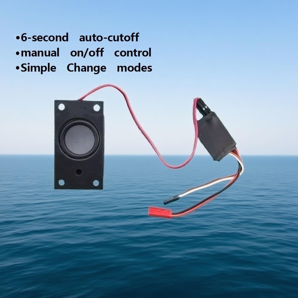 DOPPIA MODALITÀ DI FUNZIONAMENTO: Scegli tra il taglio automatico di 6 secondi (suono di coda autentico e decadente) o il controllo manuale di accensione/spegnimento, for tutto il tempo che desideri. Premi una volta il pulsante del terzo canale del telecomando for un realismo immediato o for suoni personalizzati. INSTALLAZIONE PLUG-AND-PLAY: Si collega direttamente al canale di commutazione del ricevitore. Nessun cablaggio complesso: gli hobbisti di tutti i livelli possono installarlo in pochi minuti. SUONO MARINO: Progettato con un'acustica autentica da sirena navale. Senti il suono profondo e risonante di 6 secondi con dissolvenza naturale: i tuoi modelli in scala suoneranno come imbarcazioni vere. COMPATTO E UNIVERSALE: alimentazione indipendente da 6-16,8 V, intervallo di tensione flessibile e dimensioni ridotte di 75x30x25 mm, adatte alla maggior parte dei sistemi RC. CAMBIO MODALITÀ FACILE: Cambia modalità in pochi secondi: Spegnimento del ricevitore → Tieni premuto il pulsante della scheda di controllo → Accensione del ricevitore → Rilascia il pulsante. Non sono necessari attrezzi o programmazione.