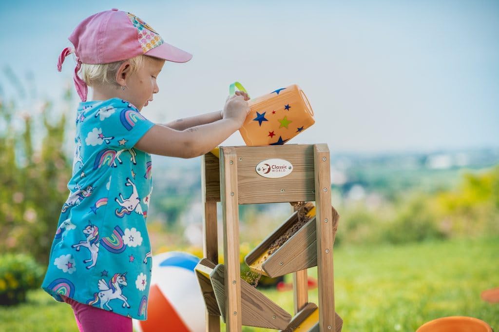 Scivolo in legno per bambini: un giocattolo ideale per i piccoli esploratori che si divertono a sperimentare e scoprire. Riempi l'imbuto di sabbia e osservalo fluire da un lato all'altro, scolpendo piccoli tumuli di sabbia e valli e stimolando l'immaginazione. Legno di alta qualità con impregnazione atossica per una maggiore durata e sicurezza. Soddisfa tutte le principali norme e regolamenti. Classic World, Un marchio di giocattoli ecologici, attribuisce importanza allo sviluppo del bambino e allo sviluppo naturale delle abilità. Dimensioni: 30 x 30 x 60 cm, adatto per bambini dai 3 anni in su.