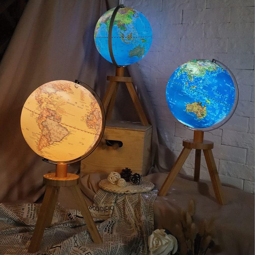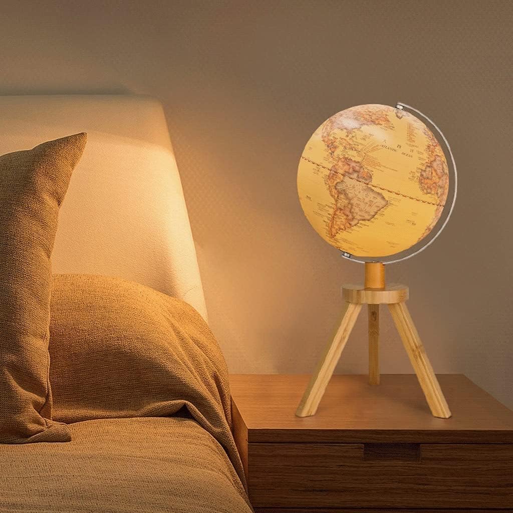 DESIGN ELEGANTE: i mappamondi antichi con base in legno e struttura in metallo sono perfetti per l'arredamento di casa e ufficio, aggiungendo un effetto educativo ed estetico alla camera da letto dei bambini, alla sala giochi della famiglia o al dormitorio per giovani adulti. Sicuro e inodore: il globo con base triangolare in legno, realizzato a mano, dal diametro di 25 cm è un ornamento creativo per la decorazione della scrivania, dell'ingresso, del soggiorno e della casa. Design 2 in 1: il globo terrestre luminoso è dotato di una luce LED controllata da un interruttore, quindi può essere trasformato in un bellissimo globo luminoso per studiare di notte Globo politico educativo: questo globo politico è stampato con mappe precise, che indicano chiaramente continenti, oceani, confini nazionali e politici e capitali. IL REGALO PERFETTO: questo mappamondo geografico di ispirazione antica è il regalo perfetto per i viaggiatori appassionati e costituisce il fulcro dell'arredamento della tua casa o come strumento didattico.