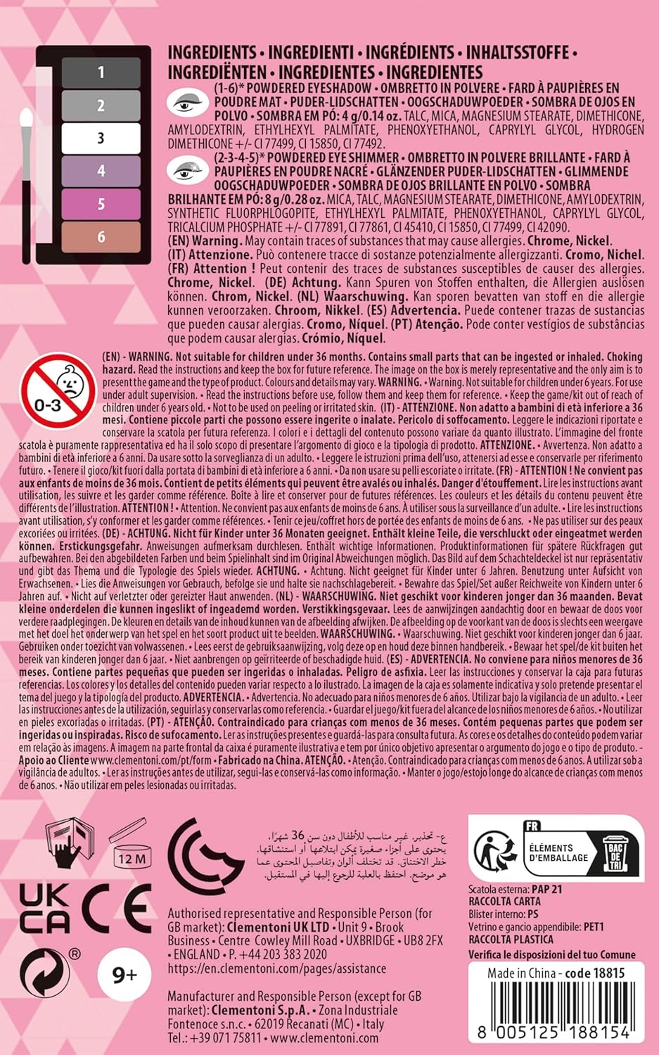 Una palette composta da 6 ombretti brillanti che si ispirano alle tendenze del momento La palette contiene 6 ombretti e un applicatore Una palette super chic da portare sempre con te per essere sempre alla moda! Il trucco è testato per un uso sicuro e può essere rimosso con acqua. Da 8 anni