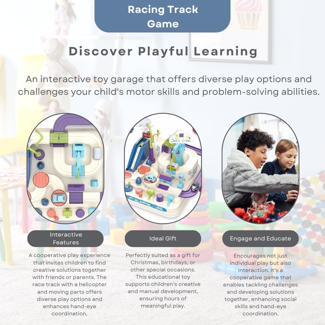 --> [SVILUPPO E APPRENDIMENTO] - Questo gioco Montessori ippodromo non solo promuove le capacità motorie del tuo bambino, ma migliora anche la capacità di risoluzione dei problemi. Con elementi interattivi e controllo manuale, è ideale per imparare giocosamente i principi fondamentali della fisica. garage auto bambini --> [SICUREZZA E QUALITÀ] - Realizzato in plastica ABS di alta qualità, il nostro giocattolo garantisce la massima sicurezza con bordi arrotondati, appositamente progettati per le mani piccole. La struttura robusta promette un divertimento duraturo. garage per bambini dai 3 anni, parcheggio in legno --> [COLORE E DESIGN] - Il design dai colori vivaci del nostro giocattolo per auto stimola la percezione dei colori e favorisce lo sviluppo visivo del bambino. Combinazioni di colori uniche rendono ogni sessione di gioco un'esperienza colorata. --> [DIVERTIMENTO INTERATTIVO] - Un'esperienza di gioco cooperativa che invita i bambini a trovare soluzioni creative insieme ad amici o genitori. L'ippodromo con elicottero e parti mobili offre molteplici possibilità di gioco e favorisce la coordinazione occhio-mano. Giocattolo per garage, garage in legno --> [Regalo ideale] - Perfetto come regalo per Natale, compleanni o altre occasioni speciali. Questo giocattolo educativo supporta lo sviluppo creativo e artigianale dei bambini e garantisce ore di divertimento significativo.