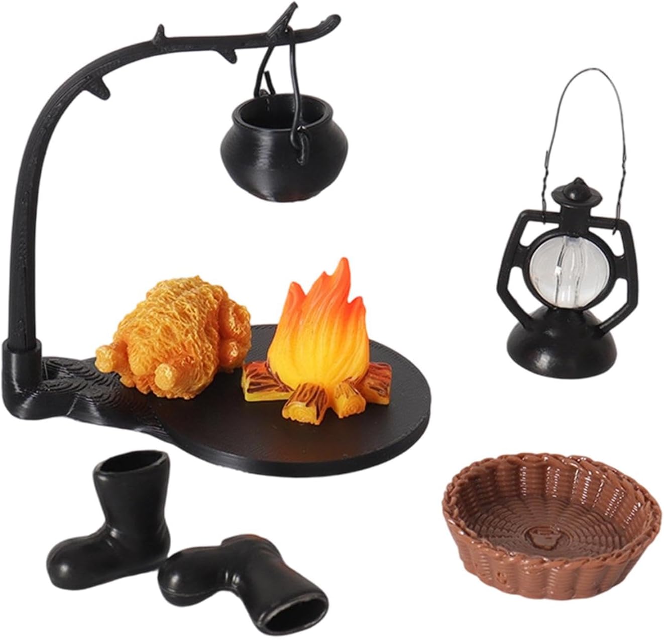 【Mini accessori da campeggio】: 1 set/11 pezzi di accessori da campeggio, set di decorazioni per case delle bambole, inclusi 2 cestini, 2 pentole, 1 supporto per fornello sospeso, 1 paio di scarpe, 1 luce, 1 fiamma, 1 pane, 1 pannocchia arrostita e 1 pollo arrosto 【Materiale di alta qualità】: accessori per la casa delle bambole in miniatura con stufa sospesa sono realizzati in PLA, resina e materiale PP di alta qualità, robusti e garantiscono un lungo utilizzo 【Accessori per la casa delle bambole】: Mini set da falò in miniatura, accessori per la casa delle bambole, con lavorazione e dettagli raffinati, realistico, una bella aggiunta alle decorazioni della casa delle bambole e agli oggetti di scena per la fotografia 【Ampie applicazioni】: i modelli di case delle bambole in miniatura sono adatti anche per decorazioni di micro paesaggi, modelli di scene in miniatura, decorazioni per giardini fatati, ecc. 【Ottimi regali】: ornamenti modello sono graziosi accessori per case delle bambole, oggetti di scena per foto e giocattoli di finzione per bambini, sono bei oggetti di scena per giochi fantasiosi e un'ottima scelta regalo