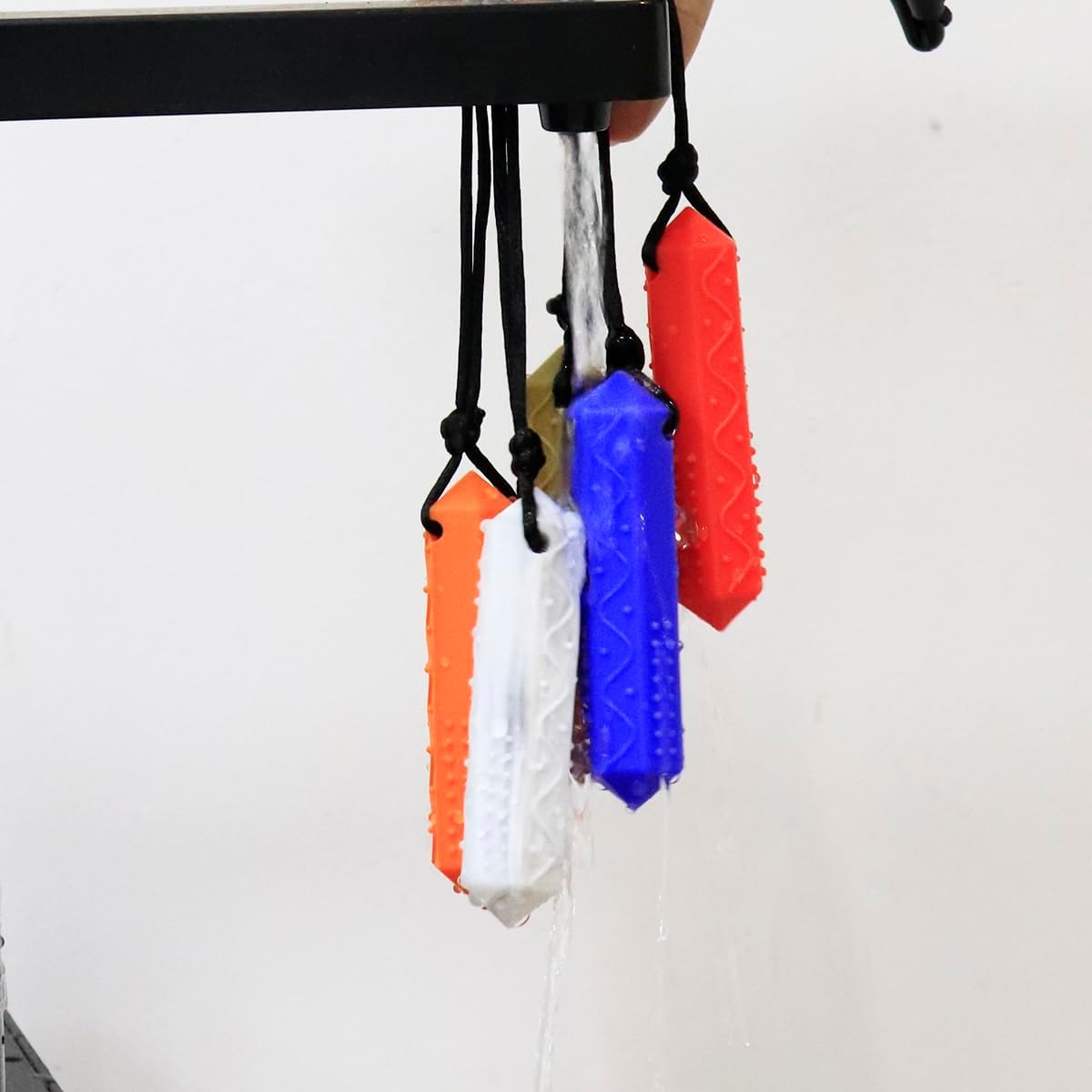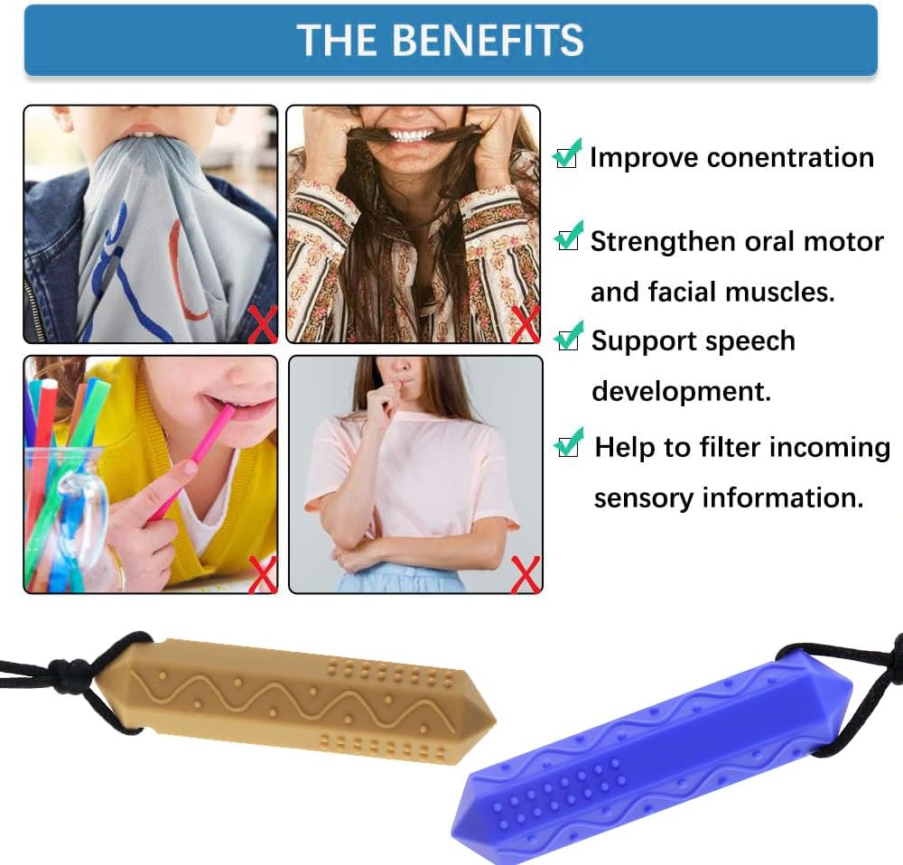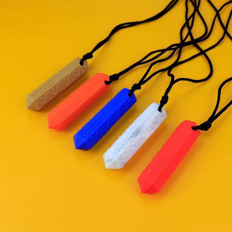 SICUREZZA: Realizzato in silicone alimentare, privo di BPA, non tossico e durevole per una masticazione sicura USO TERAPEUTICO: Efficace aiuto sensoriale per bambini con ADHD, autismo e coloro che necessitano di stimolazione orale DESIGN PRATICO: Collare regolabile con cordino robusto, facile da indossare e pulire per l'uso quotidiano VERSATILE: Adatto a bambini, neonati e adulti che necessitano di aiuto per la concentrazione o stimolazione sensoriale STRUTTURA OTTIMALE: Superficie strutturata appositamente progettata per fornire diversi livelli di resistenza alla masticazione
