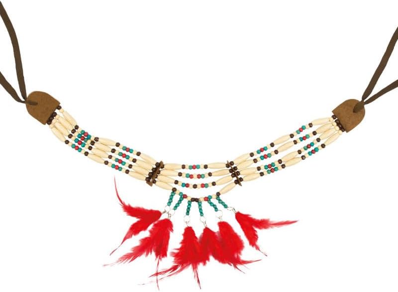 Descrizione del prodotto La collana indiana è composta da perline blu e crema e piume rosse. Avviso di sicurezza Utilizzare con cautela